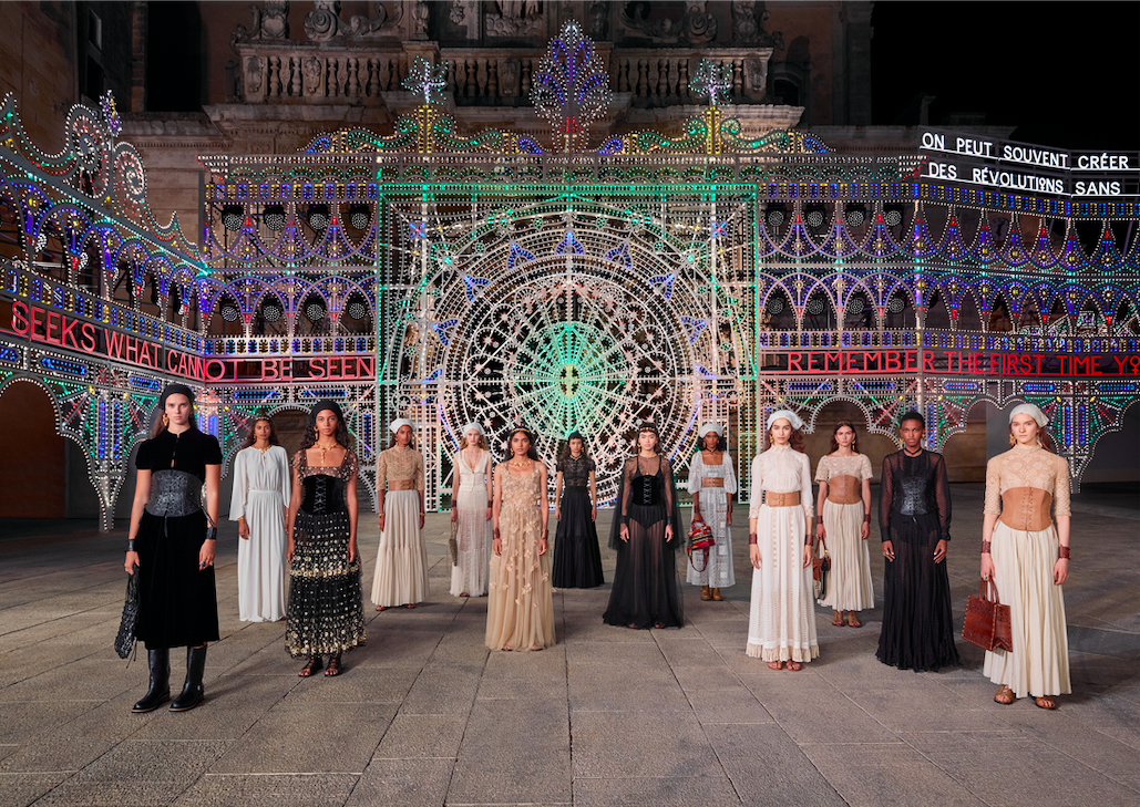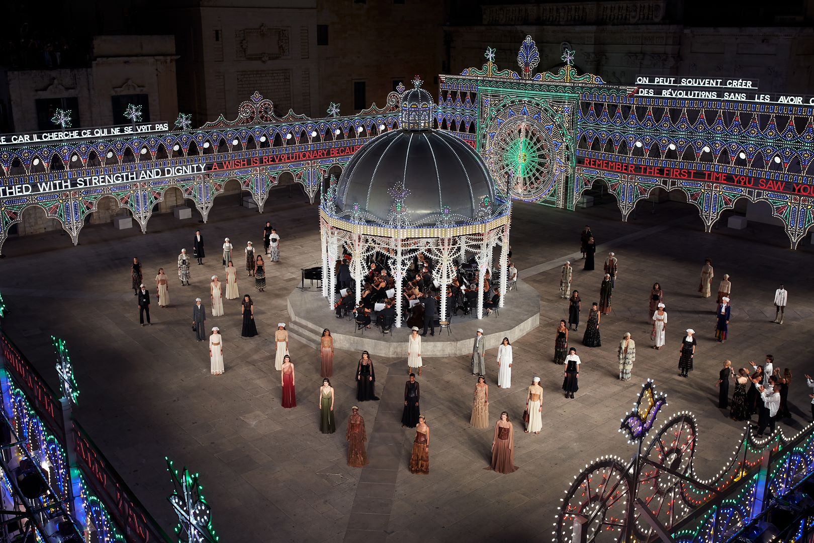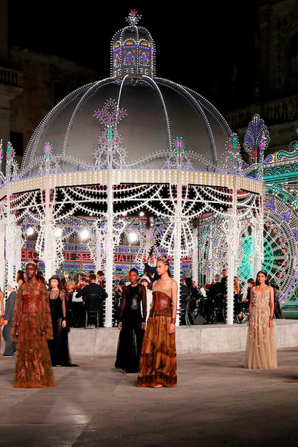 Così Maria Grazia Chiuri presenta l’inedita ed esclusiva sfilata Dior Cruise 2021, in un omaggio senza precedenti alla tradizione tessile e artigiana di un paese ricco di splendidi segreti. Lecce, luogo natale del padre della stessa Maria Grazia, ieri sera si è accesa a festa, proprio come è consuetudine fare durante le celebrazioni popolari. E di queste tradizioni non mancava proprio nulla all’appello: dall’arte della tessitura allo splendore delle Luminarie, dal ruolo centrale delladanza al potere della musica rituale, la Maison Dior ha trasformato una collezione in una meravigliosa ode ai paesaggi della Puglia e ai suoi costumi. L’importanza data agli artigiani locali, che anche in un momento incredibilmente difficile non hanno abbandonato il loro spirito di sacrificio e know-how inimitabile, è stata il fil rouge di una sfilata che, possiamo dire senza dubbi, non ha precedenti.