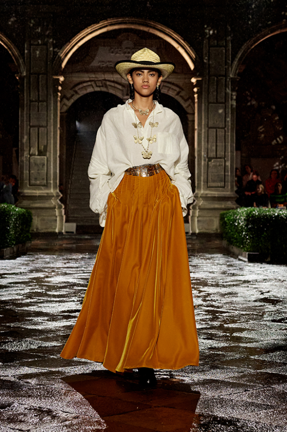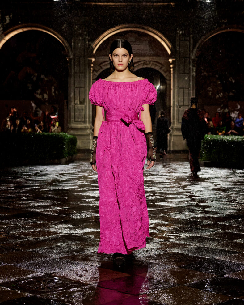 In questo caso, Dior ha scelto di sfilare a Città del Messico, un luogo che ha una storia significativa per la casa di moda. En effet, questa casa di moda ha una ricca storia di relazioni con questo luogo. Negli Anni ‘50, come dimenticare i primi abiti di Monsieur Dior, chiamati appunto ‘Mexico’, ‘Acapulco’, ‘Soirée à Mexico’ e ‘Mexique’?