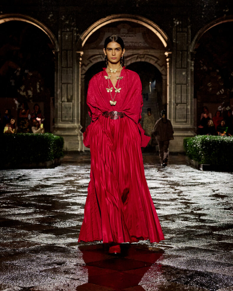 Per la sfilata Cruise 2024, Maria Grazia Chiuri ha voluto celebrare l’amore di Christian Dior per il Messico, creando uno spettacolo che onora le pratiche artigianali messicane, inclusa l’arte di Frida Kahlo. La cultura messicana ha ospitato l’arte surrealista di Leonora Carrington, Remedios Varo e Tina Modotti, ma è Frida Kahlo ad essere maggiormente celebrata. Il suo immaginario particolare rappresenta una libertà intellettuale, simboleggiata metaforicamente dalla farfalla e dagli abiti maschili indossati da Frida, che sfidavano le convenzioni di genere.