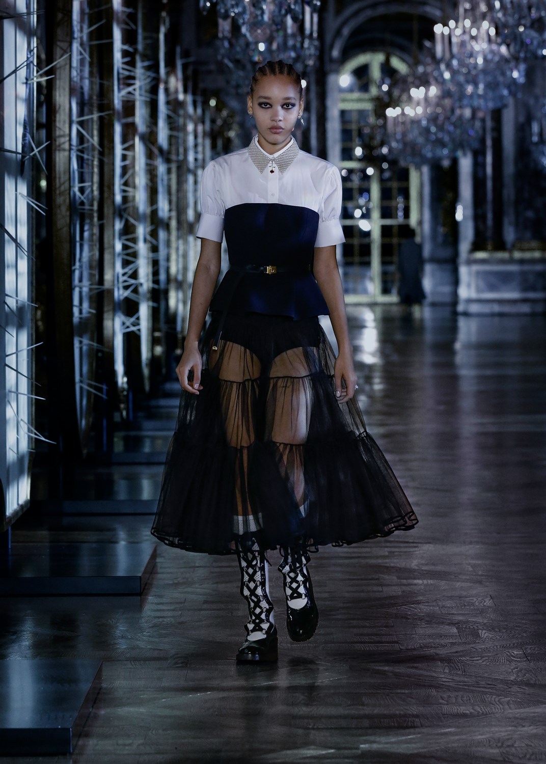 La Giacca Bar, iconica, non perde la sua forma originaria ma si reinventa adattandosi alle esigenze delle donne contemporanee con un cappuccio e pinces sui fianchi. I vestiti sono corti e da indossare a mo’ di grembiule, da cui si intravedono camicie con ruches e pizzi. Le gonne sono a ruota e mini oppure midi e a balze, gli abiti lunghi richiamano l’iconica forma a corolle per abbellirsi di tulle colorati ed elementi oversize come fiocchi, colletti e cuori. I tailleur sono classici e in tweed e ammiccano agli anni ’50, in contrasto con i capispalla costituiti da anorak in nylon riciclato, cappotti in cashmere upcycled e giubbotti in montone maculato nel più amato grigio Dior. Gli accessori giocano con scarpe pump con tacco, collane-colletto di microperline e la già amatissima borsa Parisienne che Maria Grazia Chiuri ha ridisegnato a partire dalla Babe. Una favola , che rende tutte principesse sì, ma incredibilmente contemporanee.