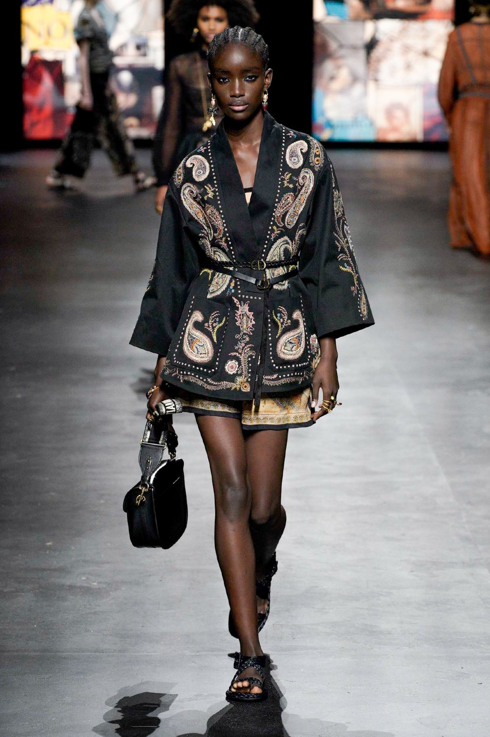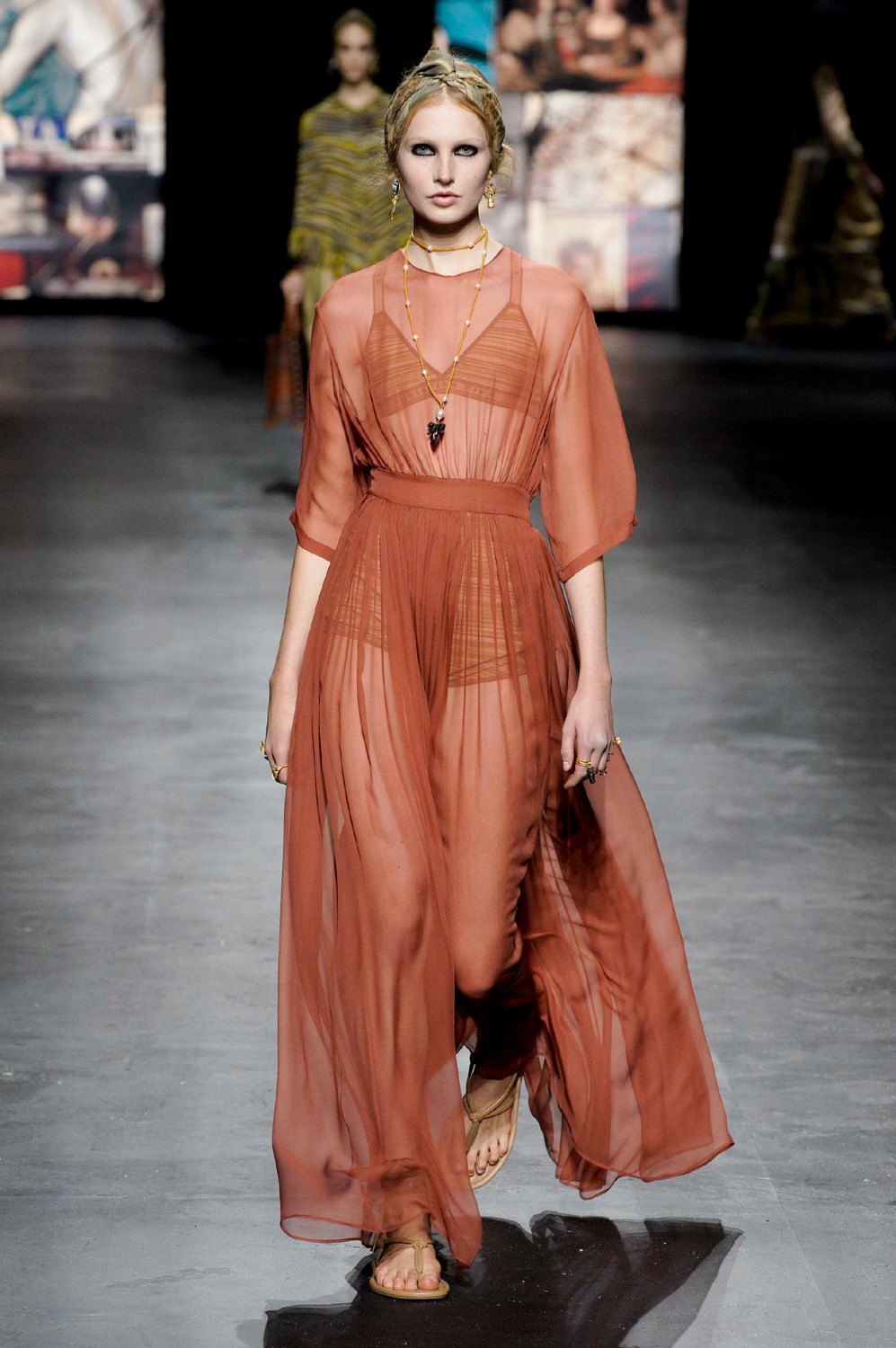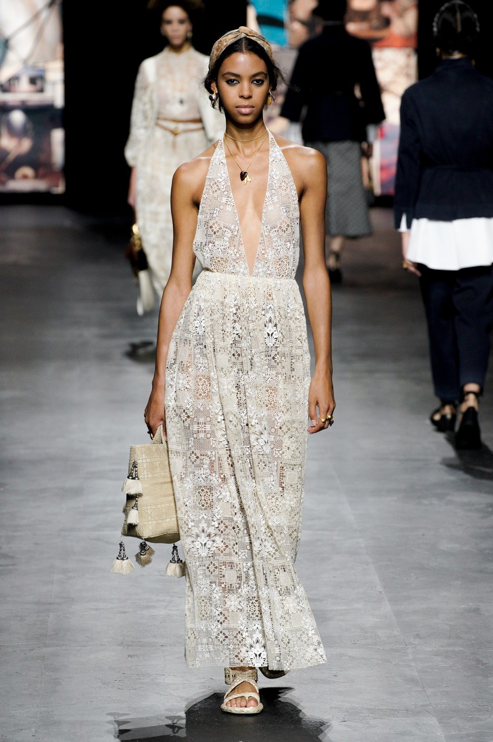 A sfilare assieme ad accostamenti insoliti e nuovi, i capi d’archivio che hanno scritto la storia di Dior. La Bar Jacket è una grande protagonista su gonne a ruota e pantaloni dal taglio maschile, dotata questa volta di lacci che la rendono incredibilmente versatile e adatta alle più svariate esigenze di stile. Lo chemisier viene ancora una volta celebrato diventando la quintessenza del comfort e compiendo una metamorfosi che lo trasforma da camicia a tunica ad abito. I capispalla sono over dalla forma a kimono e tessuto jacquard per le versioni da sera, in panno e lana per i look da tutti i giorni.