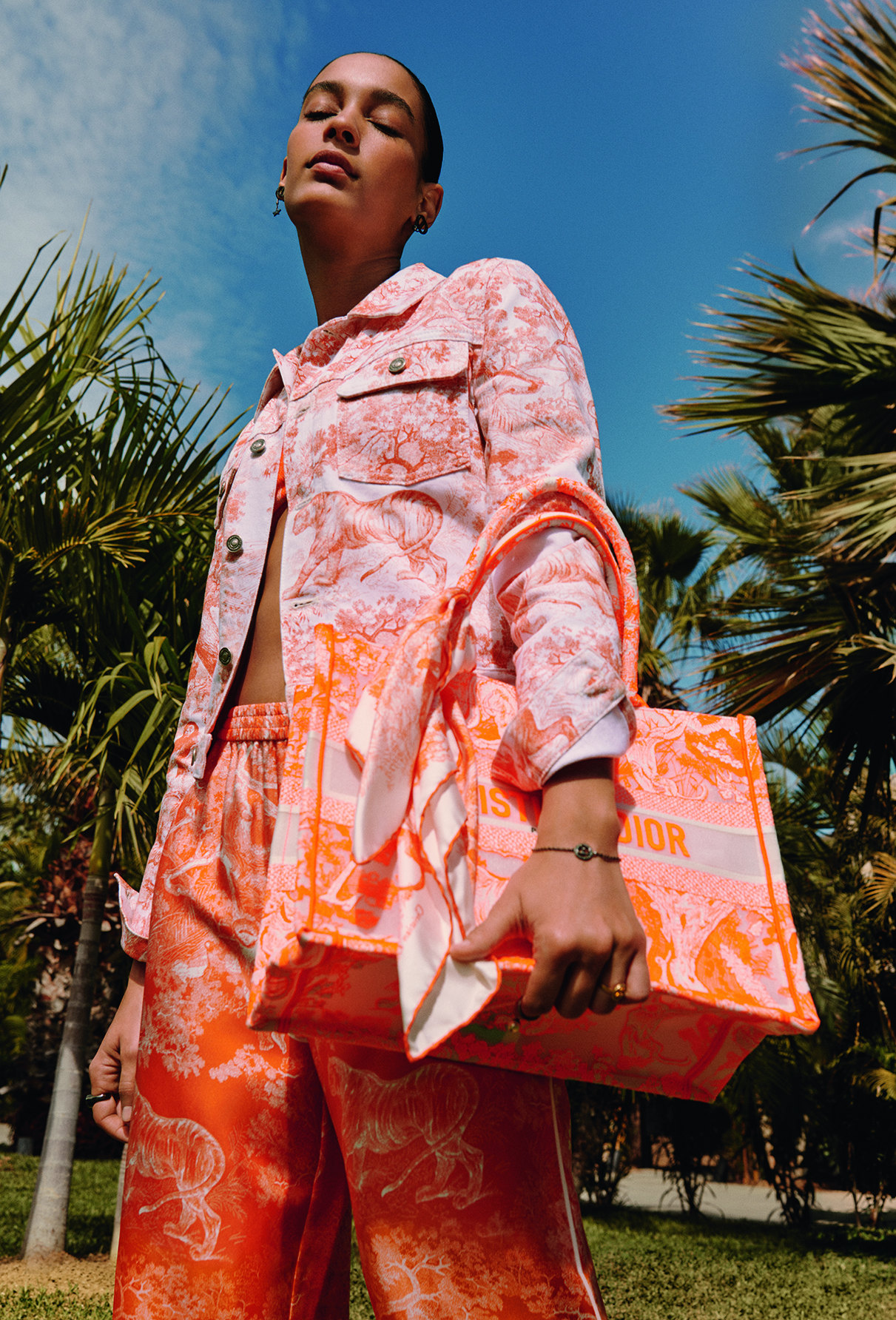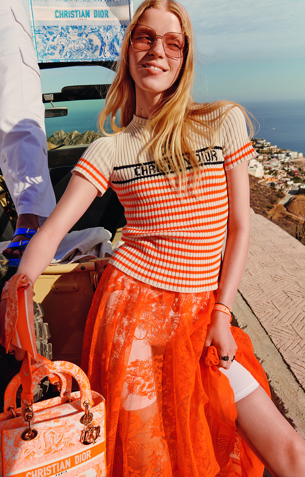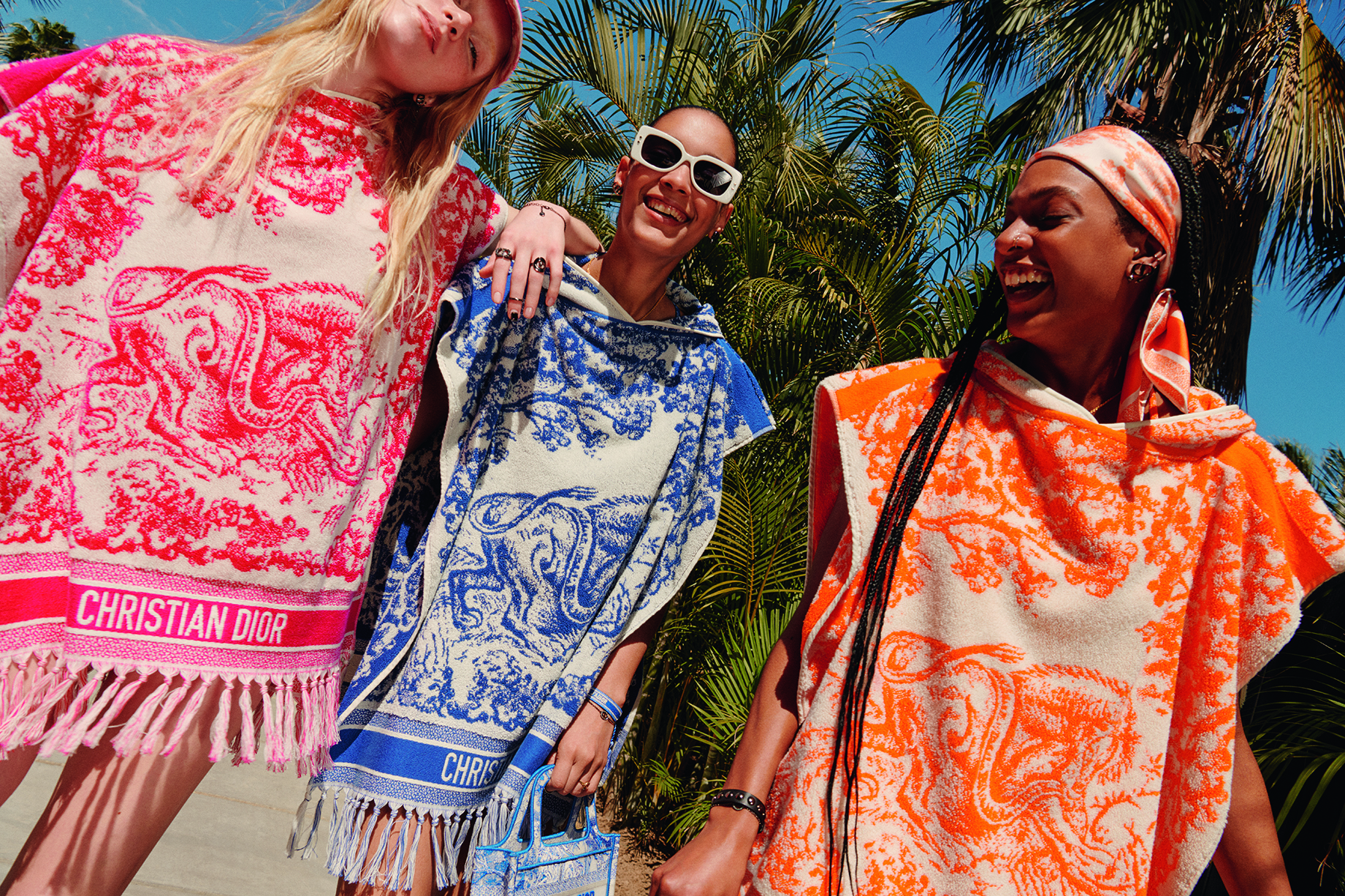La capsule collection estiva Dioriviera, disegnata da Maria Grazia Chiuri e reinventata costantemente, è un meraviglioso invito al viaggio. Giocando con i codici fondamentali della Maison – dalla toile de Jouy alle righe Bayadère – il prêt-à-porter della collezione, la pelletteria e le scarpe sono illuminate da sfumature fluorescenti ispirate alla linea Autunno 2022, come blu, arancio e rosa.