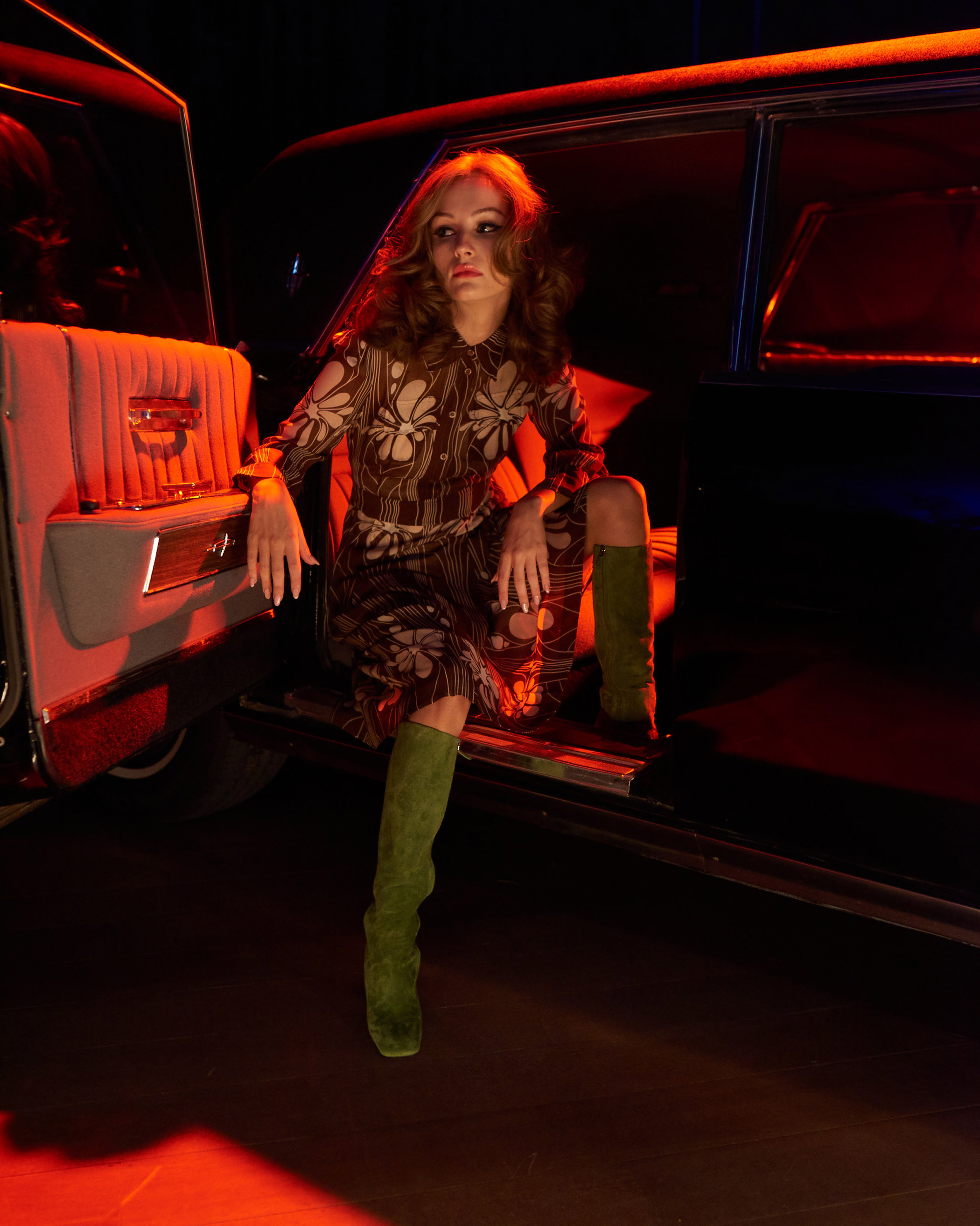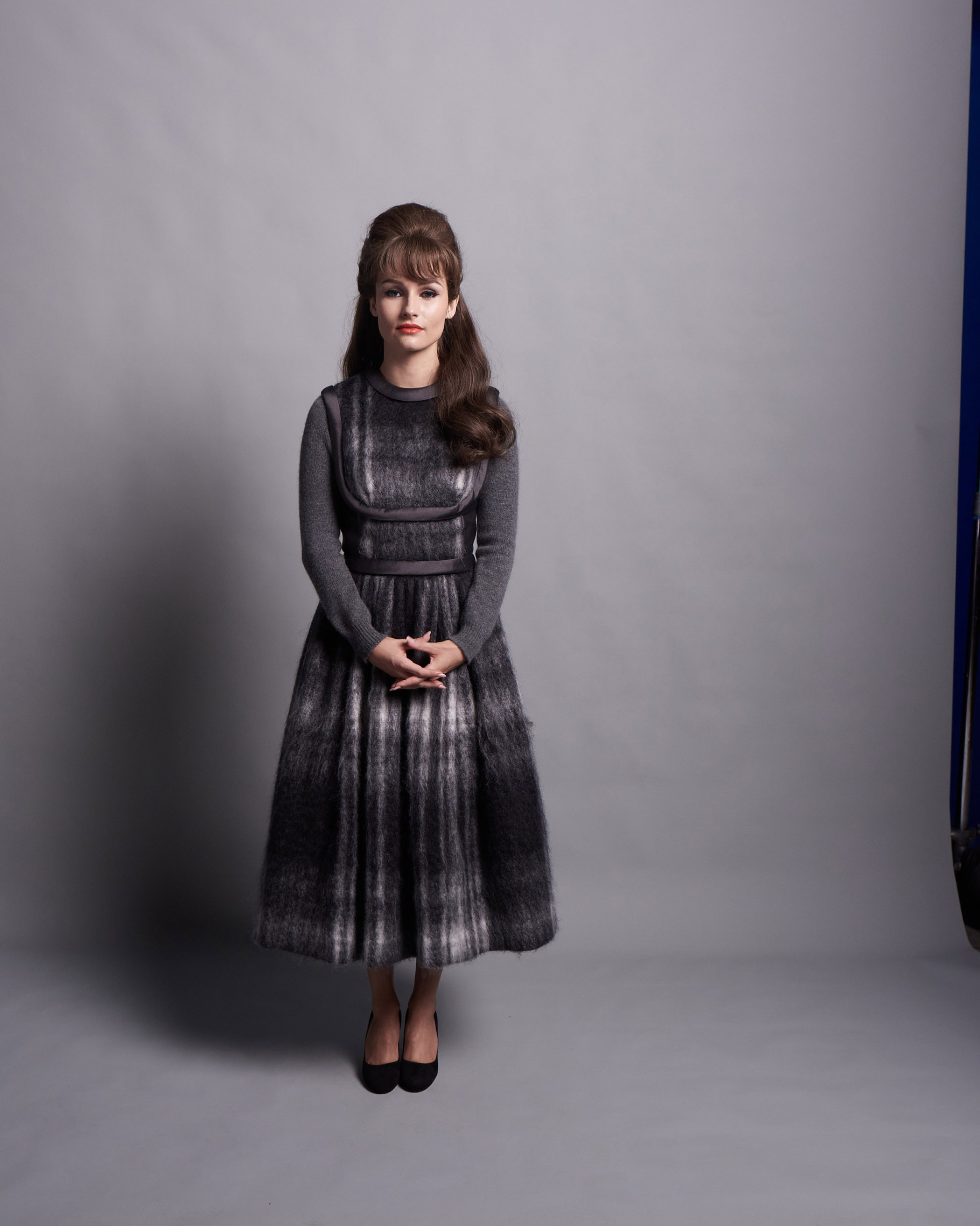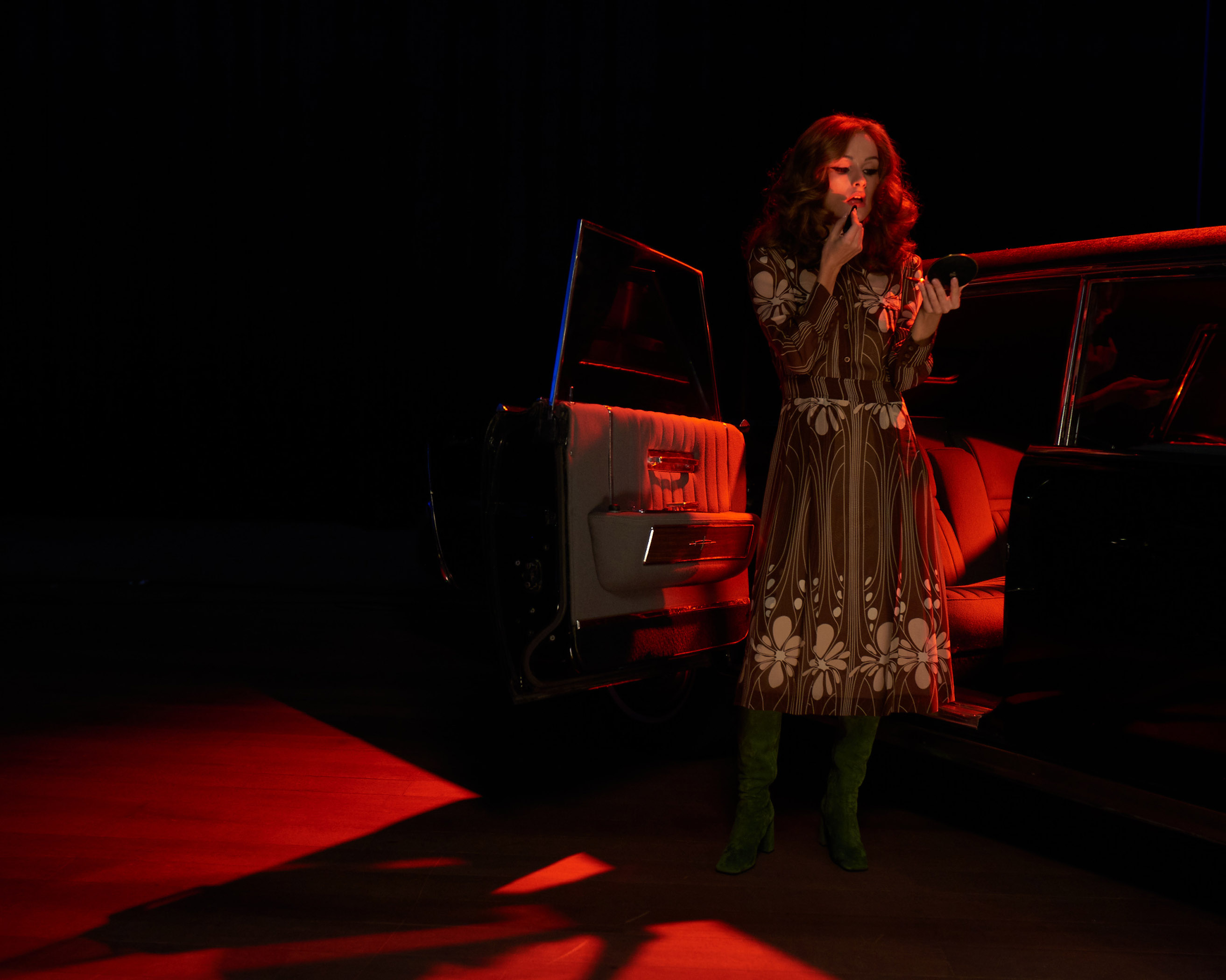 Anche Prada ha guardato spesso a quegli anni e al loro panorama culturale, animato da uno spirito rivoluzionario e dall’aspirazione alla libertà, per offrirne un’interpretazione estetica originale. Attraverso lo stesso sguardo vengono reinventati per il film alcuni outfit autentici di Priscilla, come l’abito in tweed portato sopra il maglione in mohair e completato dalla giacca in suede marrone, indossato allo speciale su Elvis della NBC .
