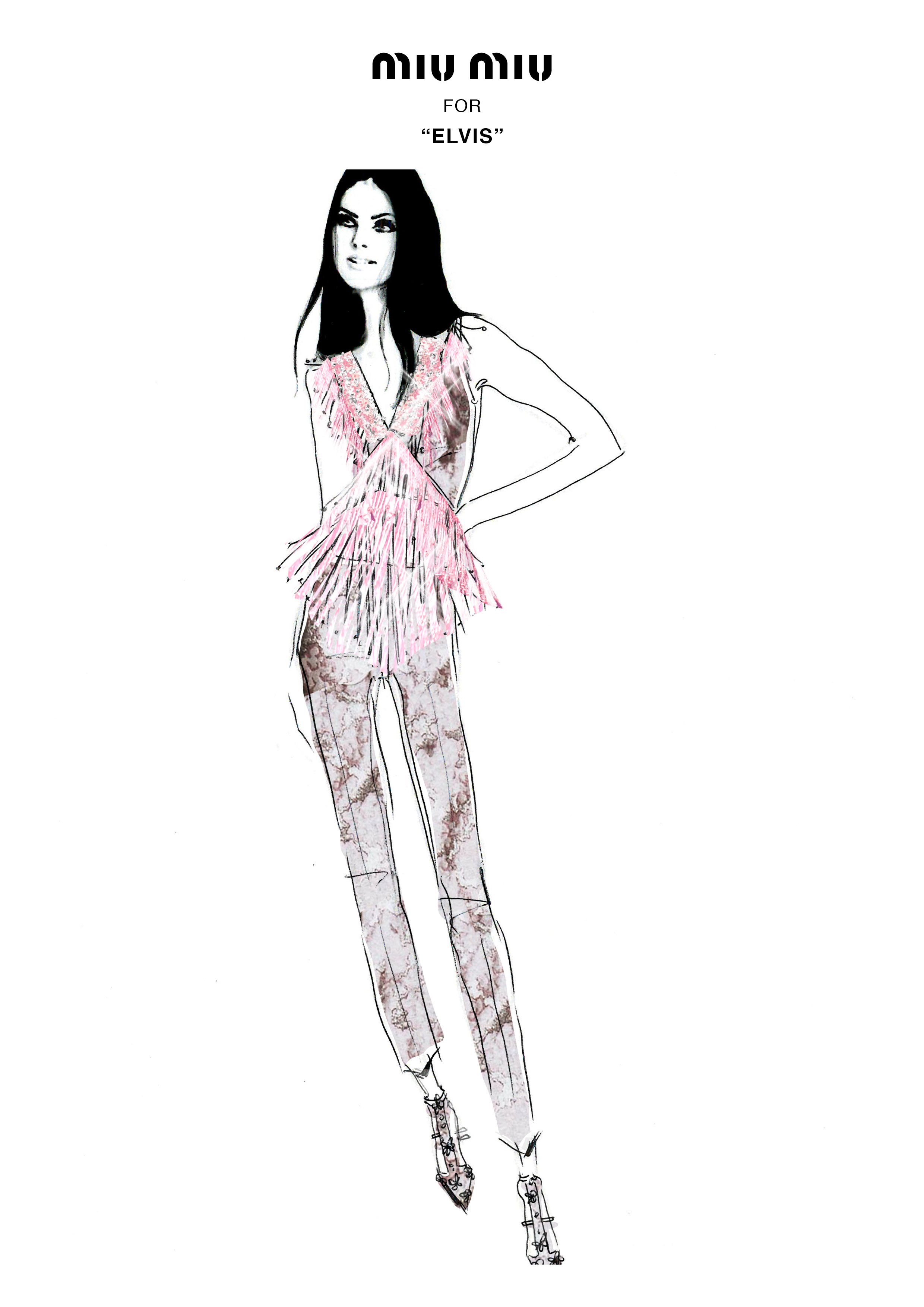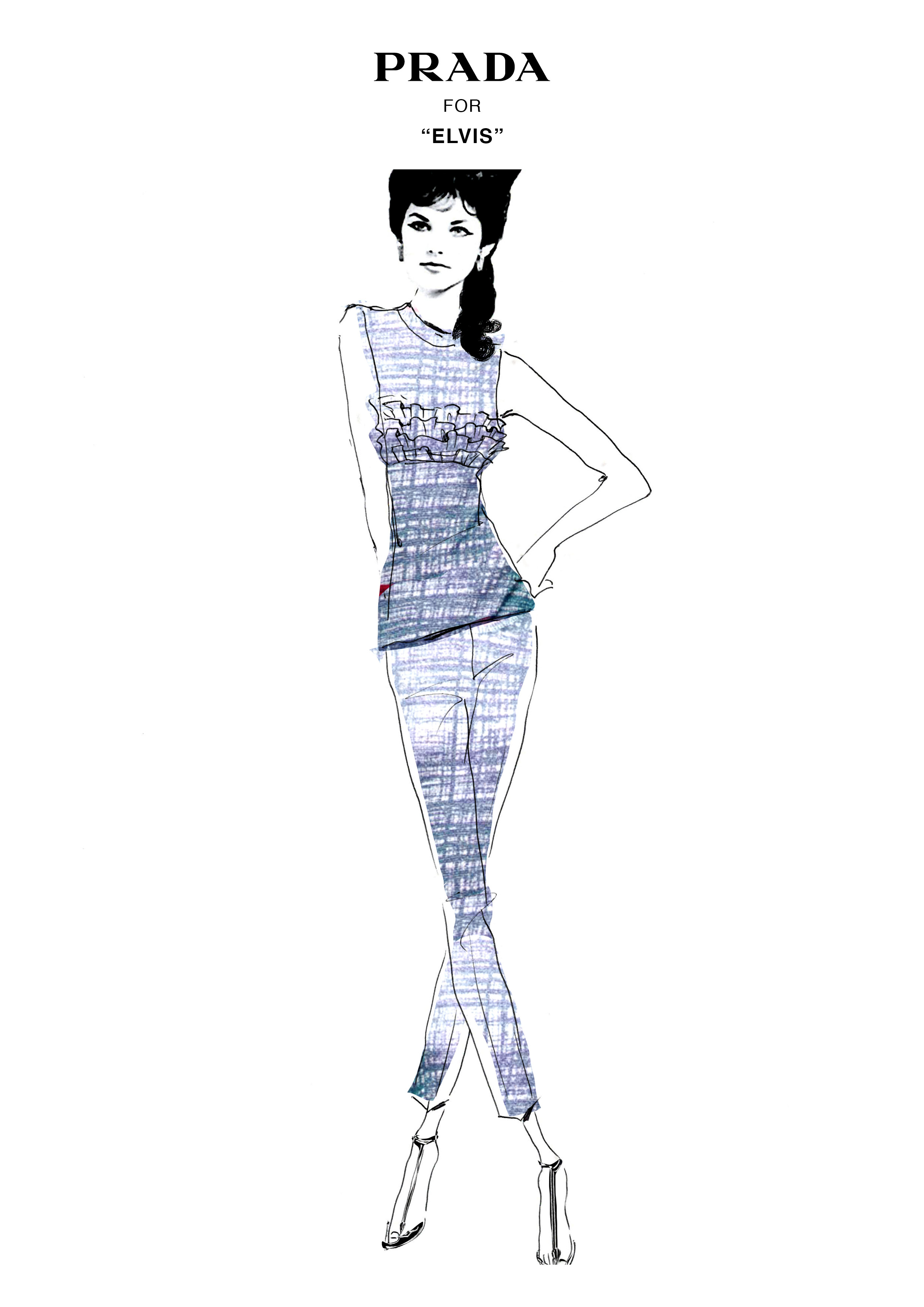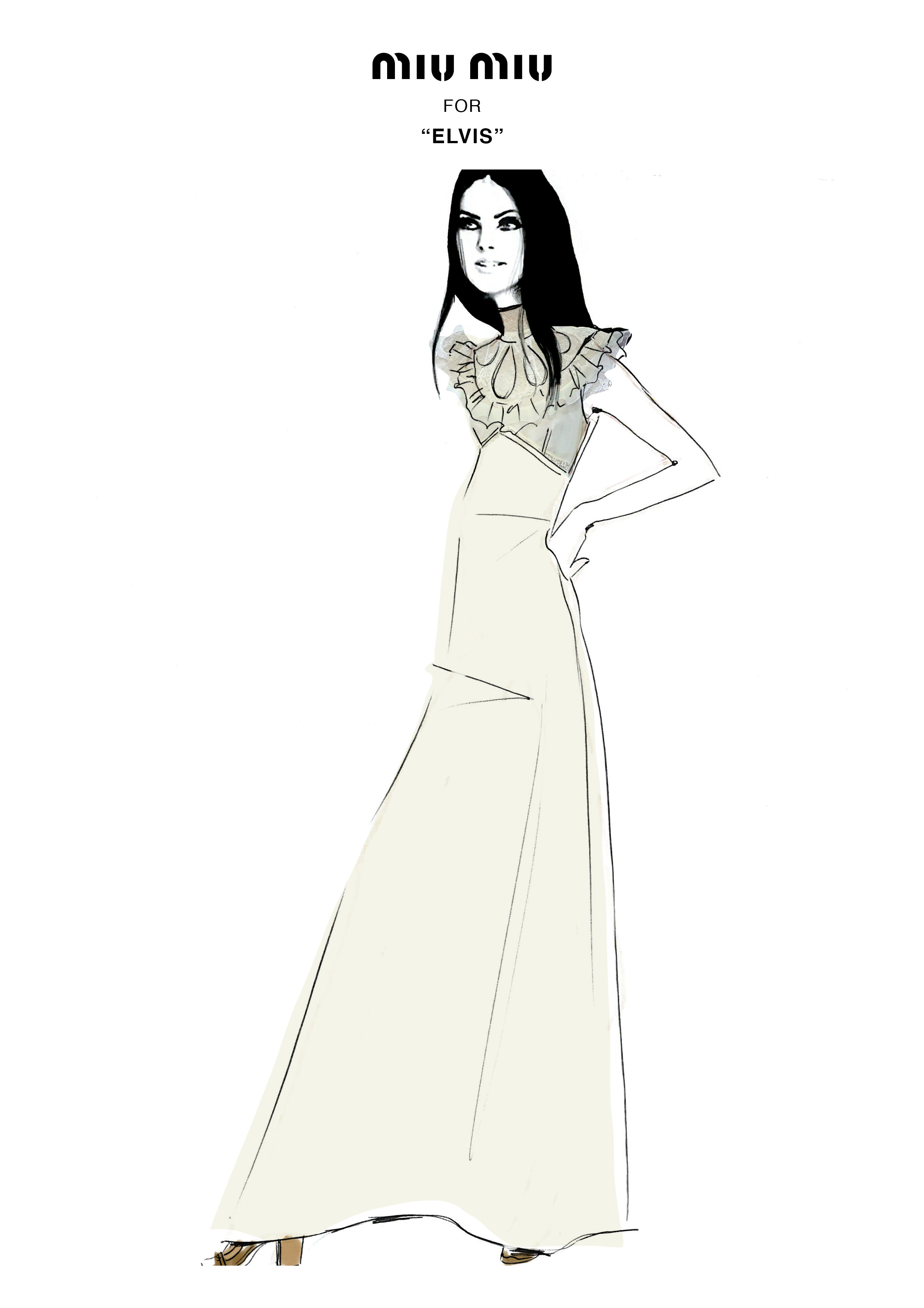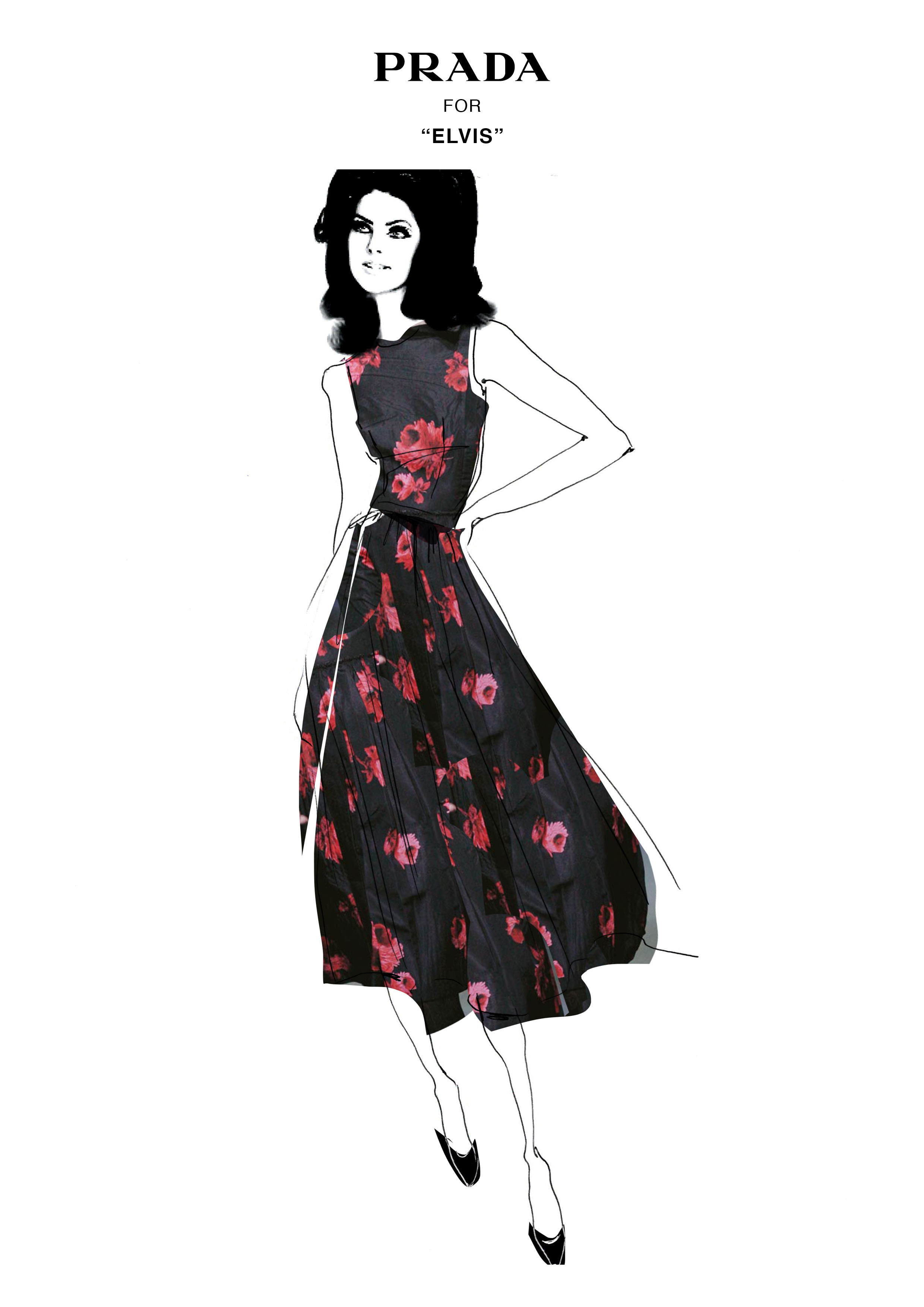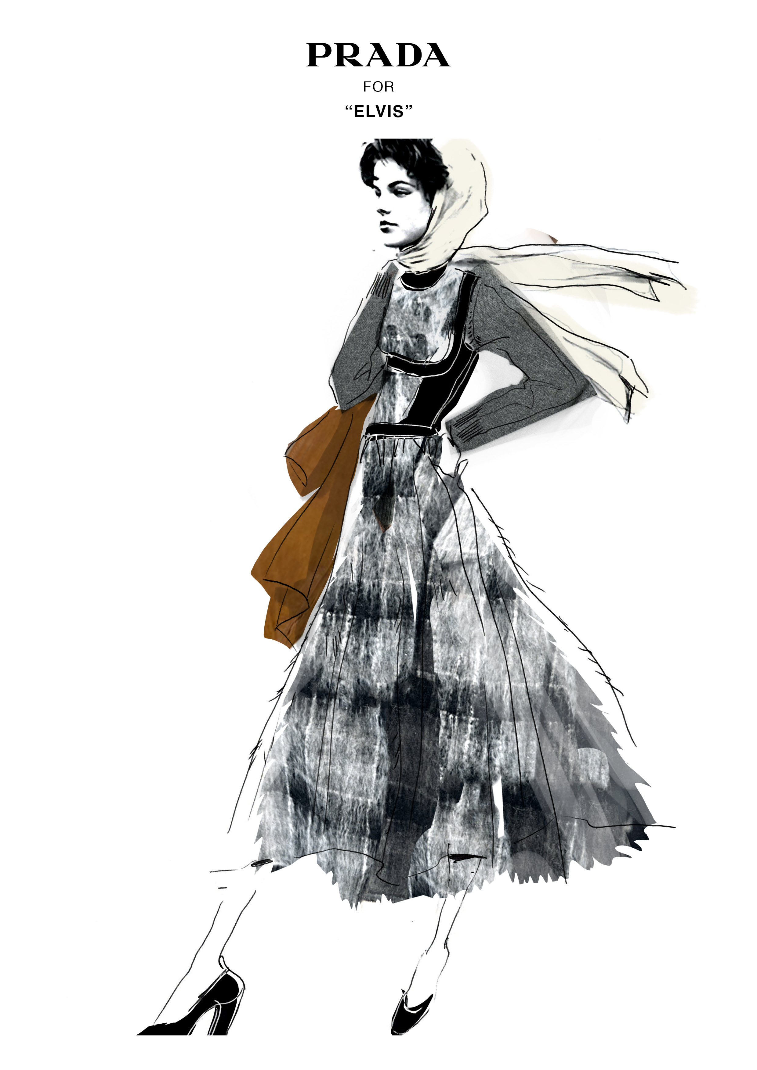 “Al centro di Elvis c’è la leggendaria storia d’amore tra Elvis e Priscilla. La bellezza e lo stile iconico di Priscilla Presley hanno segnato indelebilmente la cultura contemporanea: per Baz come per me era importante rimanere fedeli a questa eredità non semplicemente imitando gli abiti che Priscilla ha indossato, ma trovando un modo moderno per creare una connessione tra il pubblico di oggi e il suo stile epocale. Per noi è stato meraviglioso collaborare di nuovo con Miuccia. Ci siamo immersi negli archivi di Prada e Miu Miu, all’interno dei loro atelier di assoluta eccellenza, per compiere un percorso di traduzione dagli abiti storici della signora Presley ai costumi che sarebbero poi apparsi nel film.” ha dichiarato Catherine Martin.