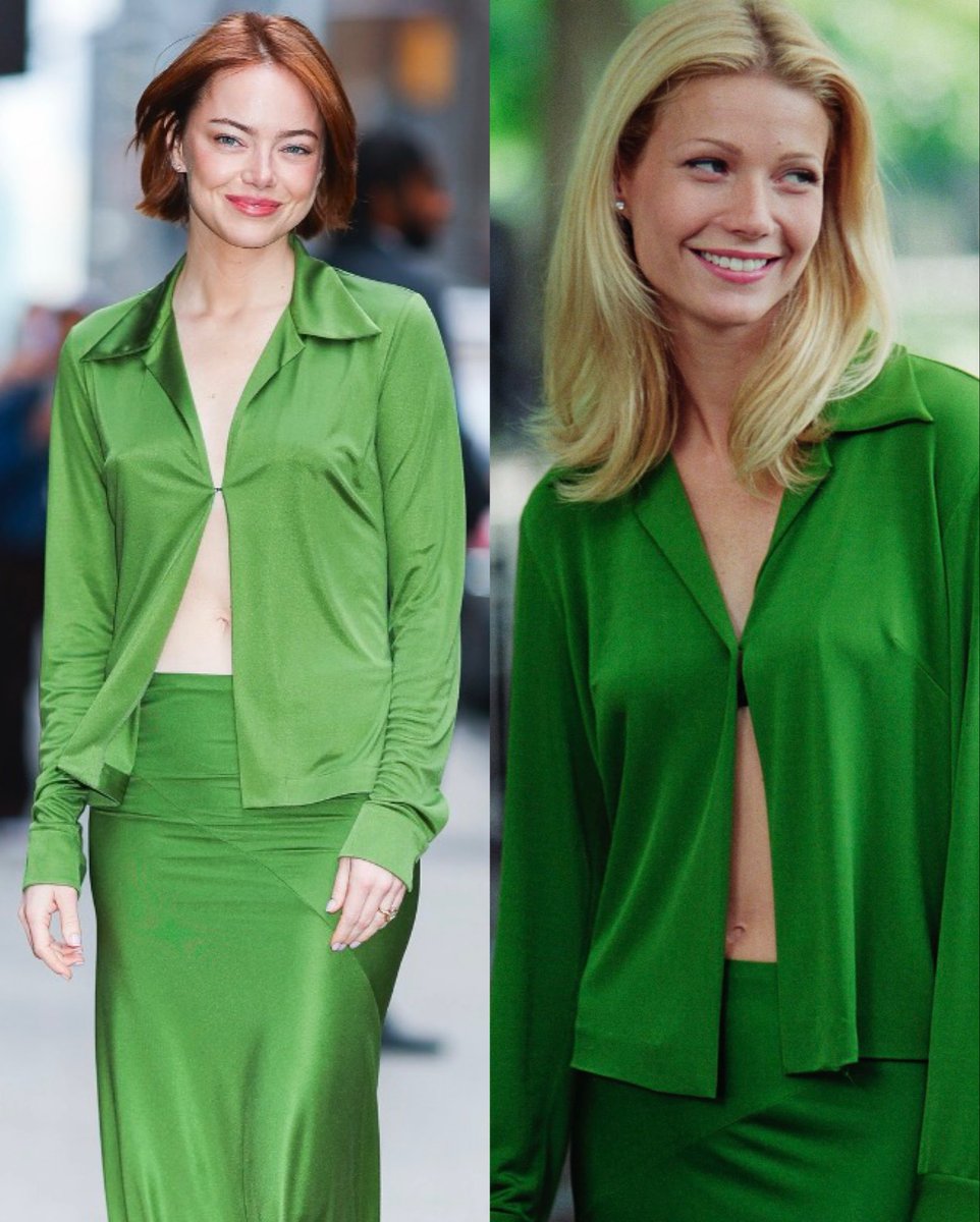 Lo scorso 22 ottobre 2025, Emma Stone è stata avvistata a Midtown Manhattan, in arrivo al The Late Show with Stephen Colbert, con un completo verde smeraldo Donna Karan originale Spring/Summer 1996. Un due pezzi in seta composto da top con allacciatura frontale e gonna bias cut, ripreso quasi alla perfezione dalla versione resa leggendaria sul grande schermo.