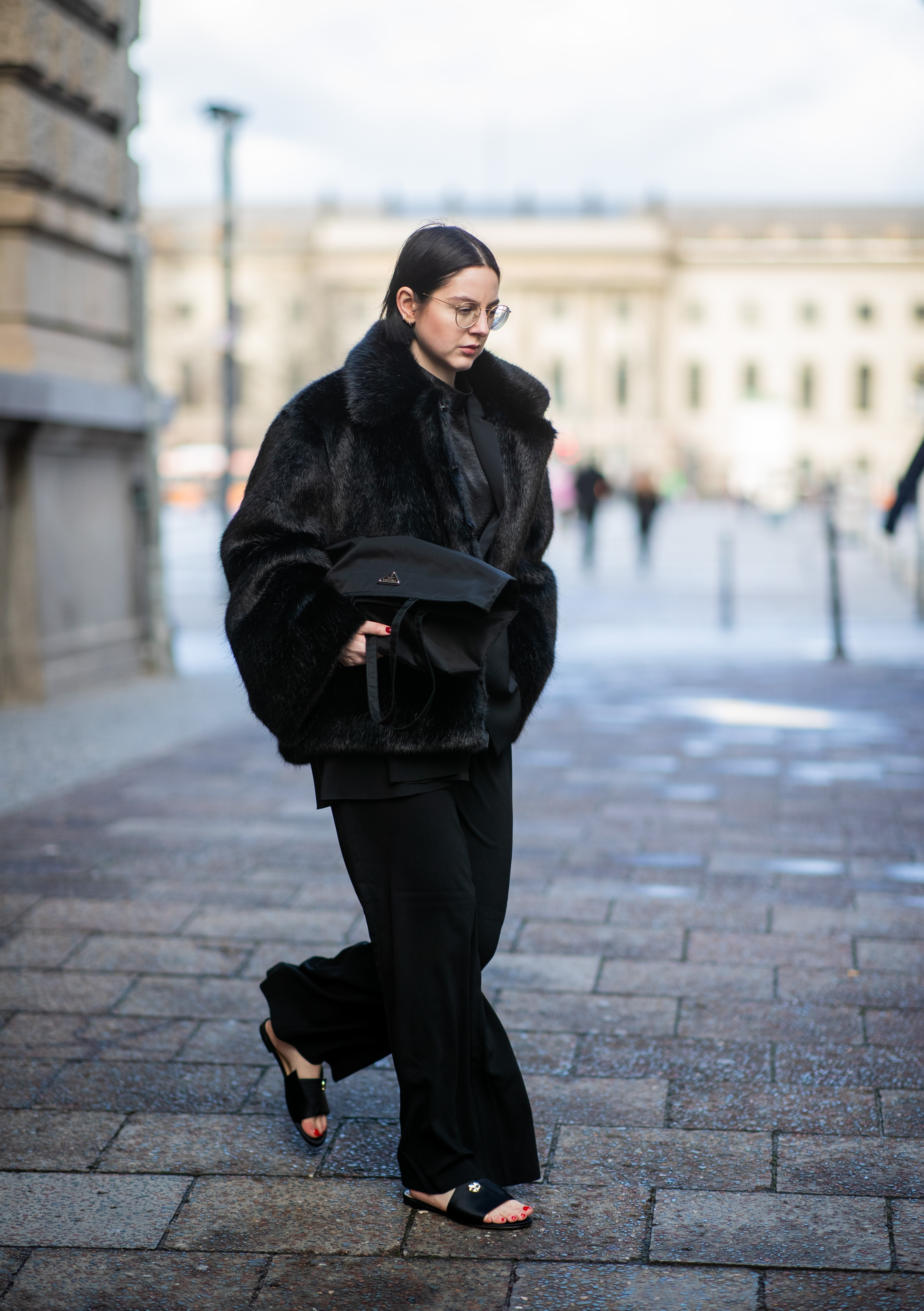 - BERLIN, GERMANY – JANUARY 17: Maria Barteczko is seen wearing black faux fur jacket Toteme, black silk blazer COS, black turtleneck top Balenciaga, black wide leg pants The Row, black satin slides March & Muse, black nylon shopper Prada during the Berlin Fashion Week Autumn/Winter 2019 on January 17, 2019 in Berlin, Germany. (Photo by Christian Vierig/Getty Images)