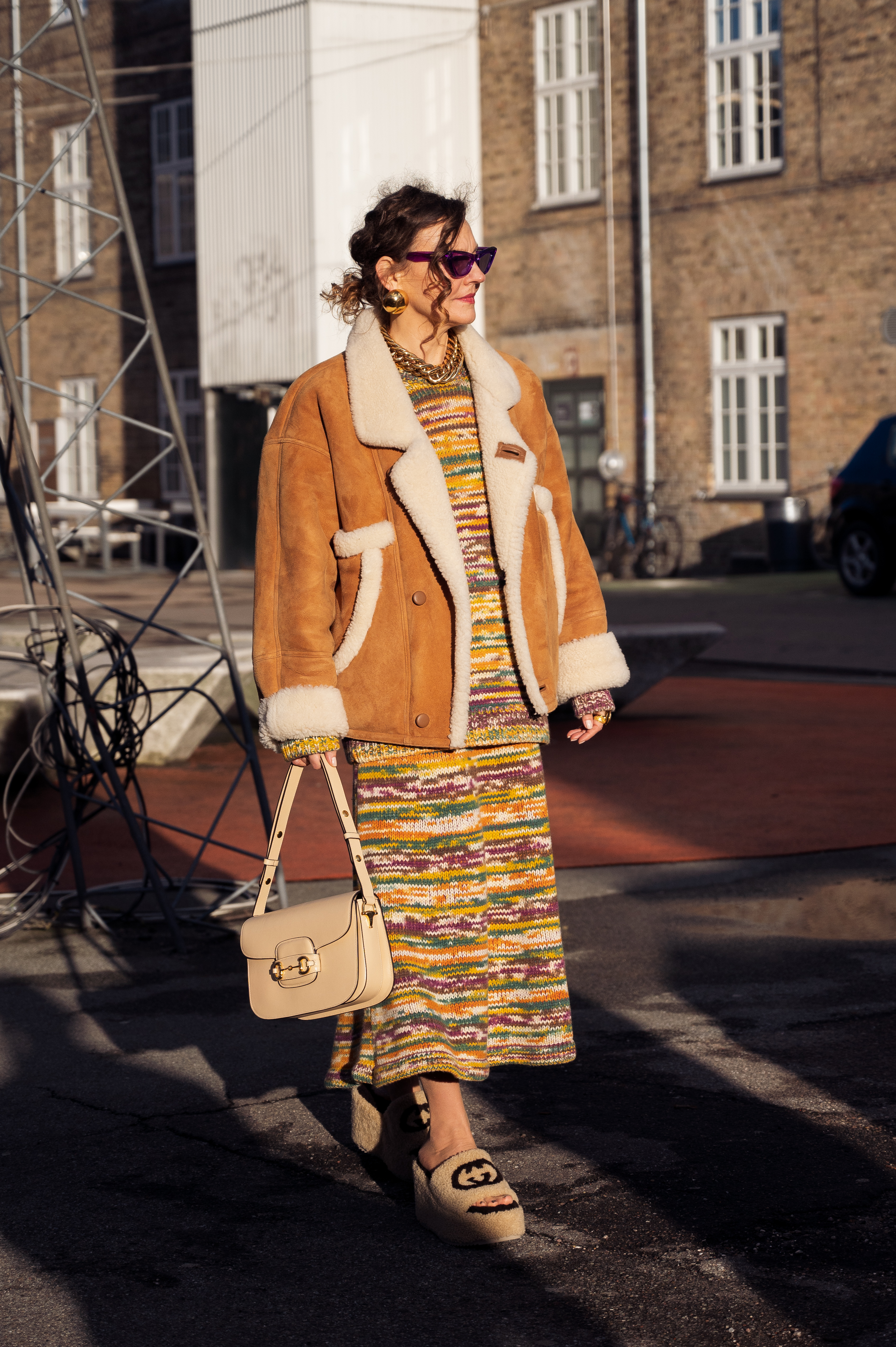 - COPENHAGEN, DENMARK – FEBRUARY 02: Renia Jaz wearing knitted dress, beige bag, brown jacket and beige Gucci slide sandals outside Day Birger et Mikkelsen in Copenhagen fashion week Autumn/Winter 2022 on February 02, 2022 in Copenhagen, Denmark. (Photo by Raimonda Kulikauskiene/Getty Images)