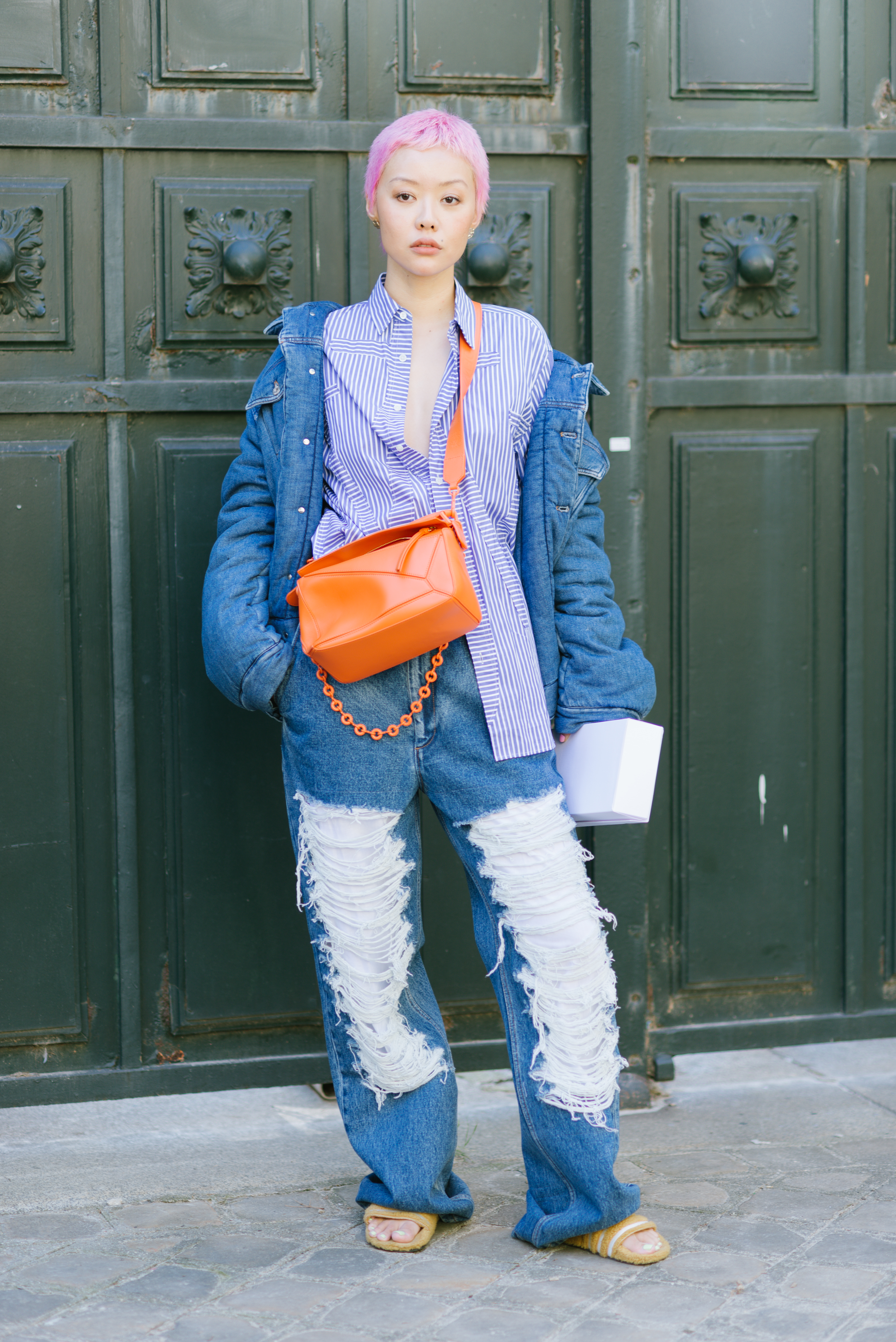 - PARIS, FRANCE – SEPTEMBER 30: A guest poses wearing a denim puffer jacket and Loewe orange puzzle bag after the Loewe show at the Garde Republicaine during Paris Fashion Week – Womenswear Spring/Summer 2023 on September 30, 2022 in Paris, France. (Photo by Vanni Bassetti/Getty Images)