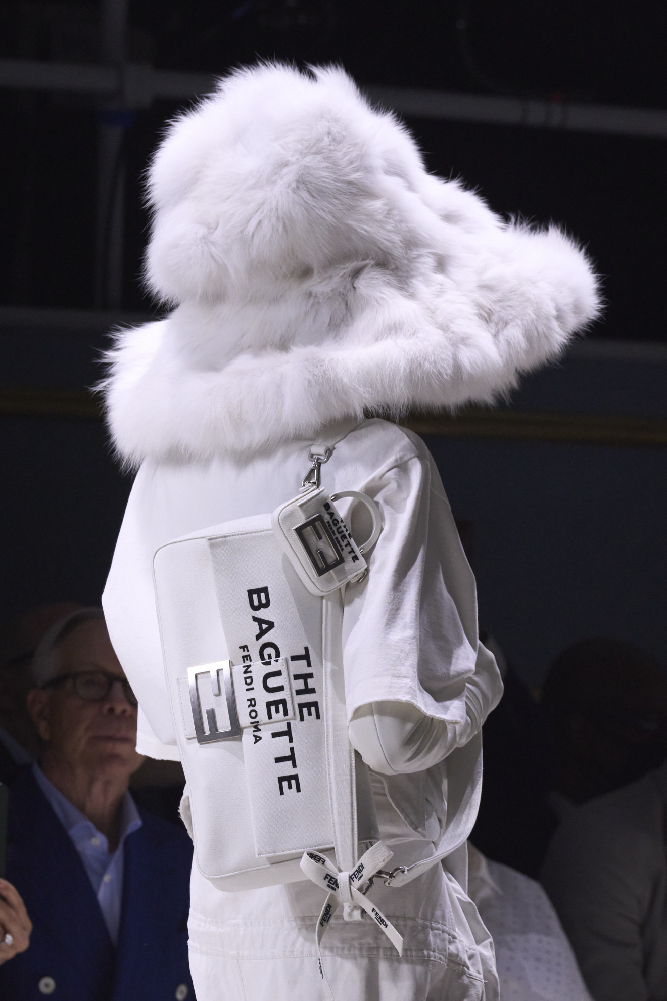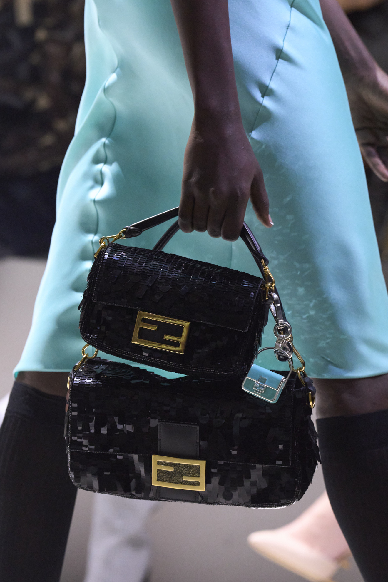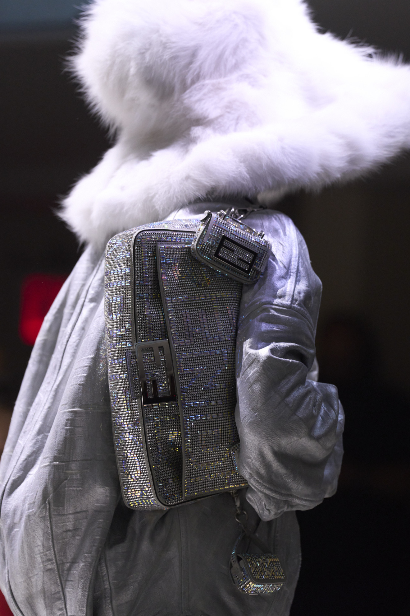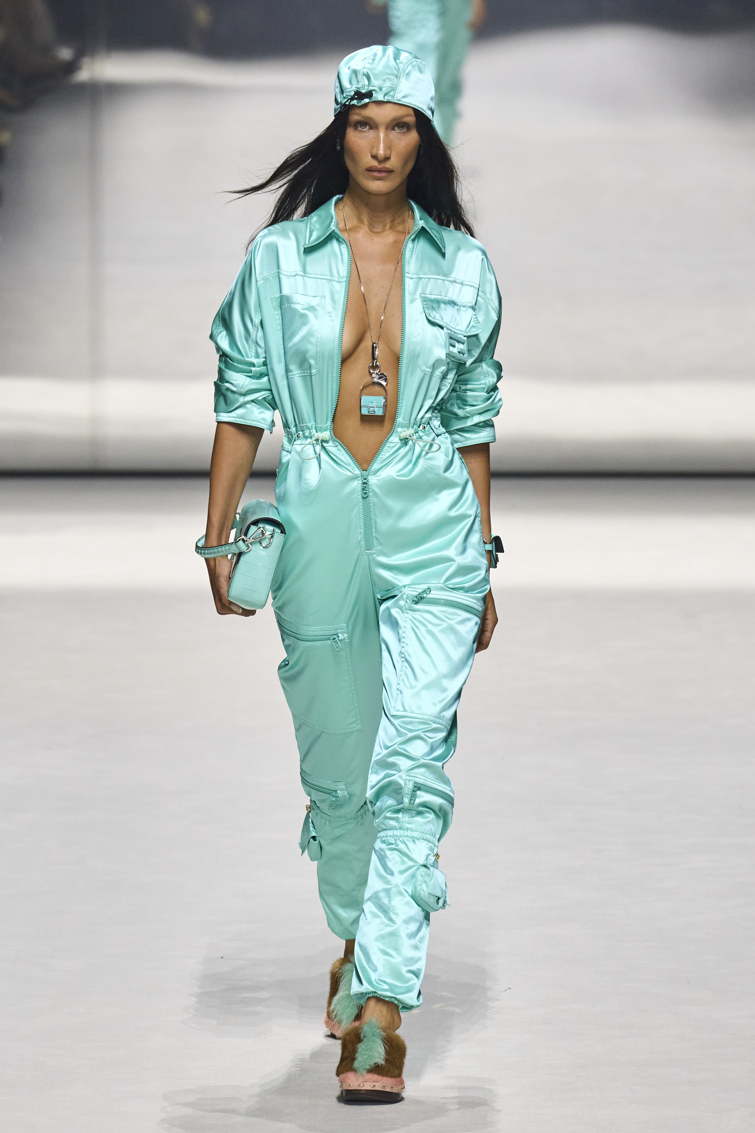 A concludere la sfilata una meravigliosa ed inossidabile Linda Evangelista, icona assoluta degli anni ‘90, avvolta in una lussuosissima mantella color Tiffany. Non a caso Fendi, per questa sfilata, ha collaborato anche con Tiffany & Co. – entrambe le case della famiglia LVMH -, l’intramontabile eccellenza della maison di gioielli è stata scelta per realizzare versioni più preziose della borsa di punta di Fendi. Tra le tante in passerella, abbiamo adorato il dettaglio del preziosissimo logo con doppia F sulla Baguette in coccodrillo indossata da Bella Hadid. Tiffany reimmagina la Baguette nella sua versione più lussuosa. Argento, smalto, coccodrillo, oro bianco e diamanti.