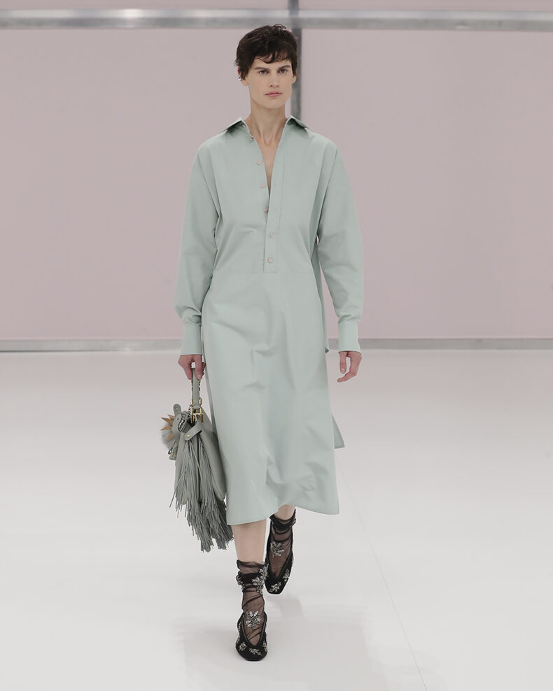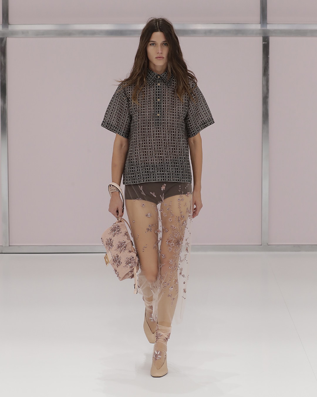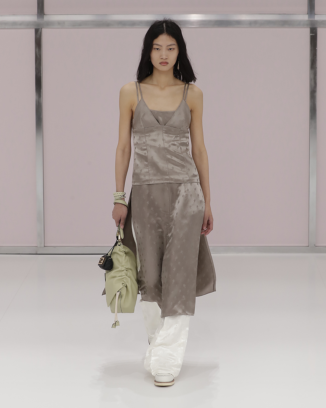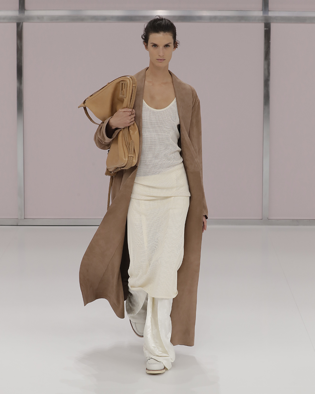 La sfilata ha visto abiti a vita bassa in chiffon, impreziositi da motivi Art Déco, con silhouette che richiamavano sia gli Anni ’20 che gli abiti sottoveste degli Anni ’90. Jones ha saputo mescolare elementi tradizionali con tocchi contemporanei, come accappatoi in shearling beige, T-shirt e gonne in coccodrillo bianco, e un gilet in rete rifinito con il caratteristico Cuoio Romano di Fendi.
