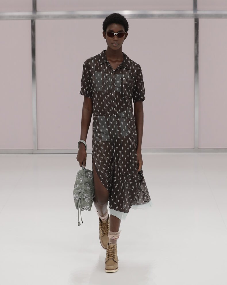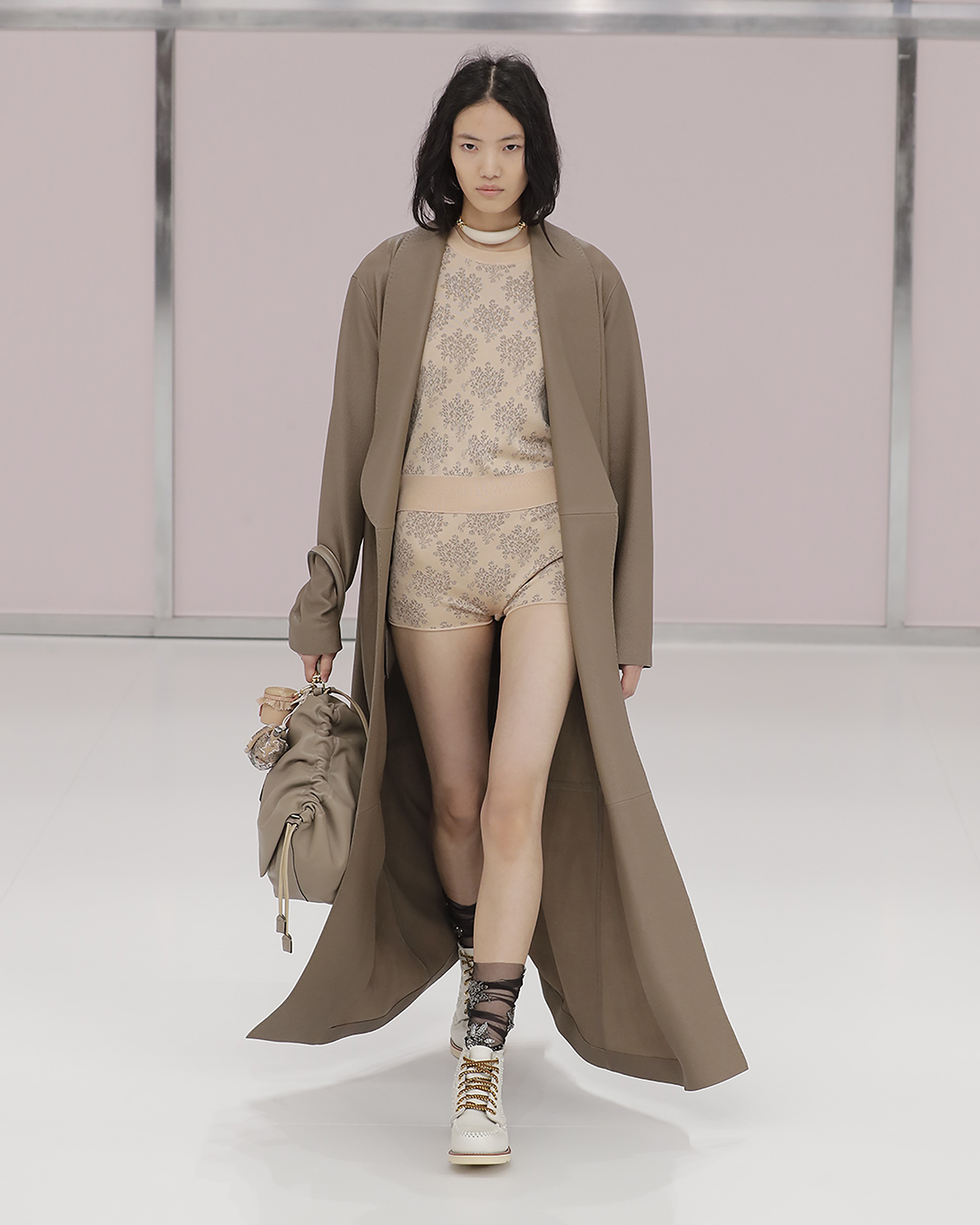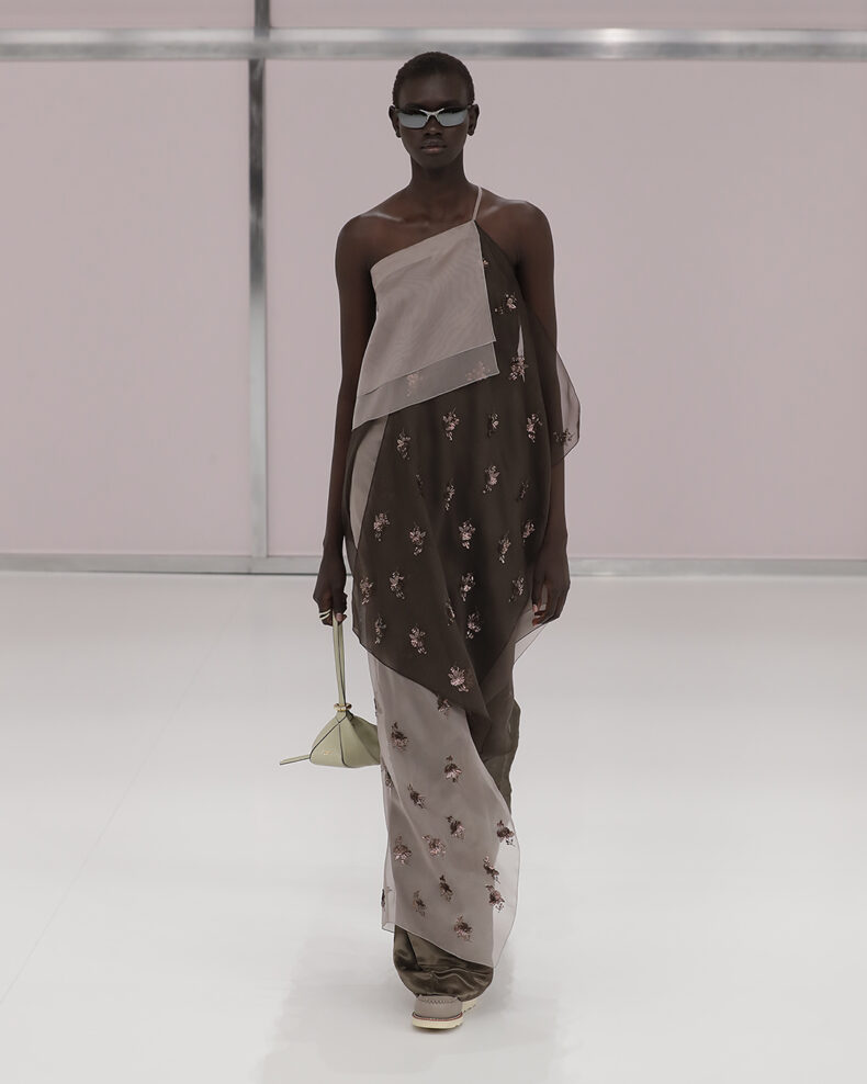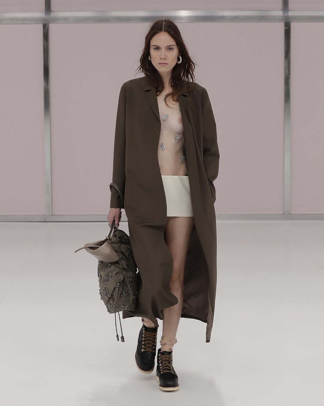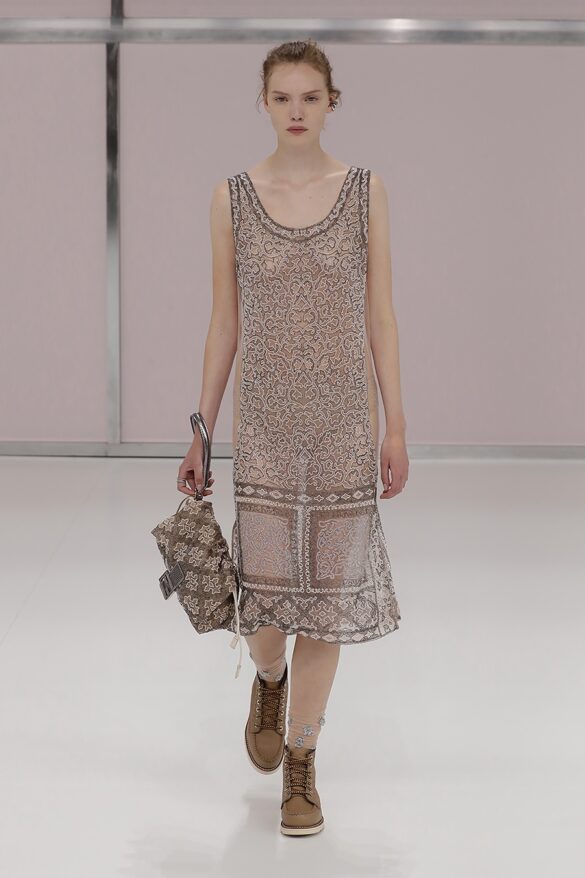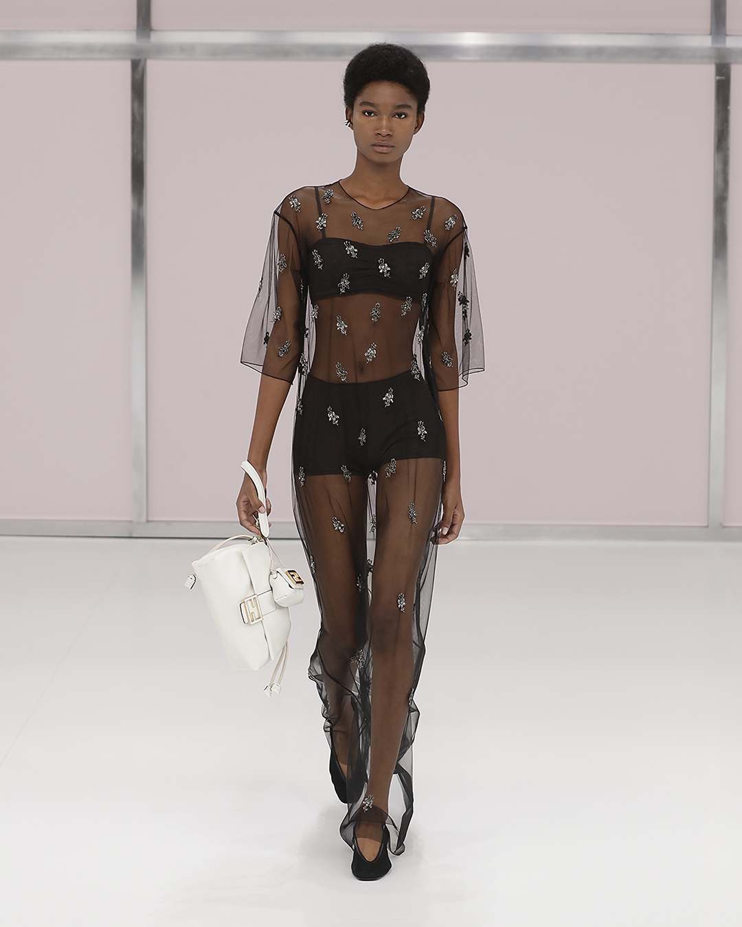 La sfilata ha visto abiti a vita bassa in chiffon, impreziositi da motivi Art Déco, con silhouette che richiamavano sia gli Anni ’20 che gli abiti sottoveste degli Anni ’90. Jones ha saputo mescolare elementi tradizionali con tocchi contemporanei, come accappatoi in shearling beige, T-shirt e gonne in coccodrillo bianco, e un gilet in rete rifinito con il caratteristico Cuoio Romano di Fendi.