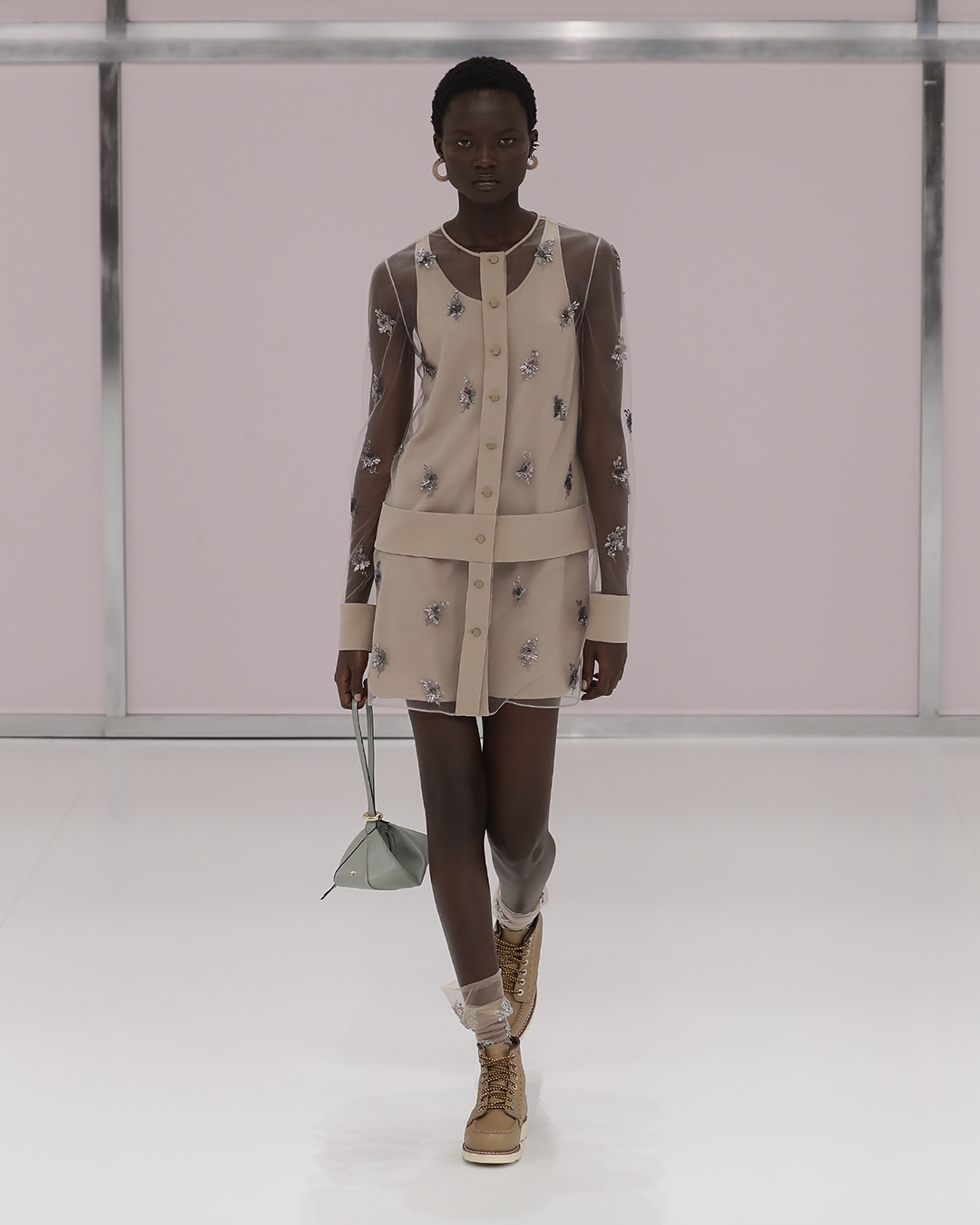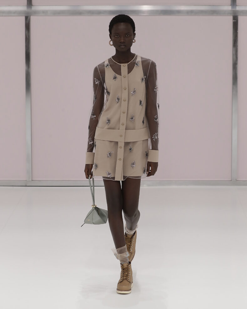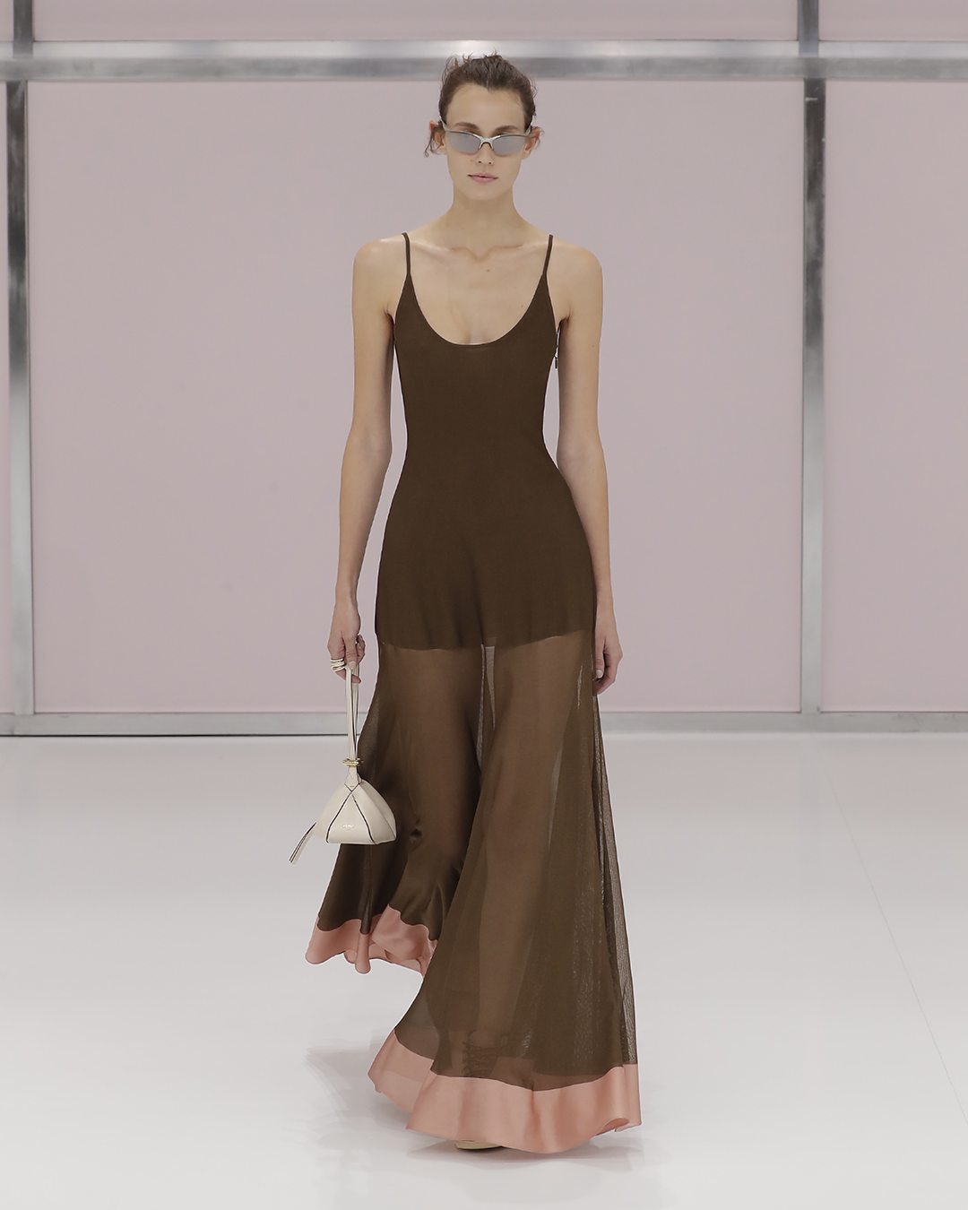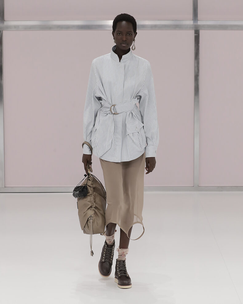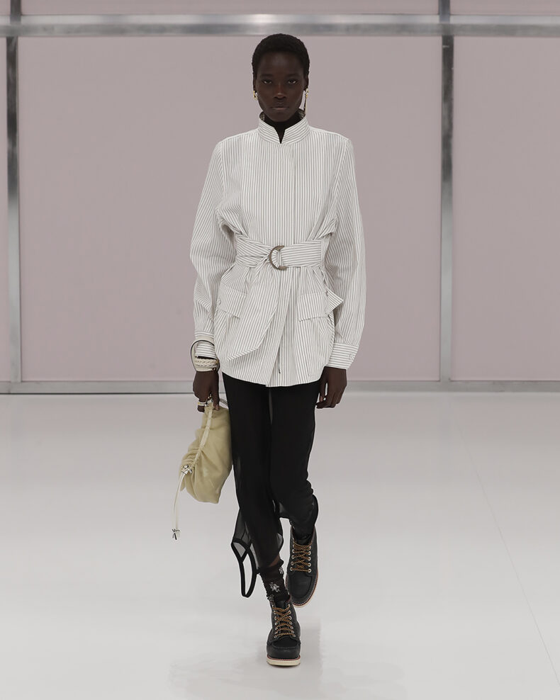 La sfilata ha visto abiti a vita bassa in chiffon, impreziositi da motivi Art Déco, con silhouette che richiamavano sia gli Anni ’20 che gli abiti sottoveste degli Anni ’90. Jones ha saputo mescolare elementi tradizionali con tocchi contemporanei, come accappatoi in shearling beige, T-shirt e gonne in coccodrillo bianco, e un gilet in rete rifinito con il caratteristico Cuoio Romano di Fendi.