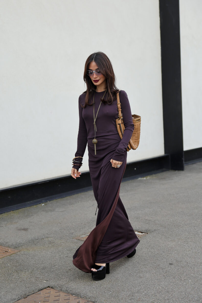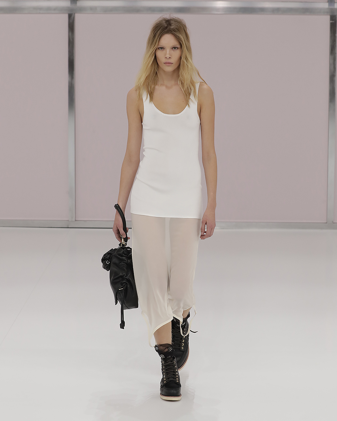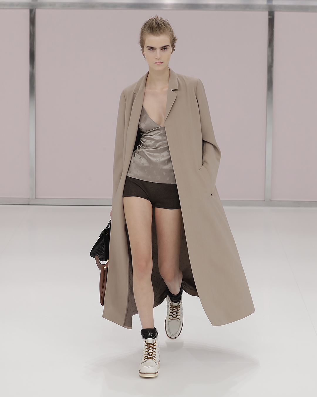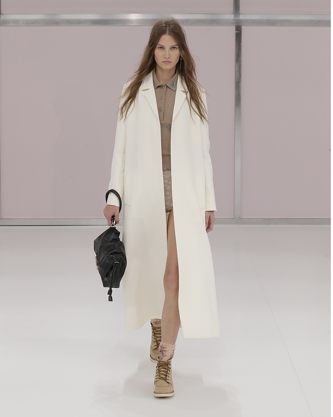 La sfilata ha visto abiti a vita bassa in chiffon, impreziositi da motivi Art Déco, con silhouette che richiamavano sia gli Anni ’20 che gli abiti sottoveste degli Anni ’90. Jones ha saputo mescolare elementi tradizionali con tocchi contemporanei, come accappatoi in shearling beige, T-shirt e gonne in coccodrillo bianco, e un gilet in rete rifinito con il caratteristico Cuoio Romano di Fendi.