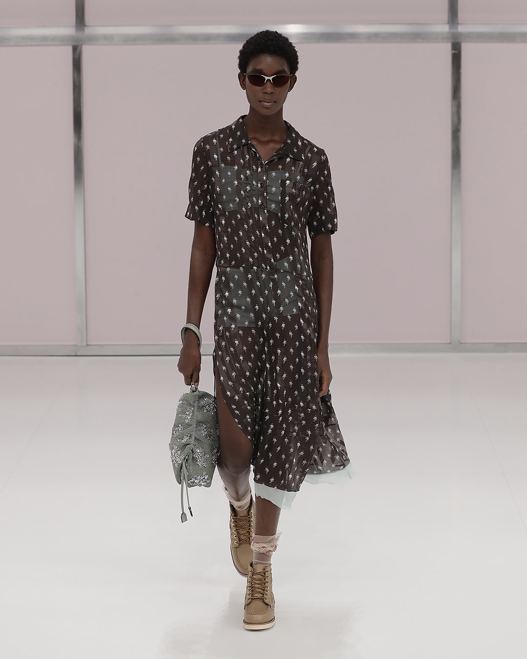 Un punto di forza della collezione è stata la collaborazione con il marchio americano Red Wing, che ha portato alla creazione di stivali da lavoro cuciti Selleria, abbinati a calzini floreali e vestiti a stampa botanica, evocando un’estetica grunge. Anche la celebre Baguette di Fendi è stata riproposta in chiave boho, con frange e arricchita da dettagli decorativi come ciondoli e gioielli.