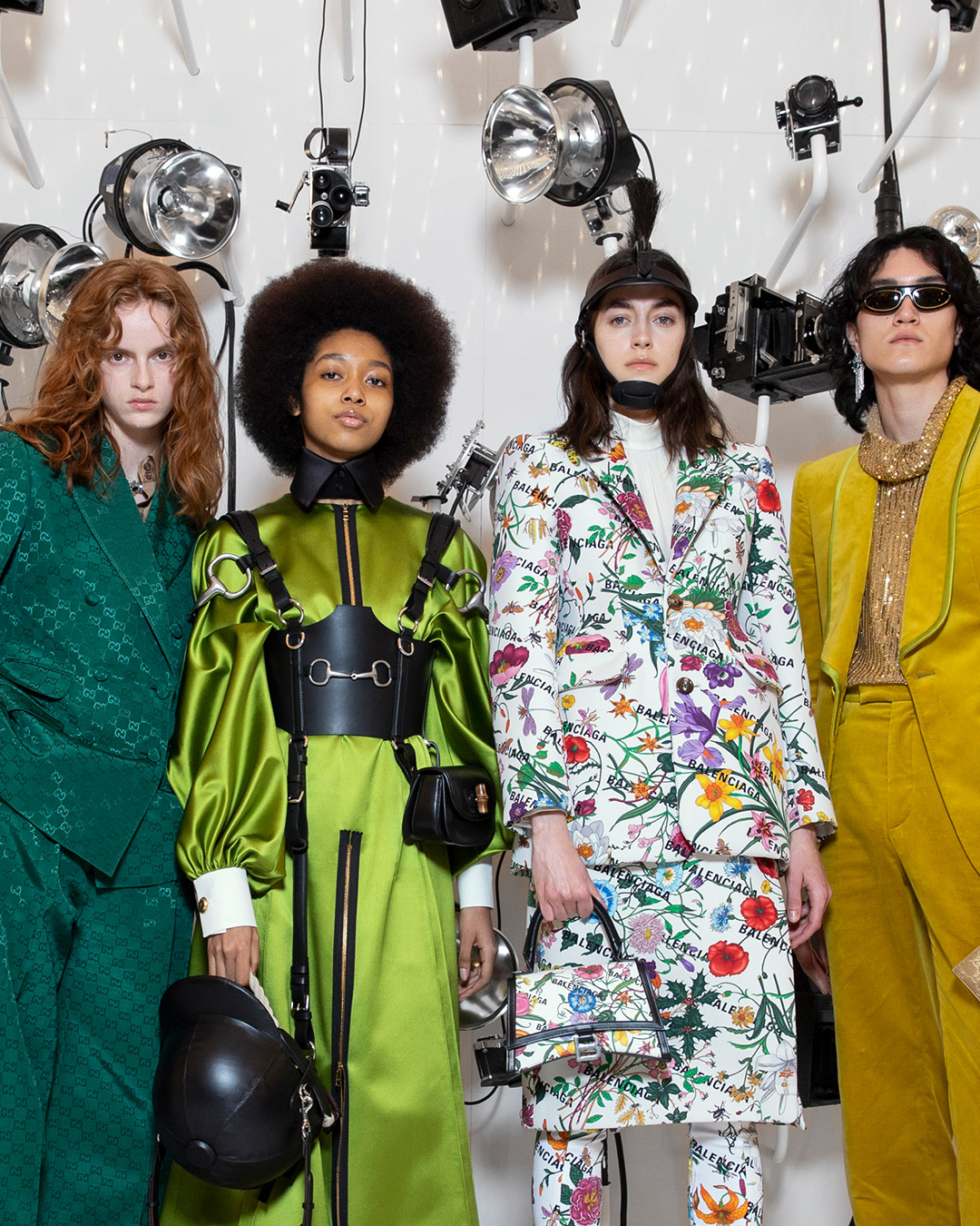 Un compleanno, questo, che conta cento rivoluzioni della terra e torna indietro a quella primavera di cento anni fa, quando tutto stava per germogliare e rifrangere. Alessandro Michele ha preso in mano le chiavi di casa Gucci per aprire le serrature della storia e fermarsi all’inizio, immerso in una fonte natale che ha dato origine ad alcuni tra i più indimenticabili oggetti moda dell’era contemporanea. Gucci Aria diventa il mezzo con cui soddisfare una fame di rinascita e celebra questo compleanno rendendo omaggio a ciò che oggi è considerato immutabile. Un logo, una forma, un pattern iconici diventano i protagonisti di pezzi rivisitati, che mixano l’universo fashion del mondo Kering in collaborazione con una maison che di pagine della storia ne ha scritte parecchie. Balenciaga e il suo direttore creativo Demna Gvsalia lavorano a quattro mani con Michele per cogliere una sfida unica nel panorama del fashion. Il rigore anticonformista di Balenciaga ripercorre la storia di Gucci passando per gli anni d’oro della direzione di Tom Ford, saccheggiandone i tessuti lucenti e le forme minimal.Il risultato è una collezione che celebra il mondo equestre, tornando agli inizi della Maison, trasfigurandolo in una cosmogonia fetish. È presente anche la vecchia Hollywood, le paillettes, gli abiti a ruota e la silhouette di una Marilyn Monroe contemporanea che non ha mai perso il suo glamour. La sartoria maschile, i suoi codici e fascino discreti vengono sabotati da abiti sfavillanti che ora abbracciano la contemporaneità e interpretano i desideri del mondo: celebrare una festa dell’aria. L’Aria, da qui l’evocativo nome della collezione, è l’elemento che diventa metafora di un soffia vitale che segna un potenziale nuovo inizio per Gucci.