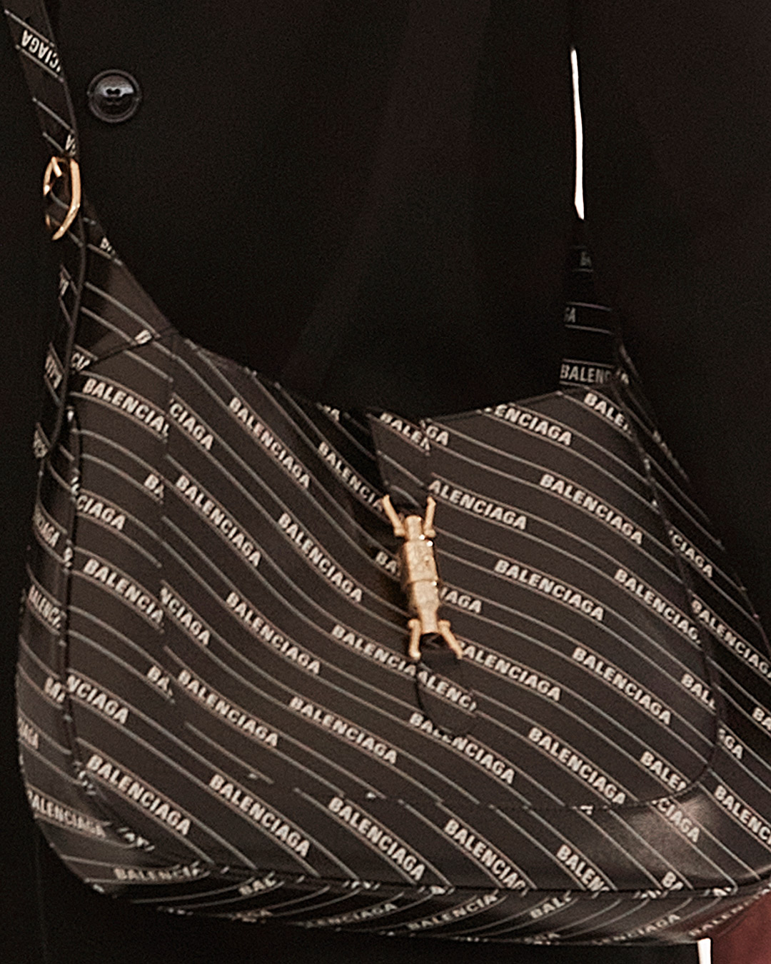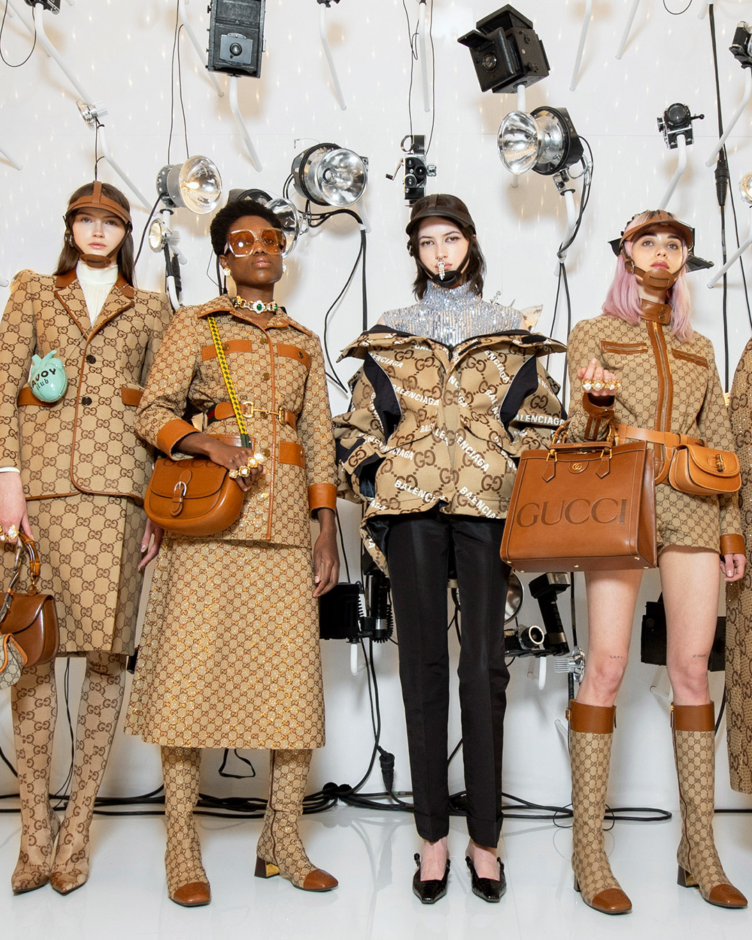 Inspirare Gucci Aria vuol dire fare entrare un mondo dentro di sé, un mondo fatto di sfide, nuove regole da sovvertire e canoni da infrangere. Della collezione emergono i completi sartoriali oversize, che richiamano senza troppe metafore gli abiti di Tom Ford dei primi anni ’90, i corpetti in pelle che stringono bluse con le maniche a sbuffo, gli stivali cavallerizza che cingono pantaloni in pelle a palloncino, le giacche crop con le spalline imbottite, i top peplo e i capispalla con logo allover che mixano Gucci e Balenciaga in un tripudio di icone. Gli accessori marcano la mano di Alessandro Michele, sculture di cuori anatomici diventano borse a mano, la Jackie si tinge di pattern che mescolano l’heritage Gucci al logo Balenciaga, ma avviene anche il contrario. La Hourglass di Balenciaga si tinge dell’iconico pattern floreale Gucci e gli stivali stretch dalla punta maxi di glitter e loghi della Maison italiana. Un connubio di richiami a tutti coloro che hanno scritto le pagine della moda, in una celebrazione che non è autoreferenziale ma un ode alla capacità di rinnovarsi e tornare a vivere, dopo che l’inverno è diventato passato.