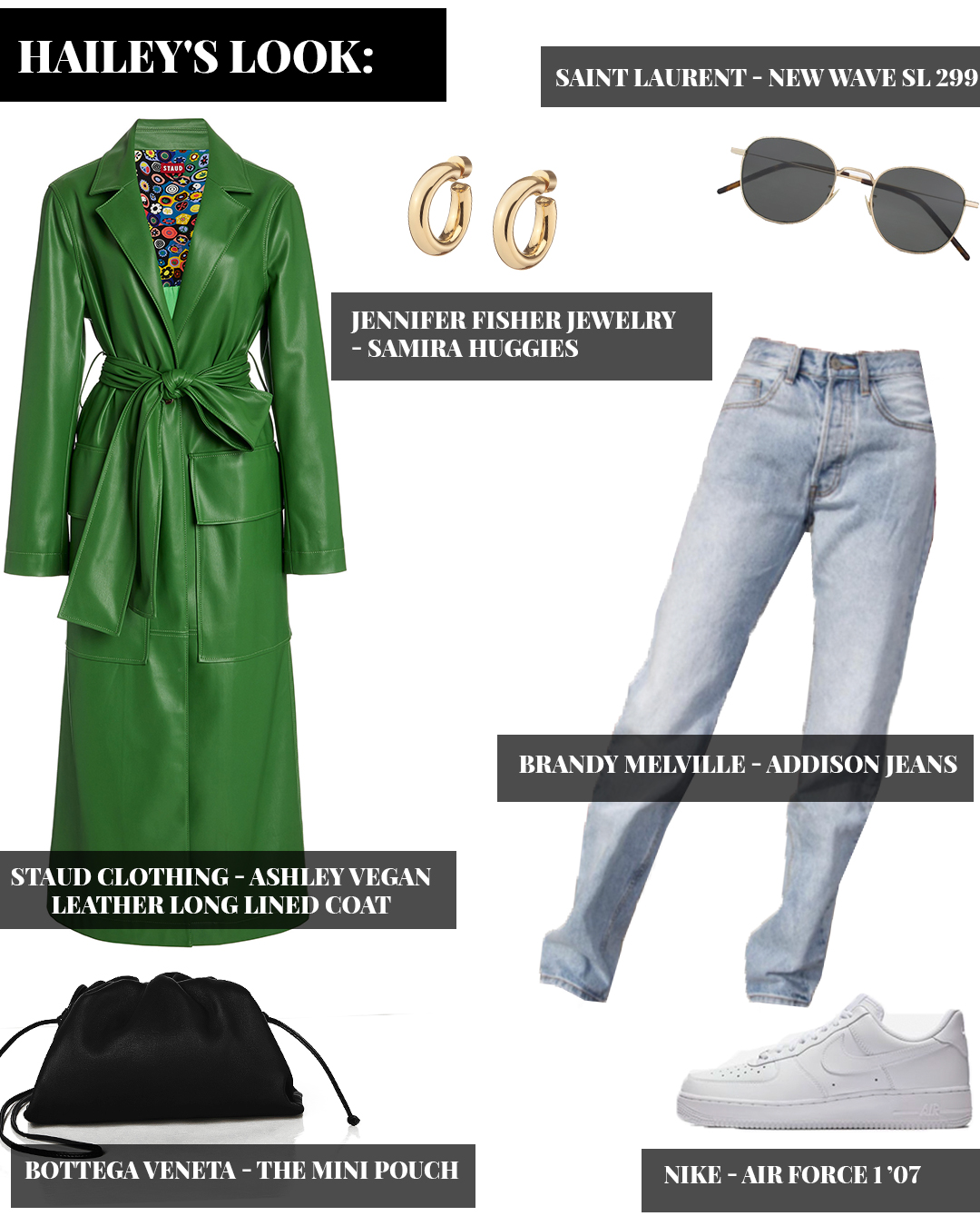 In generale gli alleati preferiti di un everyday look perfetto, a metà tra inverno e primavera, sono due: il trench e i mom jeans, o ballon fit jeans se li preferite. Cosa abbinarvi? Un top color block e le sneakers. Per gli accessori giocate su forme e dimensioni cool di quest’anno: ricordate che il trend del mini è ancora molto in voga e le borse a spalla hanno lasciato il posto a tracolle e marsupi. Per i colori, l’opzione più cool tiene neutri i jeans e il top per azzardare con i capo-spalla: scegliete tra le tonalità di tendenza di questa stagione come la palette del verde, i colori del deserto (in particolare marrone e rosso fuoco), rosa e ceruleo. Volete vedere come ha realizzato il look perfetto la nostra musa Hailey Bieber? Ecco il suo outfit e come ricrearlo in versione super affordable| PS. Potete acquistare i capi direttamente dai nostri link!