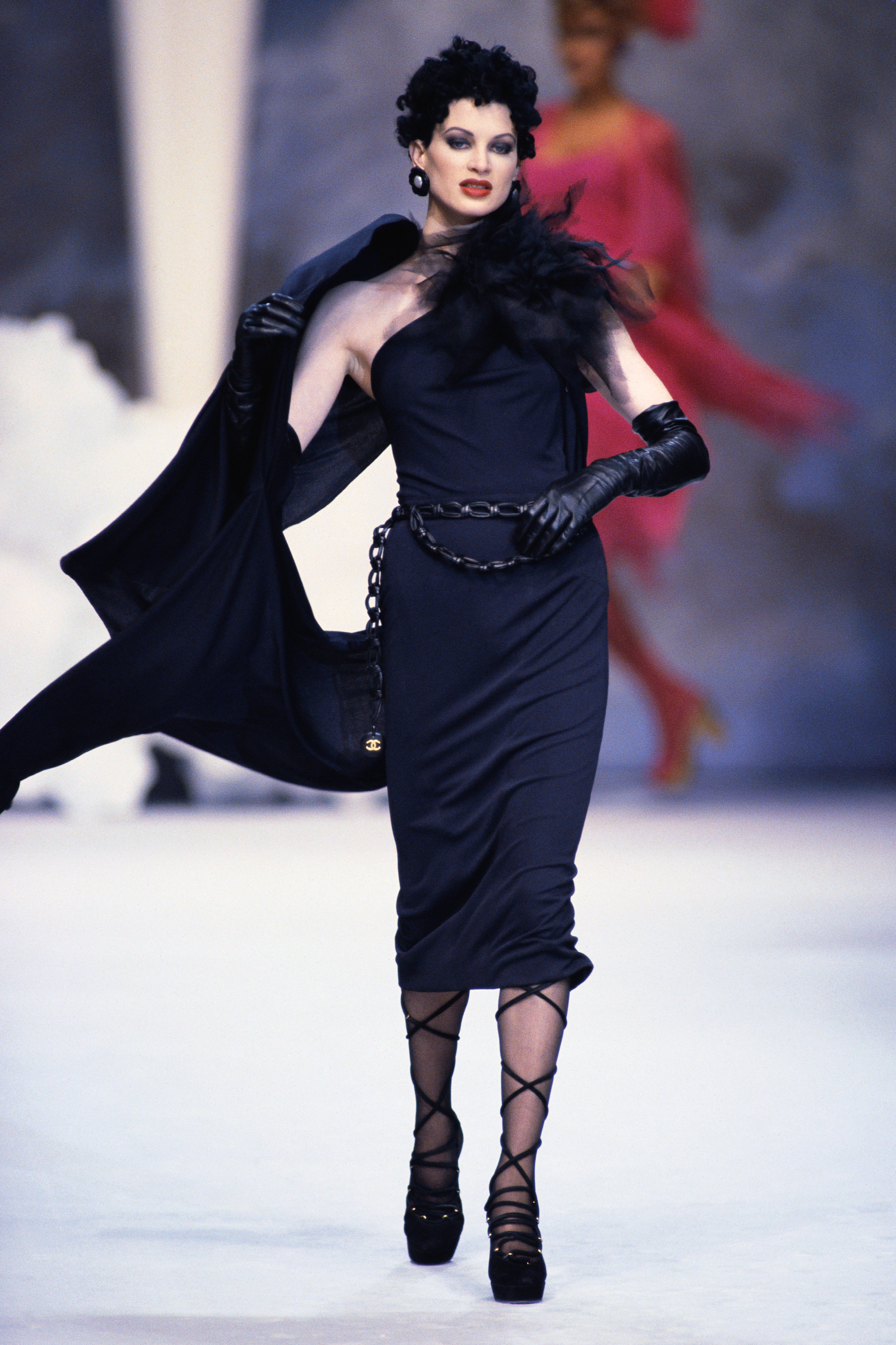 - US model Kristen McMenamy displays a creation designed by Karl Lagerfeld for the presentation of Chanel’s 1994 Fall-Winter high fashion collection on July 19, 1994 in Paris. / AFP / Pierre VERDY (Photo credit should read PIERRE VERDY/AFP via Getty Images)