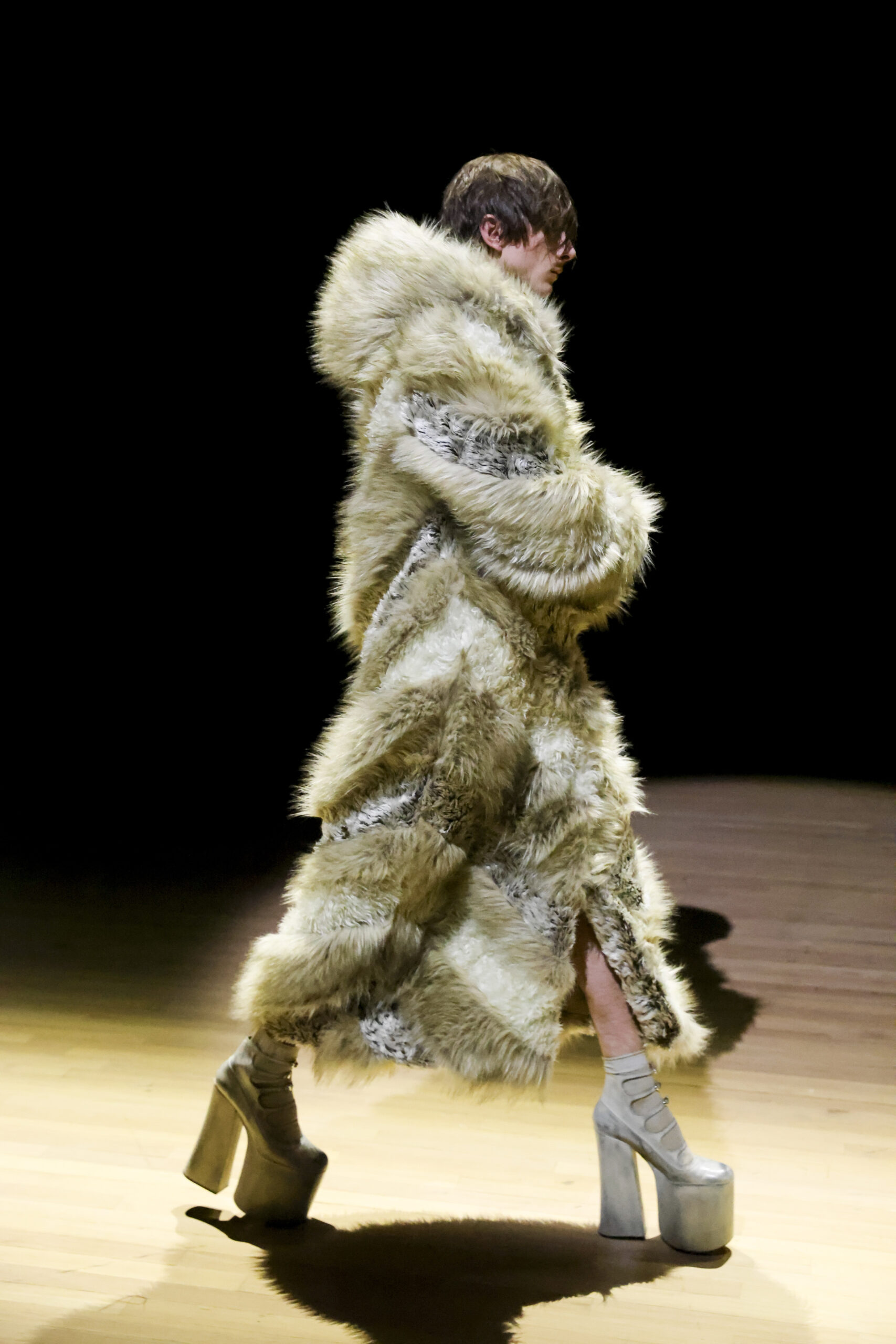 Tra i dettagli ci sembra quasi di riconoscere le stesse zeppe con plateau sfoggiate dall’inossidabile Naomi Campbell durante la collezione Autunno/Inverno 1993 della Westwood – proprio quelle della celebre caduta. Ed ancora, abbiamo amato i cappotti impreziositi dai patchwork in denim geometrici, i bomber, l’incursione di un brillantissimo rosso e, in conclusione, i due lunghi abiti (so Vivienne) con stampa a pois.