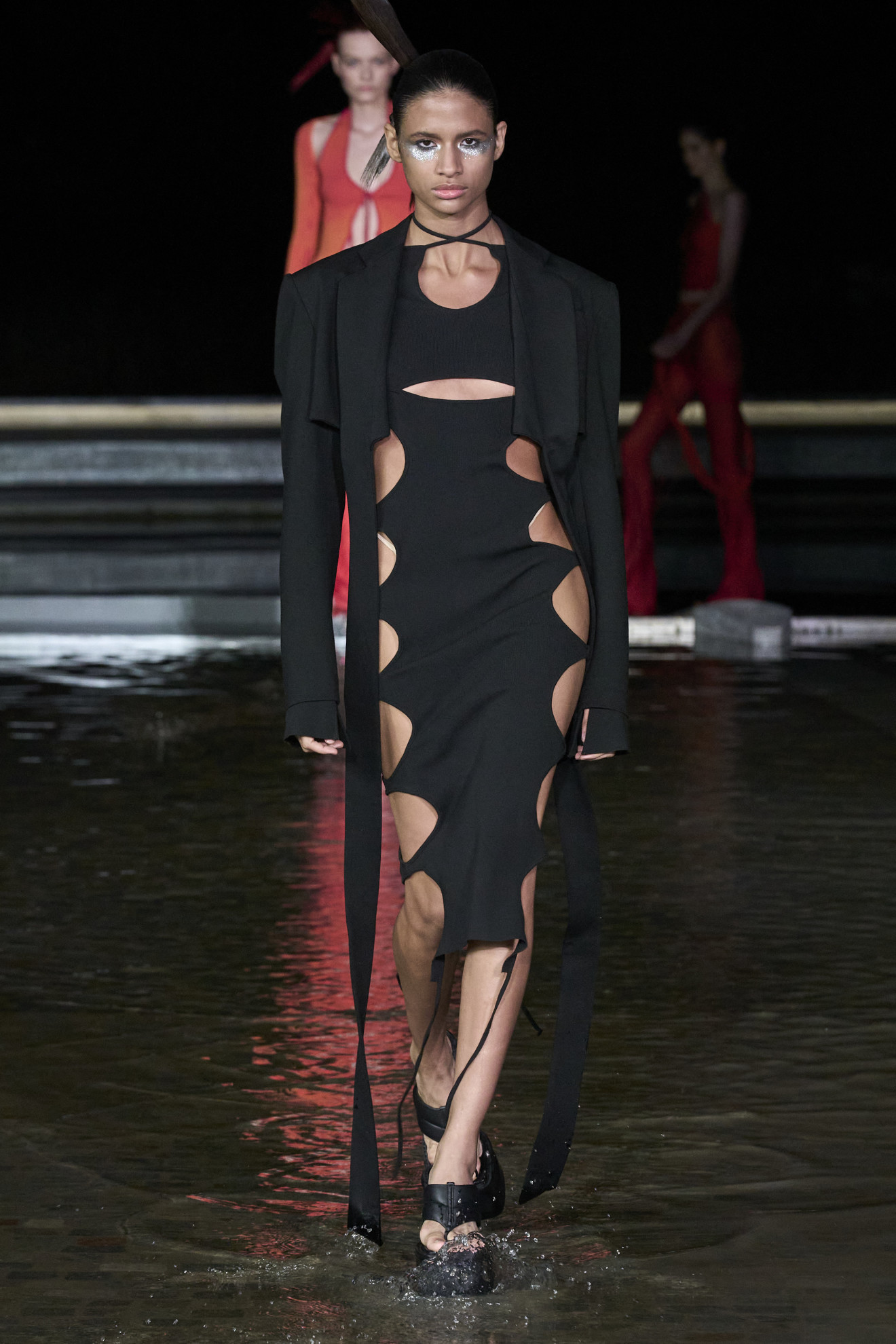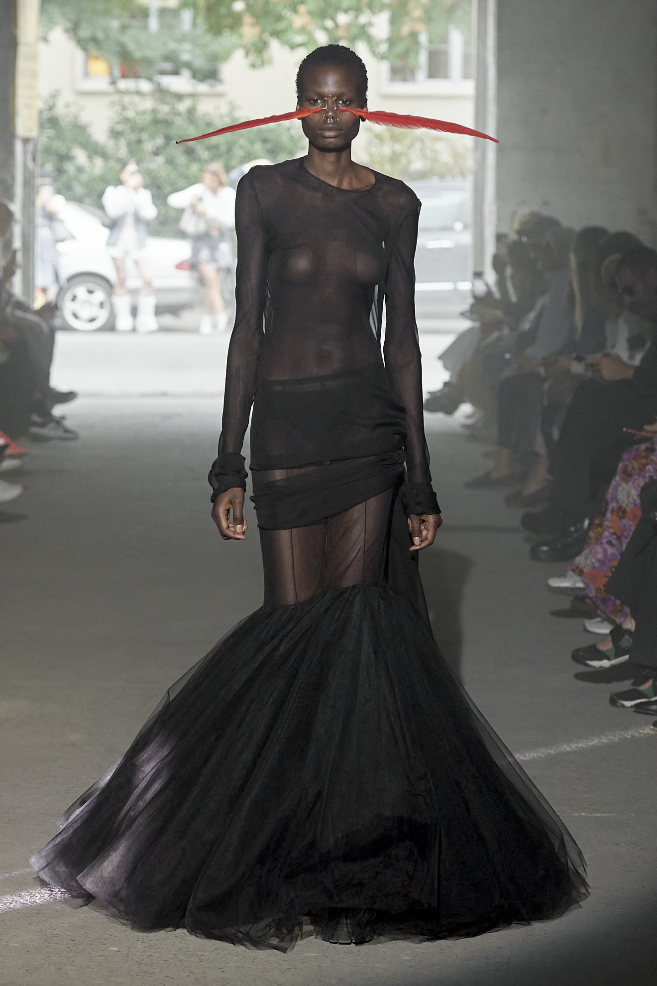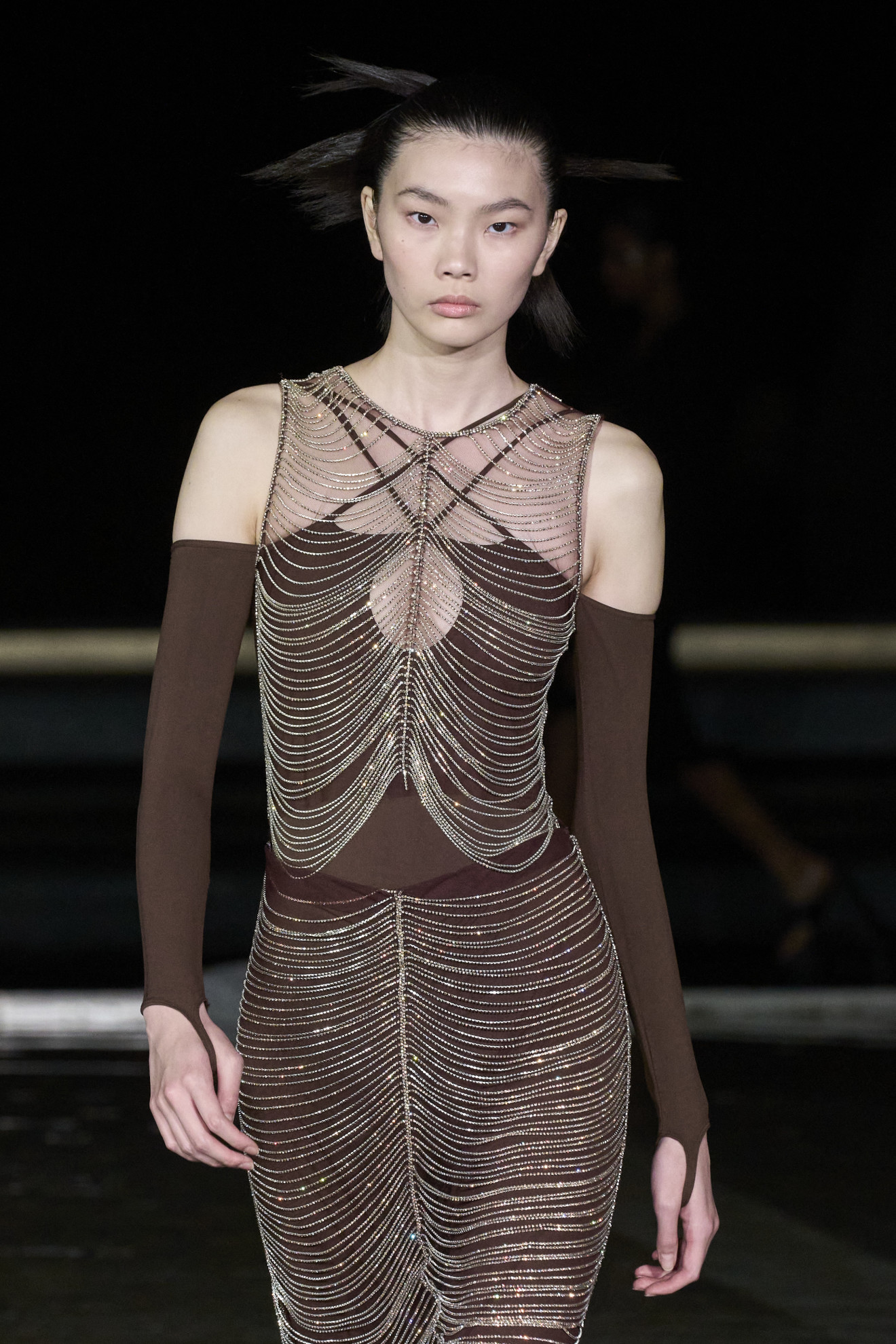 - PARIS, FRANCE: A sheer, fringed black dress with detached sleeves by Thierry Mugler for his 1998/99 Fall/Winter haute couture collection, shown 22 July in Paris. (Photo credit should read THOMAS COEX/AFP via Getty Images)