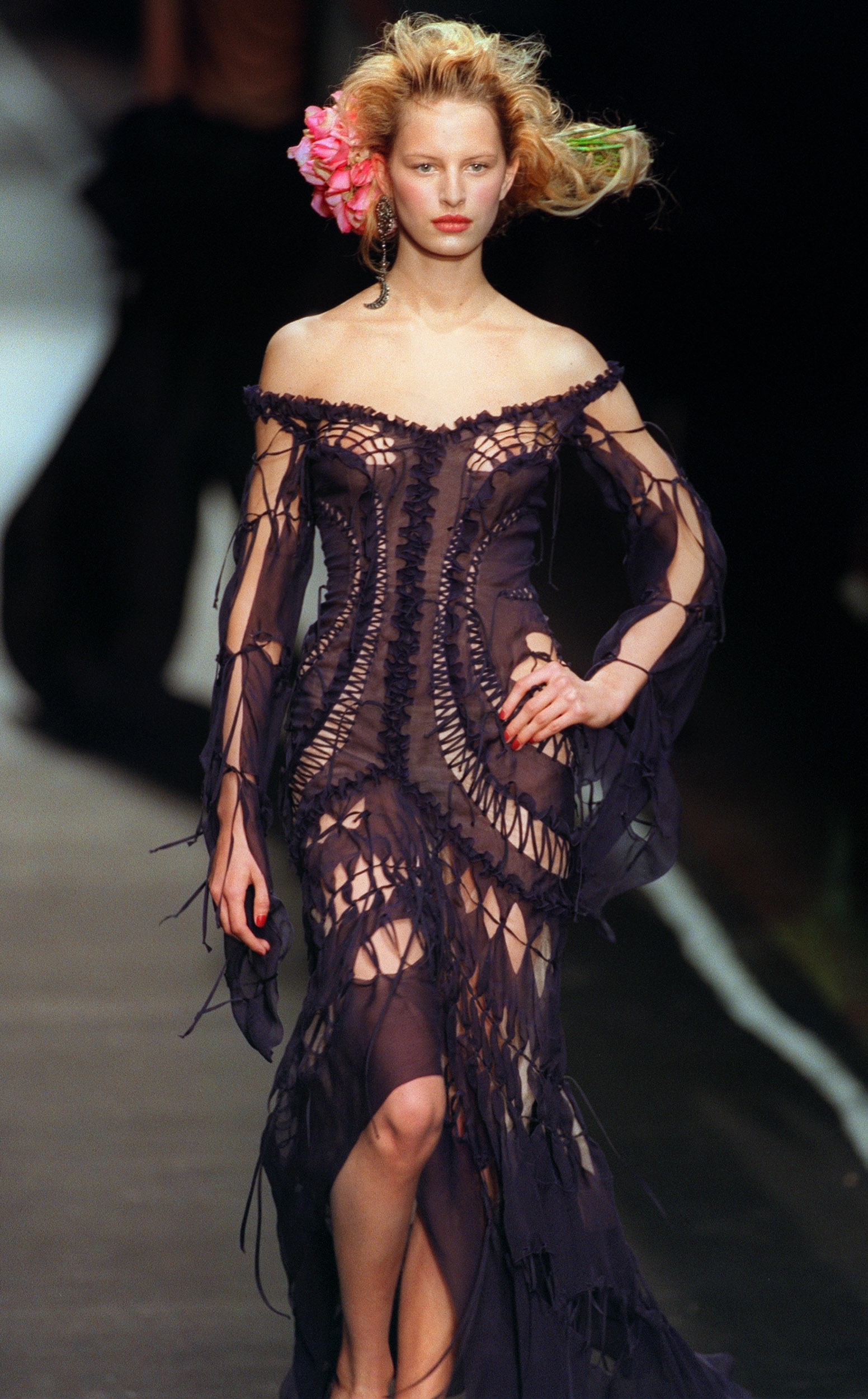 - Czech model Karolina Kurkova presents a ribbed mesh and tulle dress for Jean-Paul Gaultier Haute Couture Spring-Summer 2001 collection, 21 January 2001 in Paris. (FILM) AFP PHOTO PIERRE VERDY (Photo credit should read PIERRE VERDY/AFP via Getty Images)