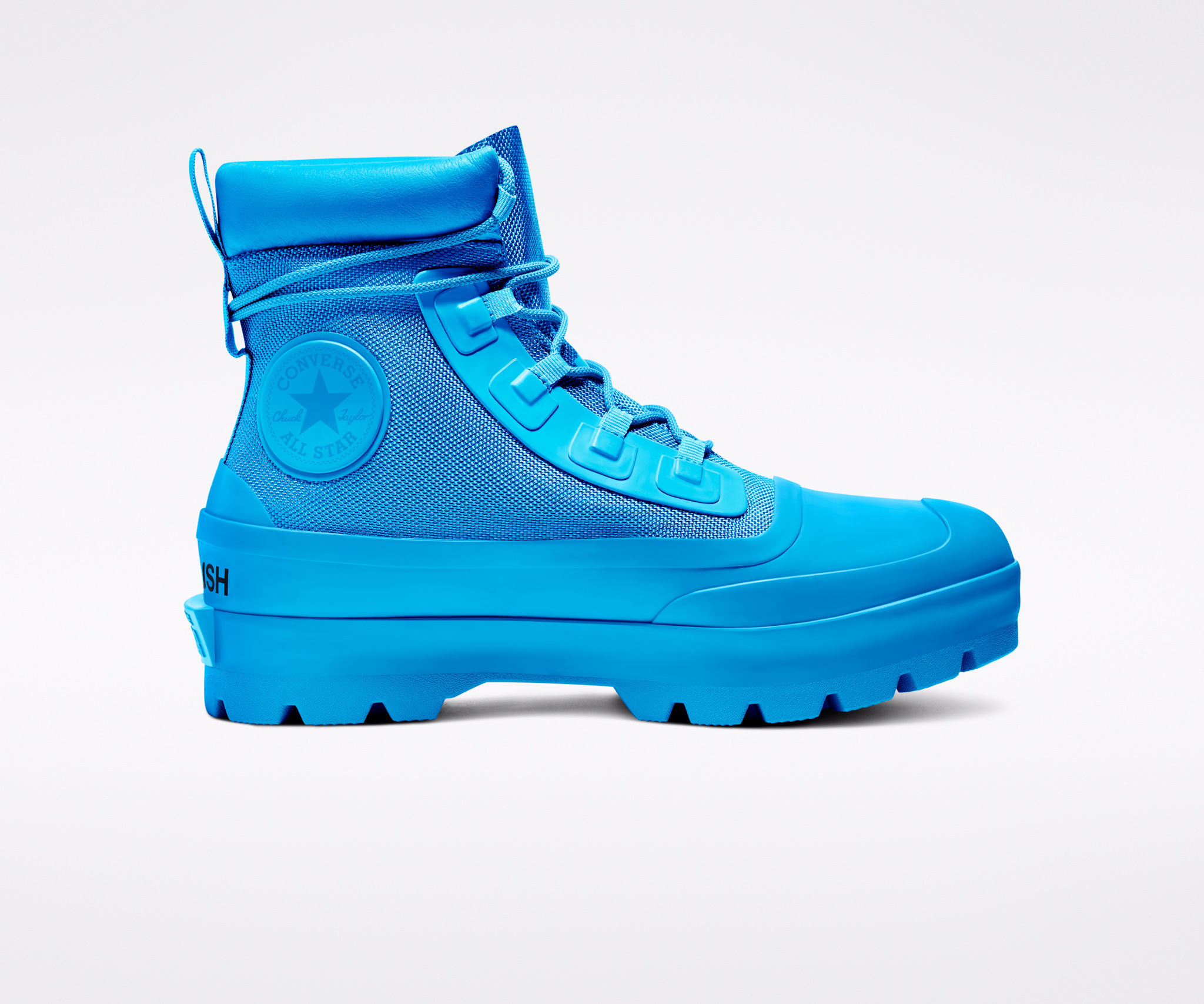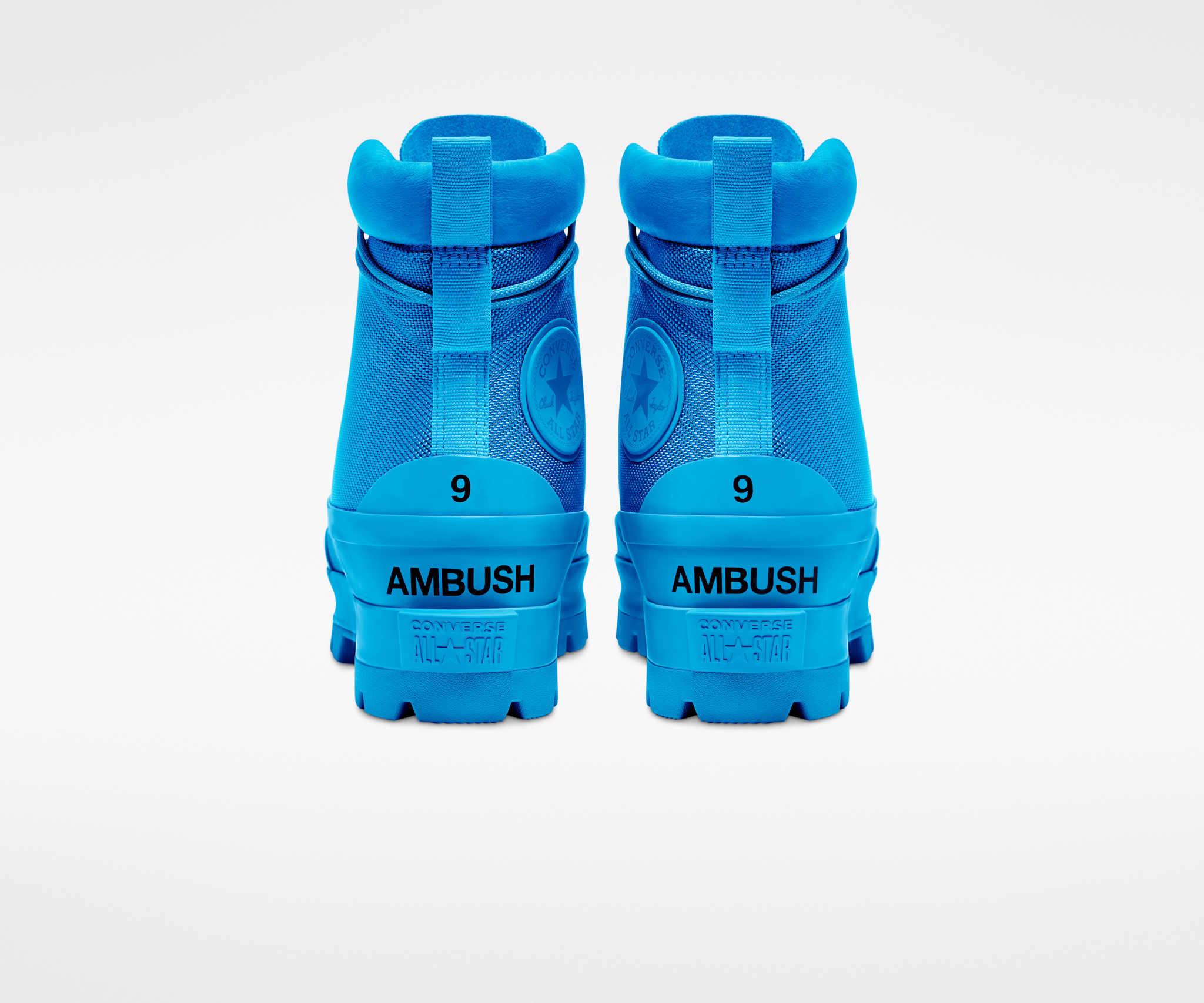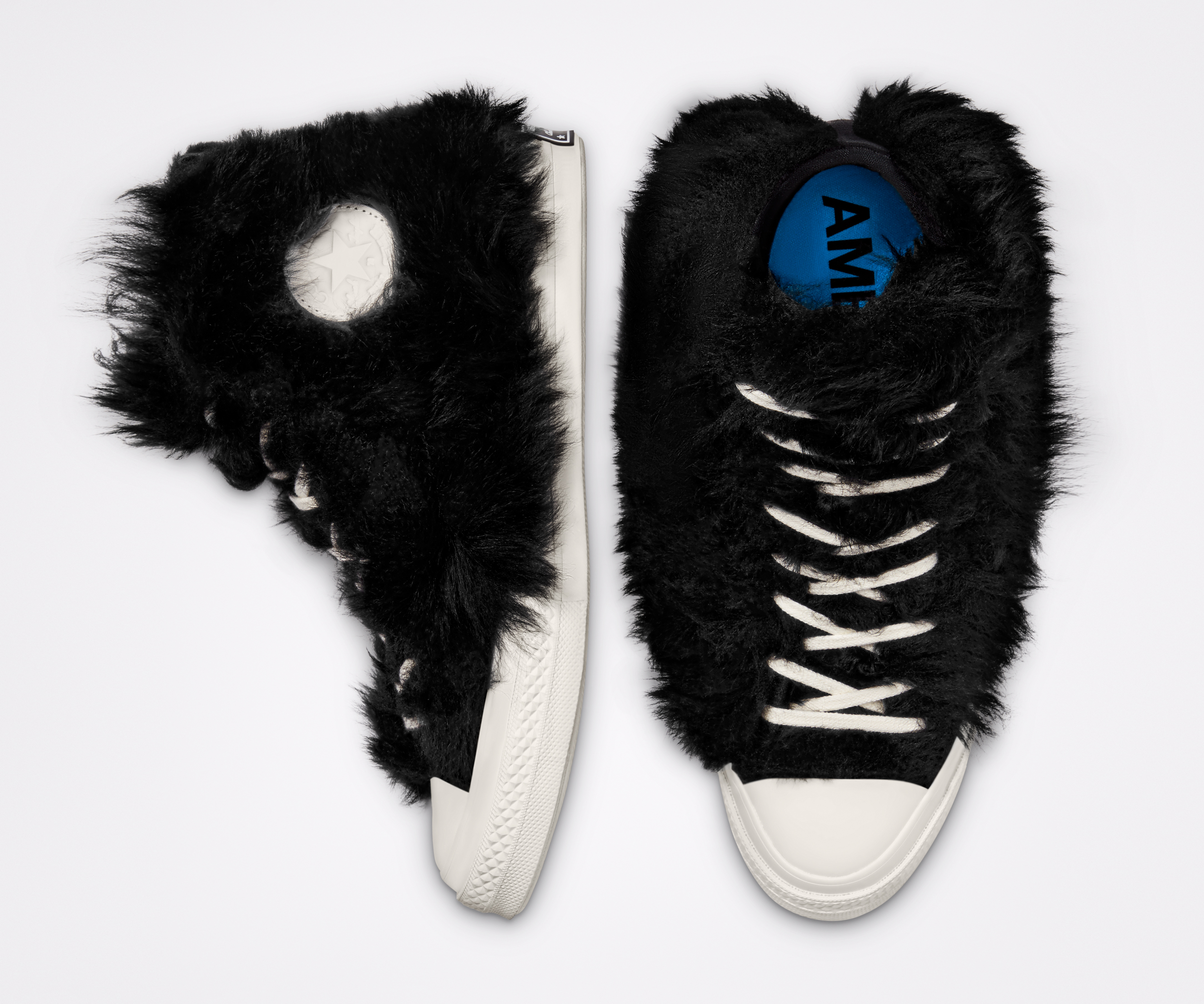 Anche se radicato nei classici stili outdoor, il design non sarebbe completo senza la predilezione di Yoon per l’inaspettato. La scarpa è disponibile in due tonalità: in Nero e in un brillante Blithe Blue, in contrasto con lo stile sobrio dell’attrezzatura tecnica. Entrambi i colori sono logati con il marchio Ambush, le dimensioni dei passanti dei lacci e le stampe sul tallone sono forti e decise. Per completare la collezione, Converse e Yoon hanno cercato di affiancare all’utilitaristico CTAS Duck Boot un’irriverente Chuck 70. La squadra ha cercato di giocare con la costruzione della Chuck 70, facendo leva sui suoi dettagli sfumati per una materializzazione più tattile. Il risultato: una parte superiore realizzata in wild shearling, sia in Navy che in Black, che attira l’attenzione sul design peloso, che quasi copre la Chuck stessa.