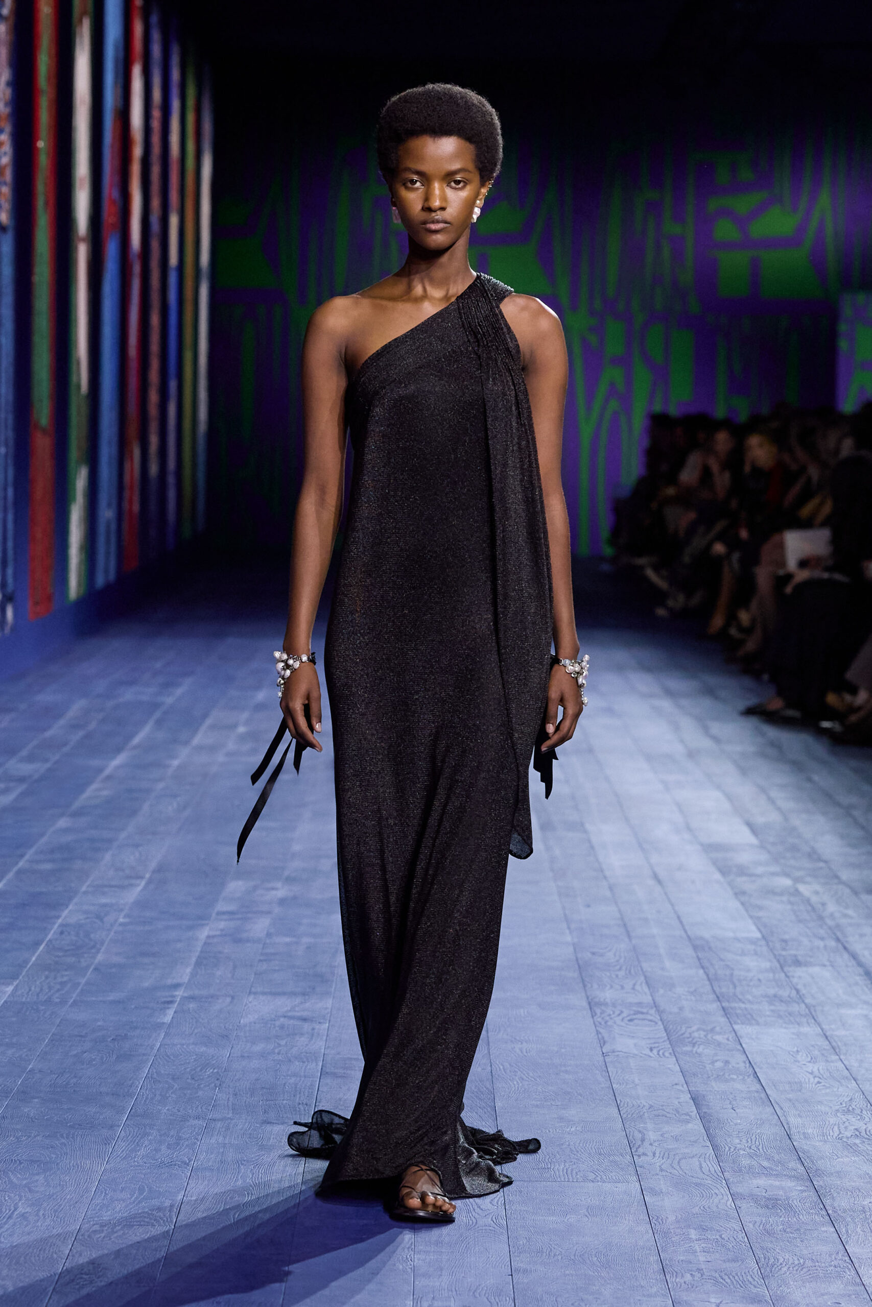 Dagli abiti peplos in jersey di seta, passando per i top ricamati e dei pantsuit in moiré bianco e velluto nero. Così Chiuri, ancora una volta, trasforma i riferimenti storici in una nuova estetica che coniuga alla perfezione passato e presente, dimostrando quanto la moda possa essere contemporanea pur rispettando l’heritage.