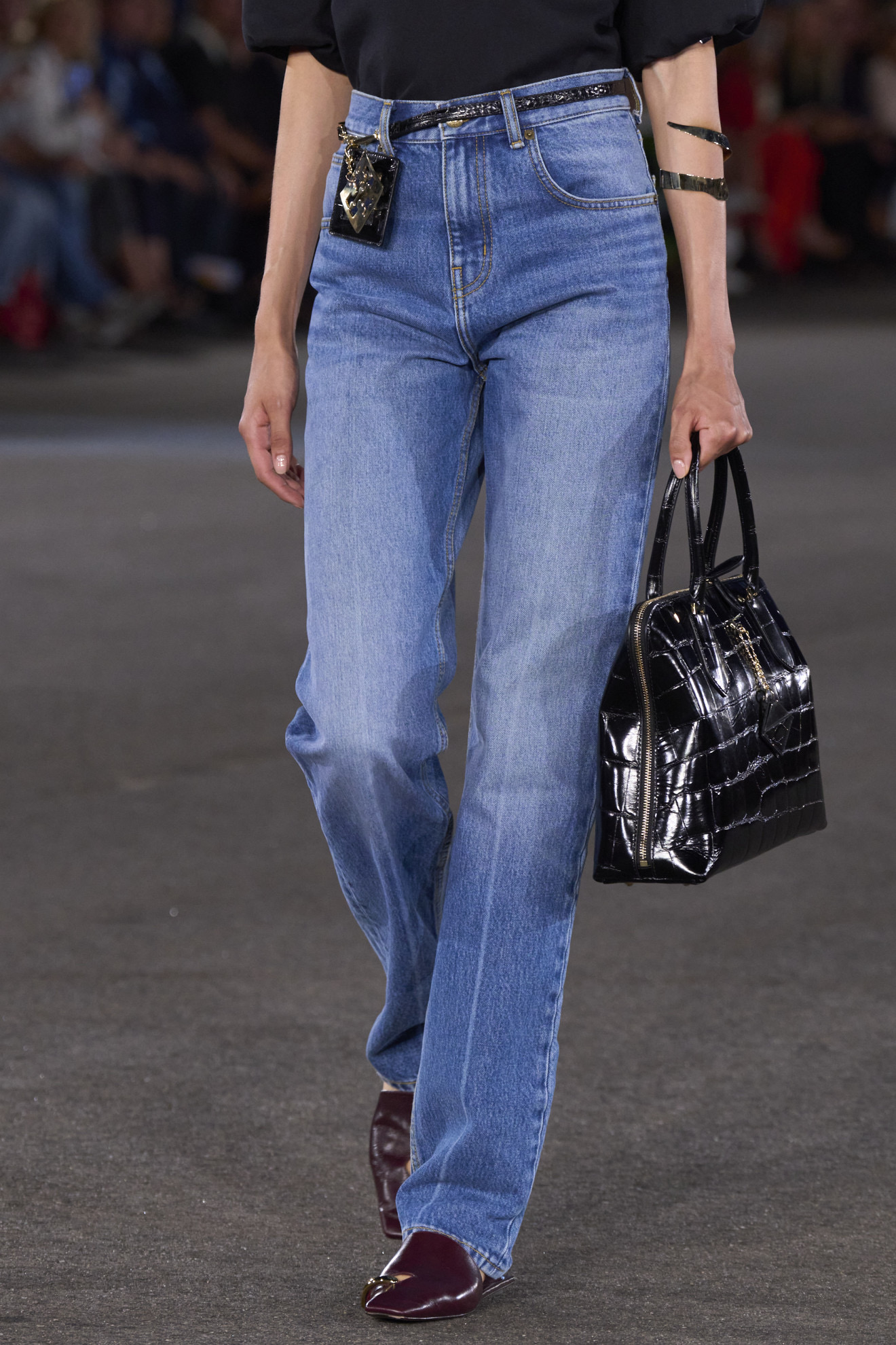Molto apprezzati in questa collezione Primavera/Estate 2023 sono i volumi, una particolare ed interessante sovrapposizione di capi non sempre della medesima texture. Poi il denim, soprattutto sui pantaloni, che la designer sceglie rigorosamente a vita alta, sbiaditi ed impreziositi da accessori in vita.
