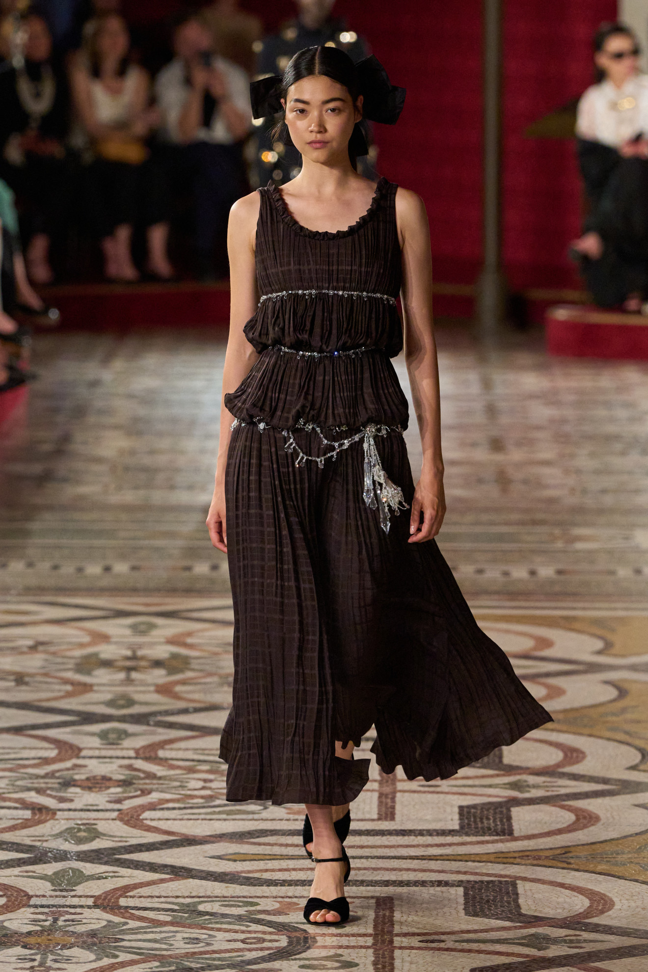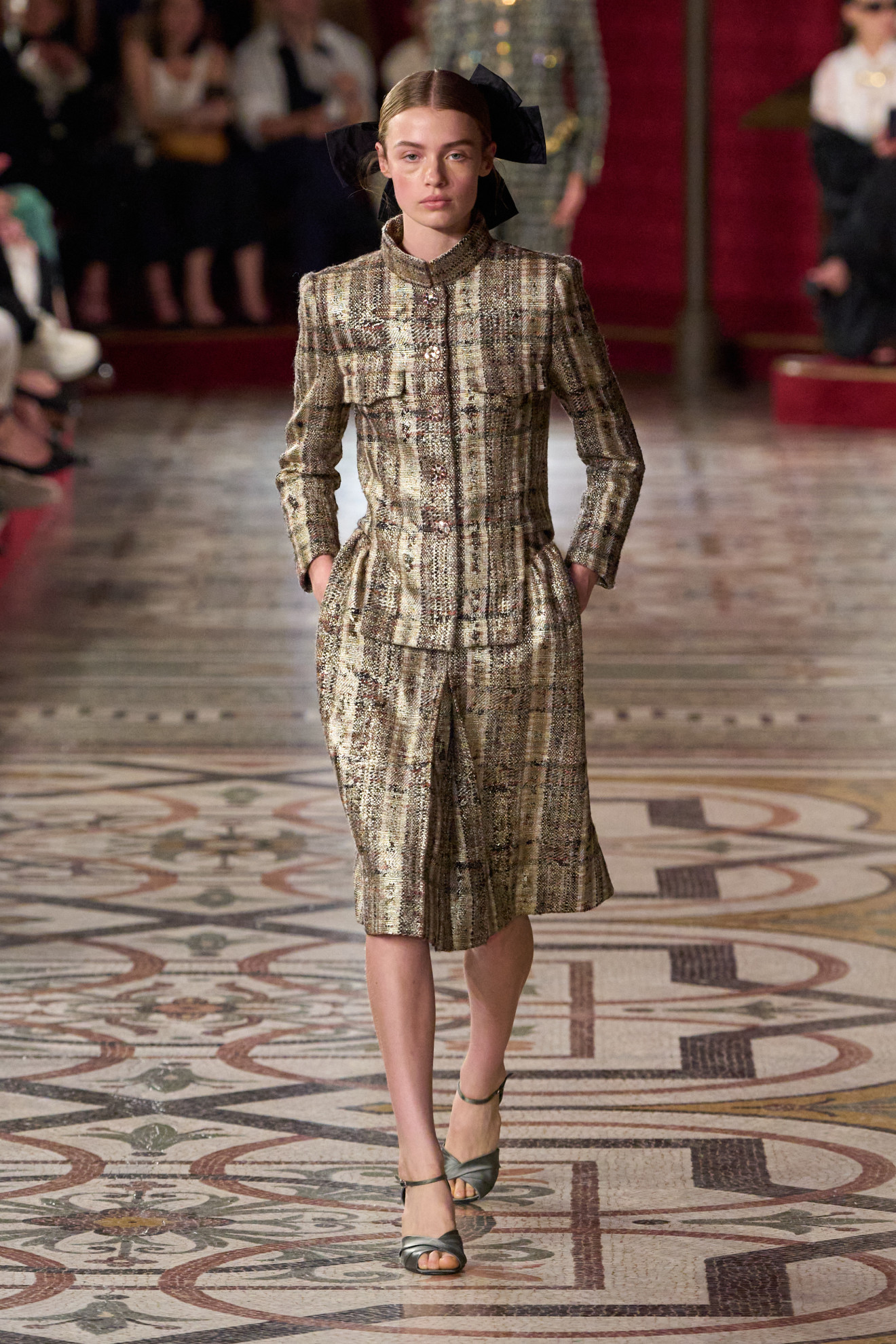 La collezione è stata una vera e propria sinfonia di materiali opulenti tra cui piume, nappe, cabochon e fiori ricamati, tessuti preziosi come il tweed, il velluto e la seta, creazioni che hanno reinterpretato i codici iconici della Maison Chanel con un touch decisamente romantico. Dai tailleur rivisitati ai completi da sera e i cappotti lunghi, l’abbigliamento ha evocato una moderna tradizione teatrale.