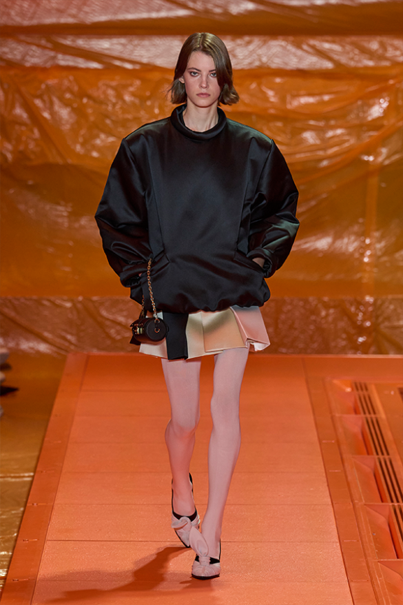 Tra i pezzi chiave di questa sfilata spiccano gli audaci blazer, impreziositi da spalline oversize, che hanno catturato l’attenzione in modo sorprendente. Quando si tratta di calzature, la collezione ha offerto una varietà di modelli, sia ad altezza media che bassa, con punte affusolate o, nel caso delle scarpe bianche e nere, una particolare attenzione alla forma del piede, enfatizzata da una calza unica nel suo genere.