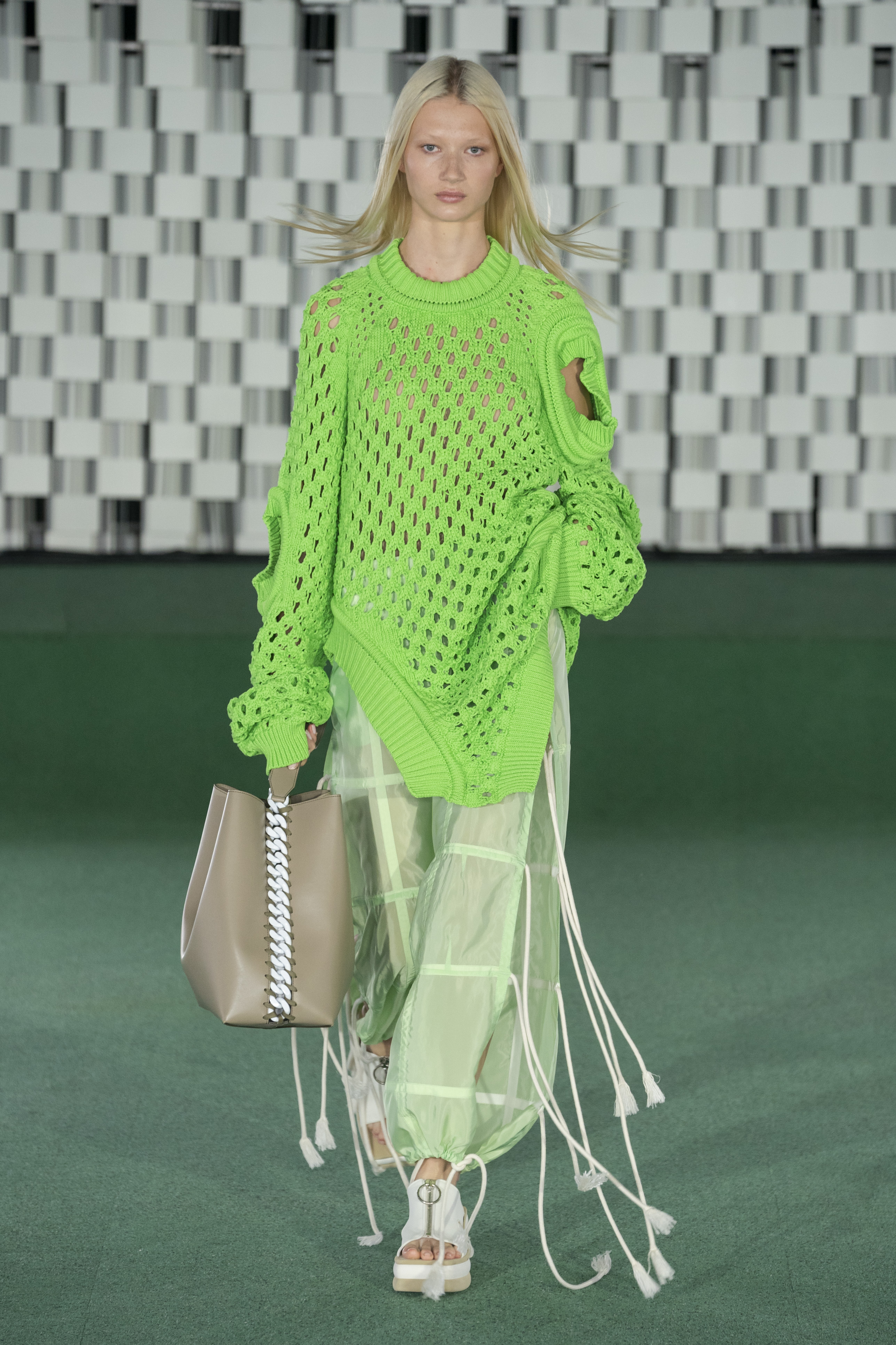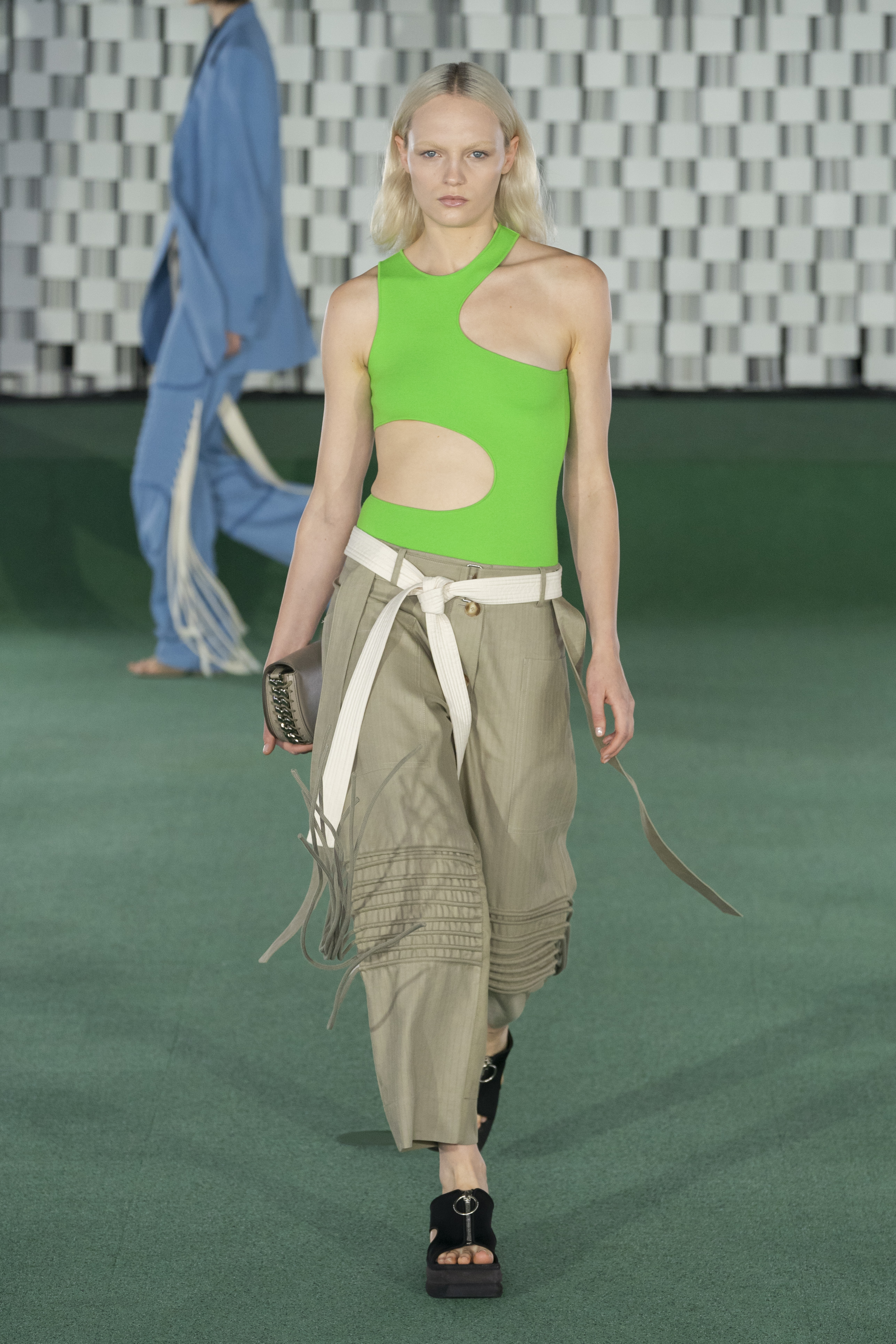 Punta tutto sui dettagli cut-out e i colori neon, abbinando top stretch iper attillati a gonne e pantaloni fluidi ed extra large. Stella Mccartney per l’estate 2022 si spoglia dei suoi classici abiti per indossarne di nuovi, più mascolini ma non per questo meno attraenti. I pantaloni sono cargo e si stringono solo in vita con cinture oversize da lasciar cadere sui fianchi, i body e i top sono invece una seconda pelle da abbinare a cardigan morbidi e intrecciati che lasciano intravedere le forme.