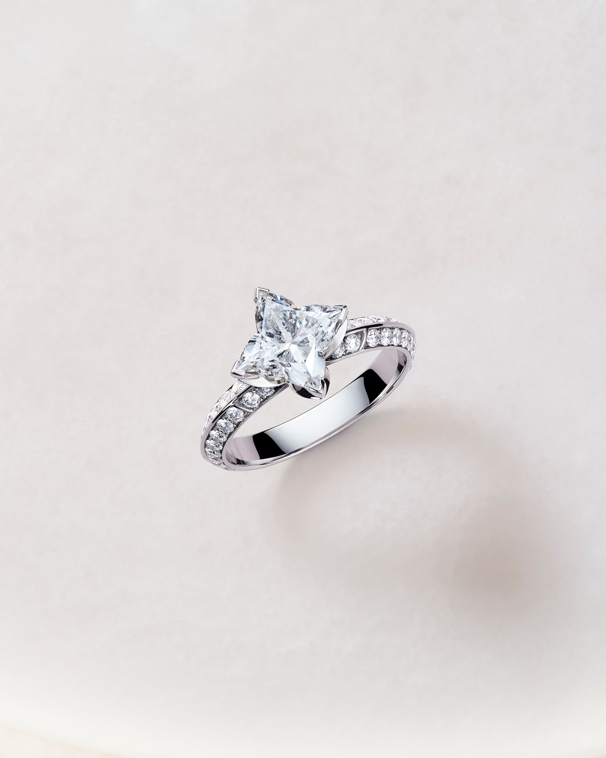 La collezione, chiamata LV Diamonds, è firmata da Francesca Amfitheatrof, la direttrice artistica di Louis Vuitton per orologi e gioielli, ed è interamente dedicata al fiore del monogramma, uno degli emblemi più distintivi del marchio. Difatti, l’LV Monogram Star diamond è il fiore all’occhiello della collezione, un diamante dal taglio speciale con ben 53 sfaccettature e punte affilate, reinterpretazione moderna della stella floreale creata da Georges-Louis Vuitton nel lontano 1896, proposto in una varietà di anelli, orecchini e ciondoli.