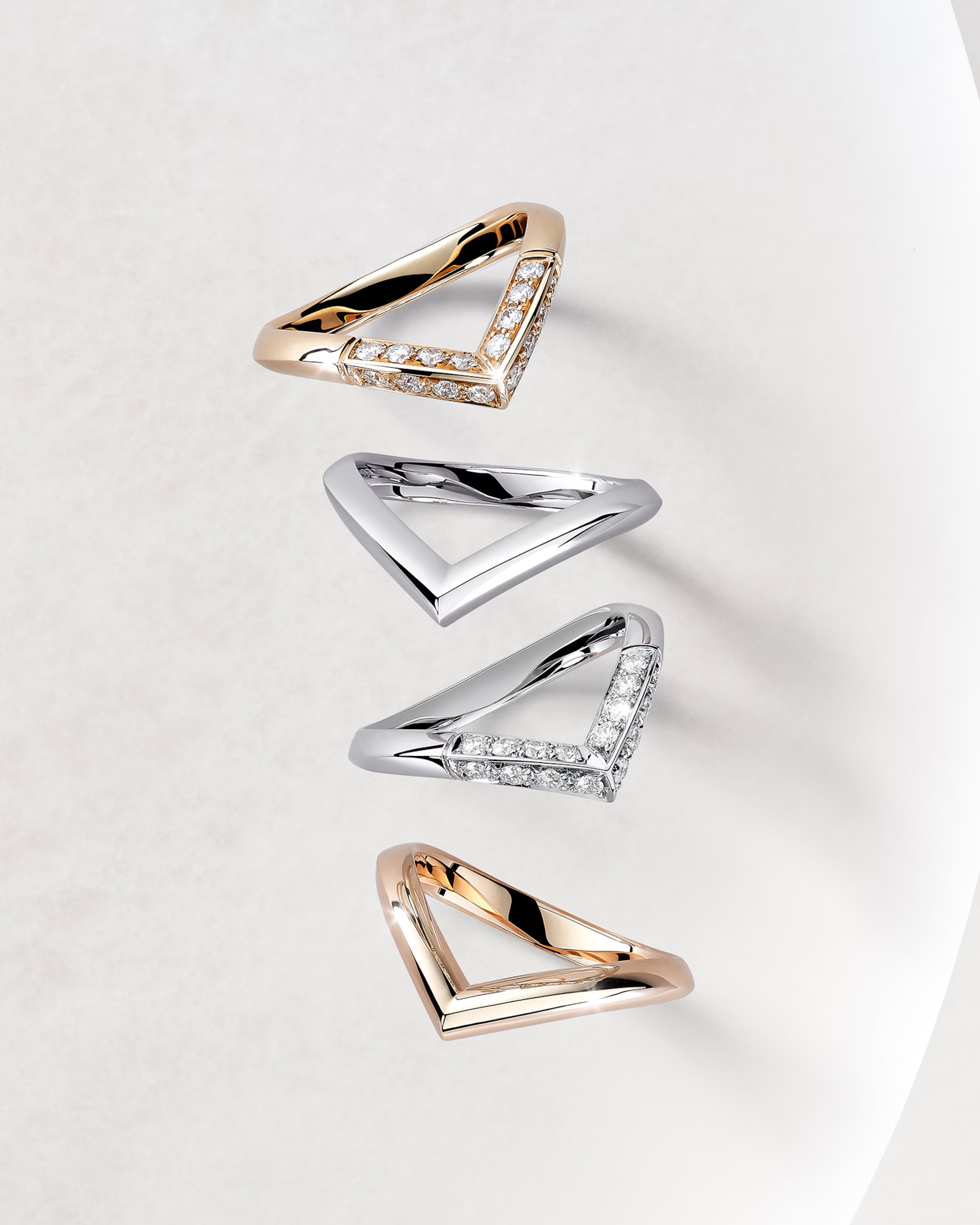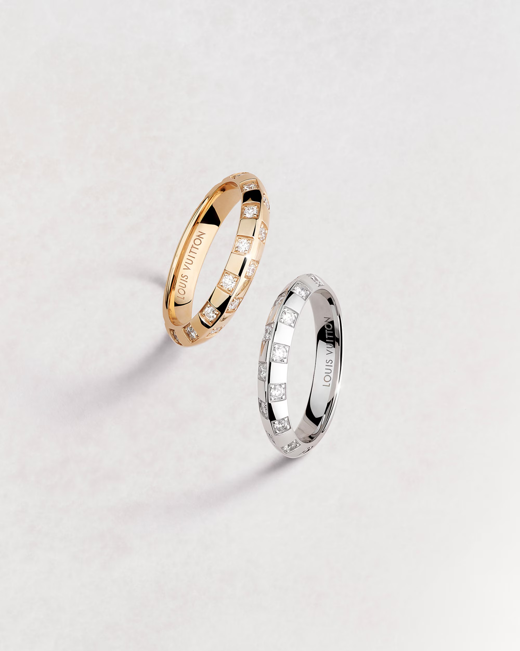 Gli anelli sono realizzati in platino, oro rosa o con incastonature di diamanti pavé, omaggiando lo stile Art Déco che Gaston-Louis Vuitton amava decorare sulle sue valigie negli Anni ’20 e ’30. I pendenti e gli orecchini, invece, combinano il taglio brillante del diamante con un fiore decorato di diamanti, creando un elegante doppio motivo in diamanti e oro.
