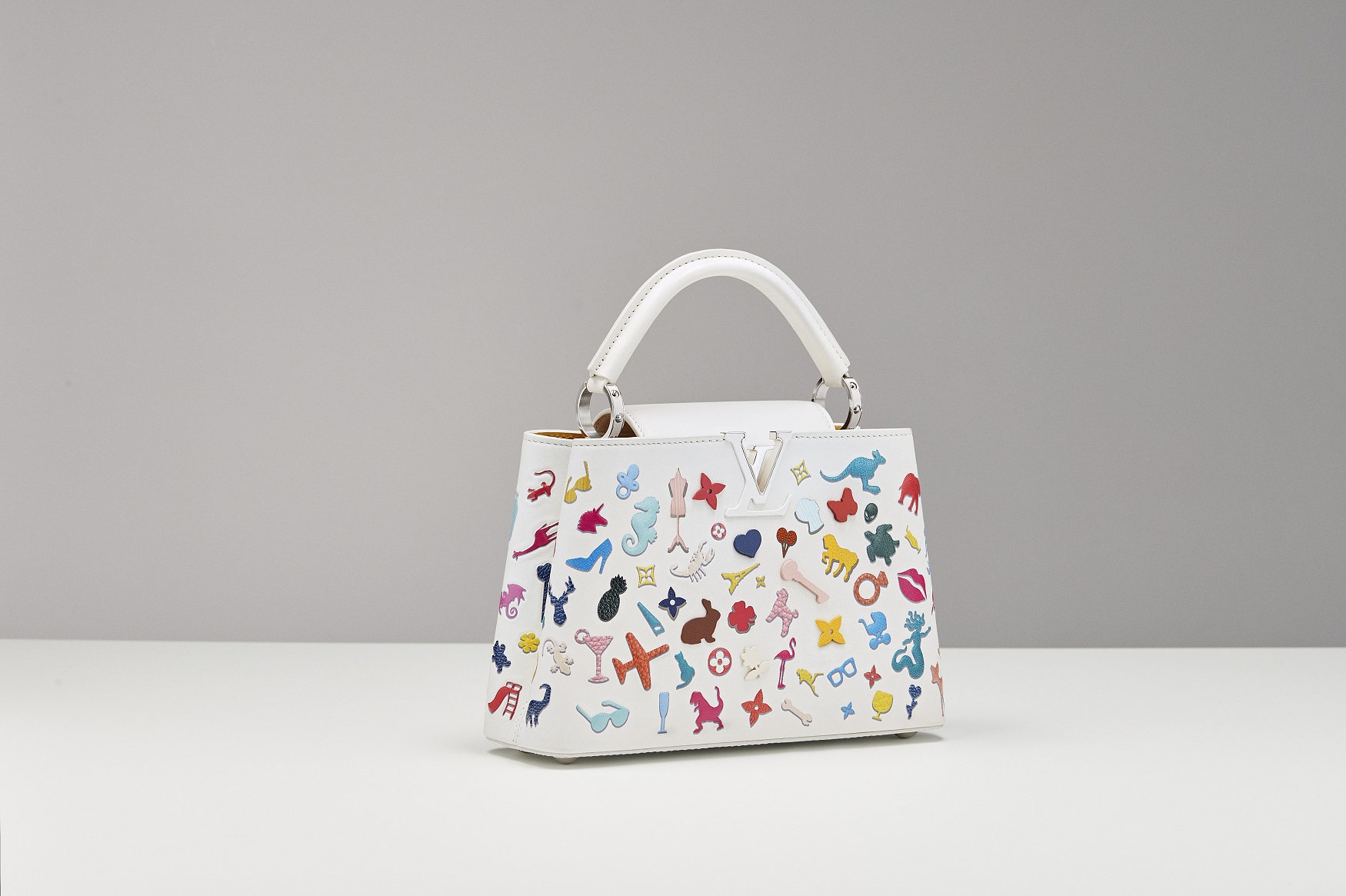 Ispirato alla sua serie del 2019 Quasi Tutto, delicate disposizioni di piccoli e fragili oggetti di carta ritagliata, la Capucines misura BB di Vik Muniz affascina grazie al suo aspetto giocoso, la meravigliosa stratificazione strutturale e gli esuberanti effetti trompe l’oeil. Le 154 icone divertenti e luminose che caratterizzano ogni borsa, da una teiera a un ananas, per arrivare ad un elefante e infine al fiore Monogram Louis Vuitton, sono posizionate casualmente sulla pelle bianca. Alcuni sono aggiunti utilizzando la stampa a getto d’inchiostro in rilievo, mentre altri sono ricamati utilizzando tecniche di intarsio e realizzati con pelle Heritage recuperata dai laboratori Louis Vuitton, un approccio in linea con la pratica artistica ecologicamente responsabile di Muniz.