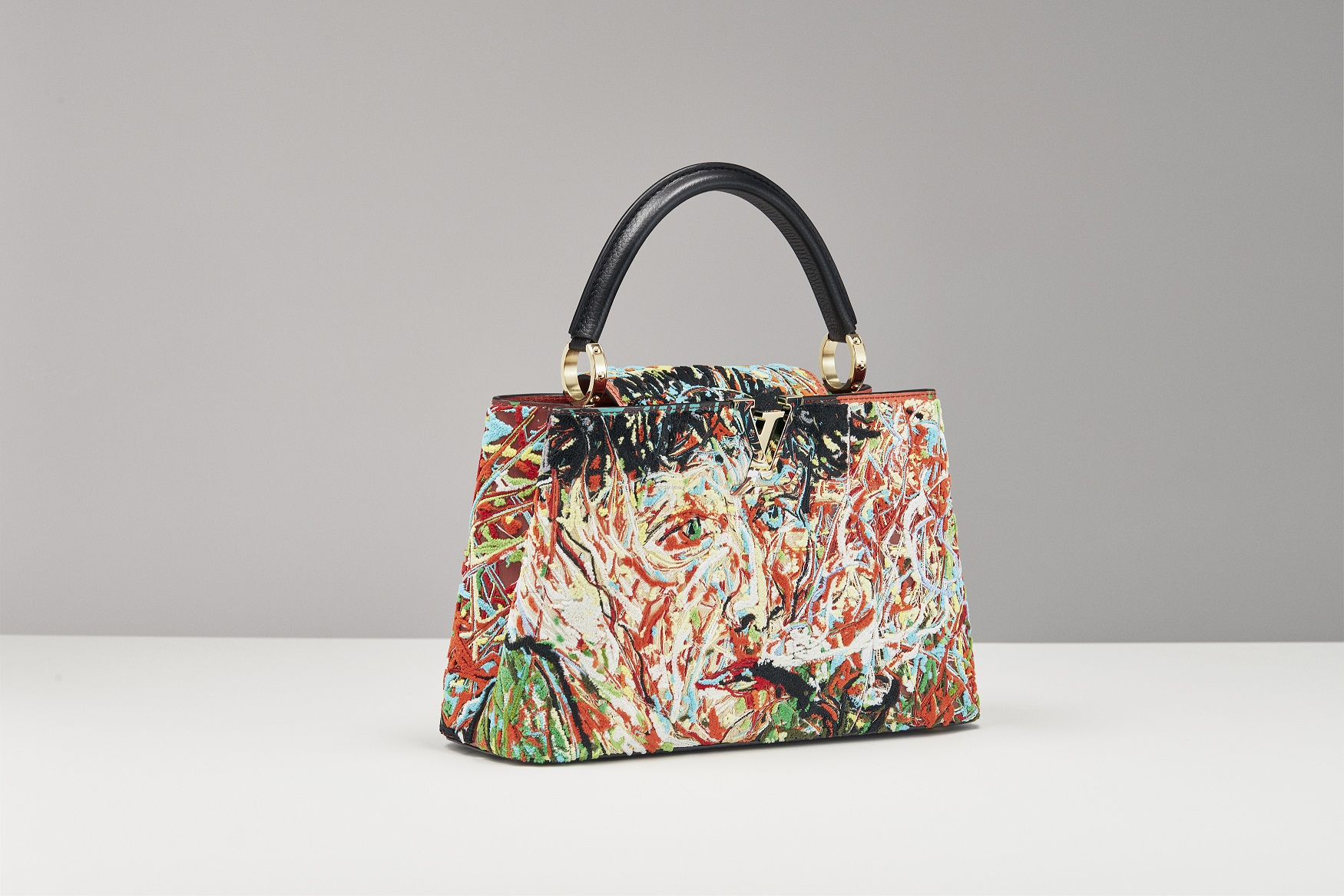 La Capucines di Zeng Fanzhi si basa su una drammatica reinterpretazione di un autoritratto di Vincent Van Gogh che ha originariamente creato nel 2017. Il complesso processo di trasferimento di questa immagine vivida e altamente pittorica sulla superficie della pelle della borsa è iniziato creando un motivo che ha richiesto il lavoro meticoloso di 3 artigiani altamente qualificati e 10 giorni per il suo completamento, in modo che potesse essere impiegata un’ampia varietà di tecniche di ricamo, incluso il tufting di filati di ciniglia. La superficie 3D materica e tattile riproduce fedelmente le pennellate dense e sofisticate di Zeng e l’esuberante stratificazione della vernice in fili di 42 colori diversi e oltre 700.000 punti di ricamo.