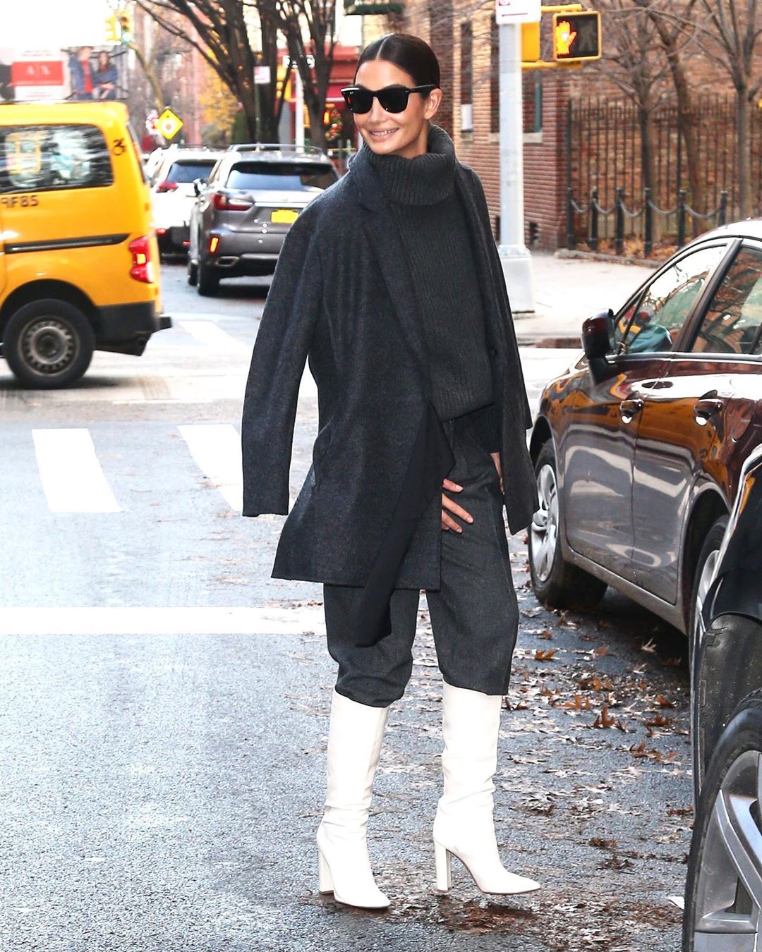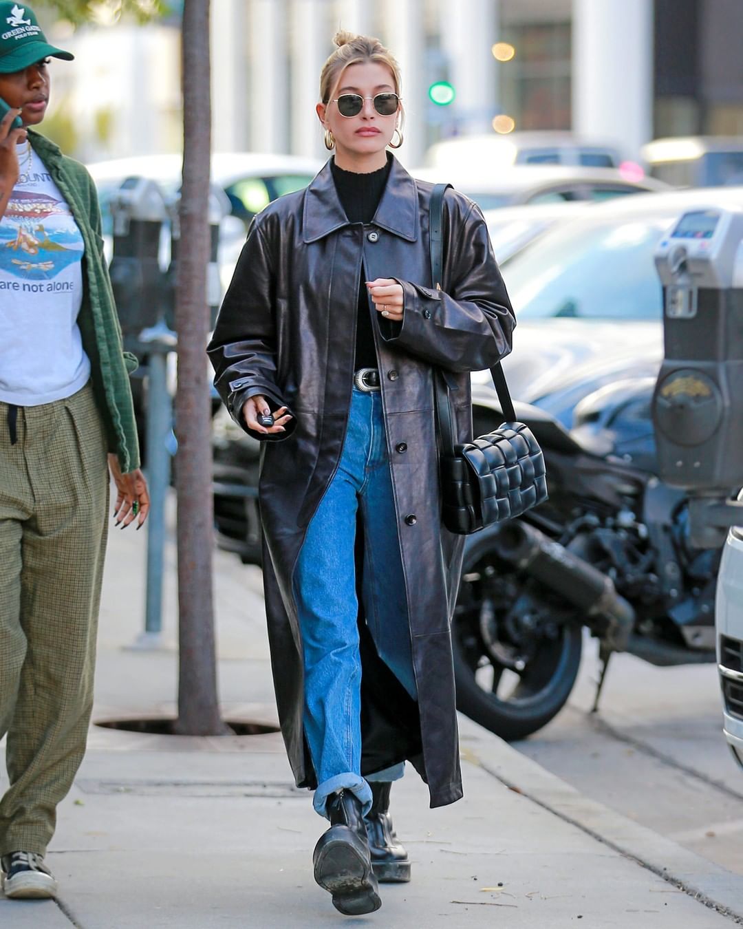 Hailey Bieber è un’icona di stile e quindi…è cool con tutti gli abbinamenti! Amiamo il primo outfit composto da mom fit jeans piegati sul fondo, trench oversize in pelle e combat boots e borsa Bottega Veneta. Nel secondo caso invece a far da padrone sono i pantaloni oversize in vinile con stivali a punta con tacco. Il tocco di stile? La felpa college oversize