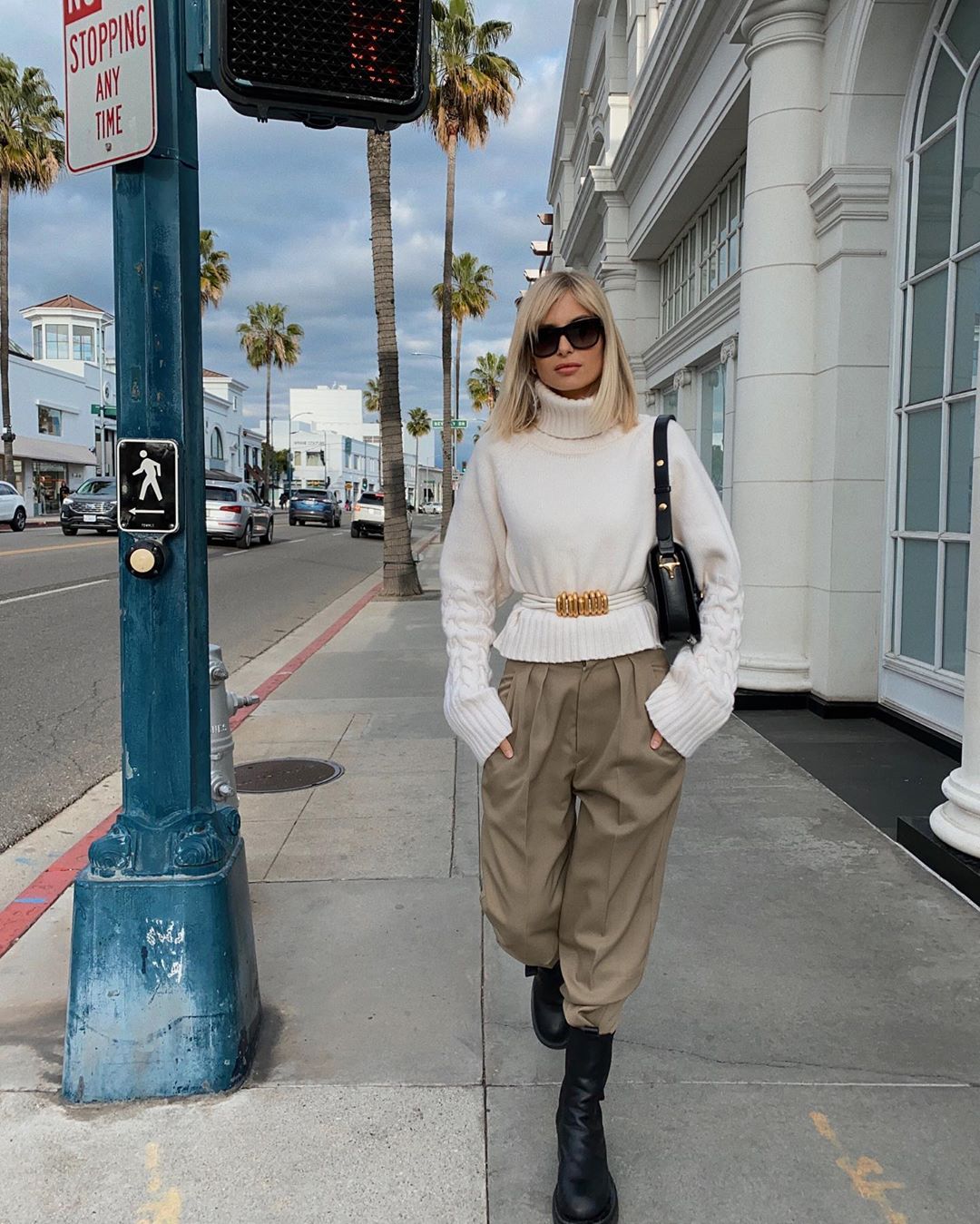 Ma come si indossa? La prima regola per replicare questo look consiste nello scegliere dei pantaloni larghi, preferibilmente mom fit o bootcut. Nel primo caso portateli dentro un paio di combat boots con platform a calza o stringati, nel secondo con stivali più a punta e tacco sottile. Per quanto riguarda le texture scegliete il jeans o il cotone grezzo per i pantaloni e la pelle o il camoscio per gli stivali. Chiara Ferragni adora indossare i boots con la tuta ad esempio, altro look incredibilmente cool ma…adatto a pochi! Elsa Hosk invece o Negin Mirsalehi invece optano per i jeans, l’una in versione più casual, l’altra più raffinata e in palette nude. Ok, ok passiamo alla pratica, ecco qui un po’ di outfit inspo per indossare la combo pantaloni oversize + boots come lo fanno le celebs: