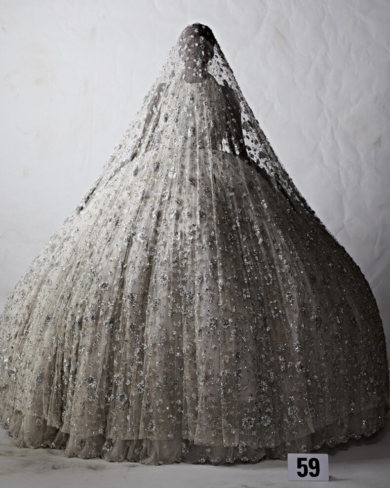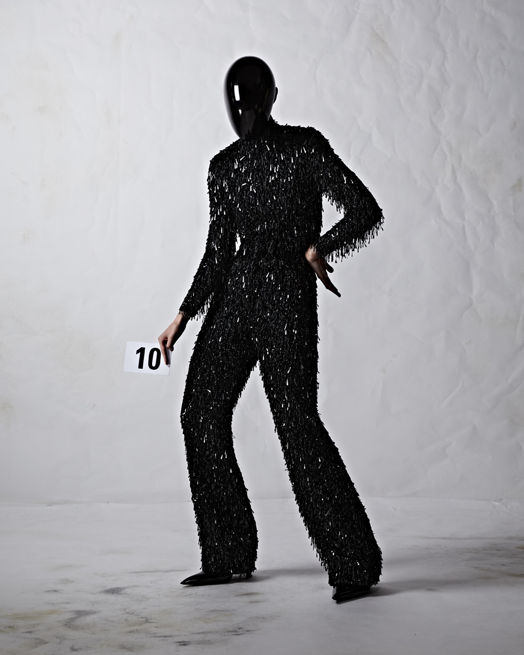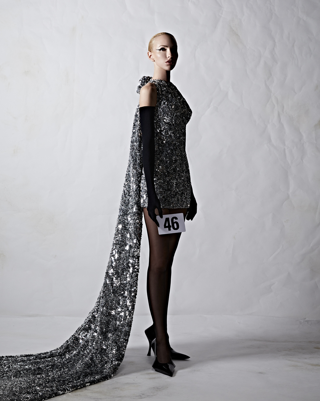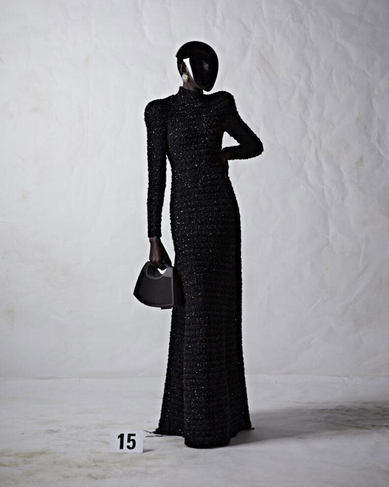 Una porta a doppia anta ricoperta da specchi, come un portale, apre la collezione couture di Balenciaga ideata da Demna Gvasalia – da questo momento esclusivamente Demna per distinguere il suo ruolo creativo dalla sua vita privata – per l’Autunno Inverno 2022. Il designer di nazionalità tedesca di origini georgiane ha raffigurato quella che potremmo definire cyborg couture, il trionfo del black and white e delle scintillanti applicazioni tra cristalli e paillettes. I look sembrano diventare una seconda pelle ed il neoprene giapponese un nuovo materiale d’alta moda, quest’ultimo è interpretato come versione 2.0 del gazar di seta usato da Cristóbal Balenciaga.