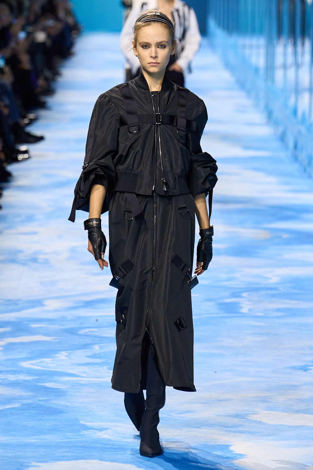 Chiuri ha saputo fondere in un mashup unico antiche influenze con uno stile contemporaneo, creando collegamenti tra il peplo dell’antica Grecia e il rigoroso taglio sartoriale di Dior. Linee dinamiche e agili hanno dominato la collezione, con body sotto abiti trasparenti, blazer abbinati a pantaloni sportivi e giacche accessoriate con cinture a paracadute. Ai piedi delle modelle, stivali gladiatore alti fino al ginocchio hanno ribadito il tema della forza.
