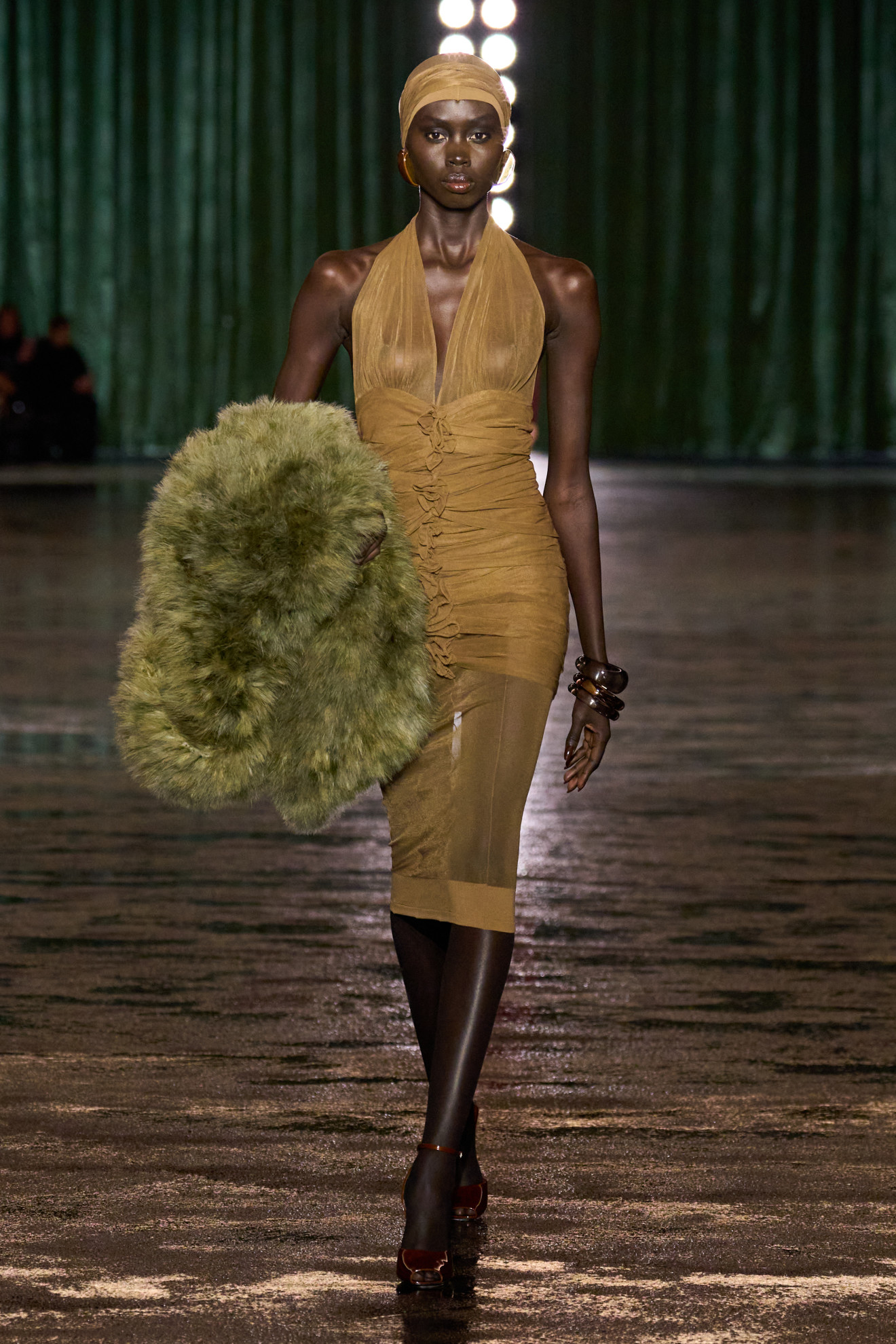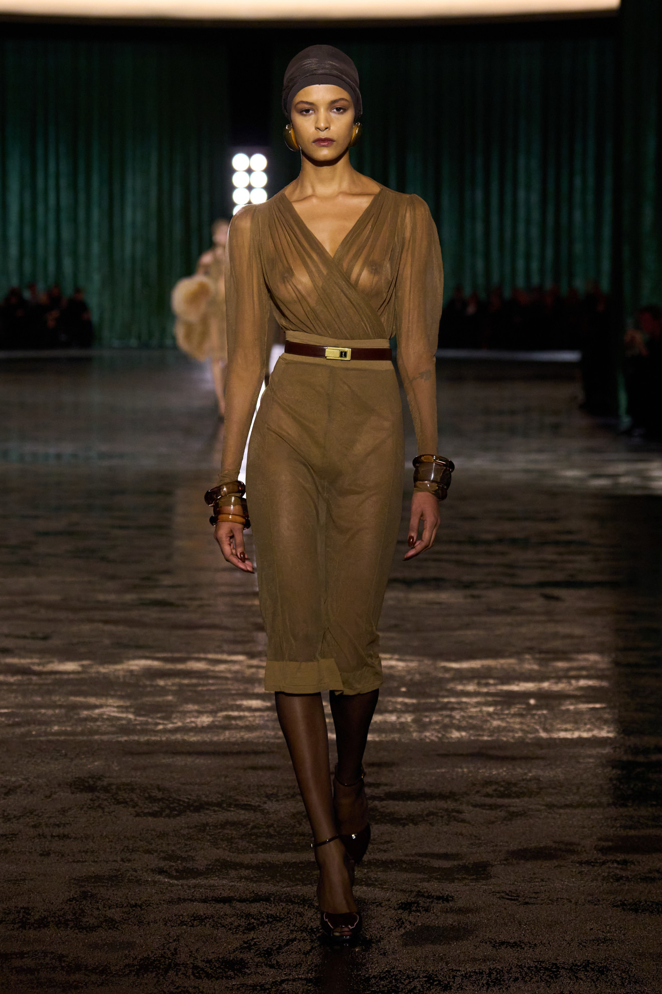 Le icone di Saint Laurent sono state rivisitate, i capi sartoriali diventano decisamente più fluidi – dalla giacca in crepe georgette al leggerissimo cappotto impreziosito dalle piume di marabù. Il tema della trasparenza, reinterpretato in chiave contemporanea, si estende ai gioielli scultorei di vetro, che evocano più una forma astratta che una forma concreta, mentre la location – molto simile ad un boudoir – ci trasporta in un regno così intimo e segreto.
