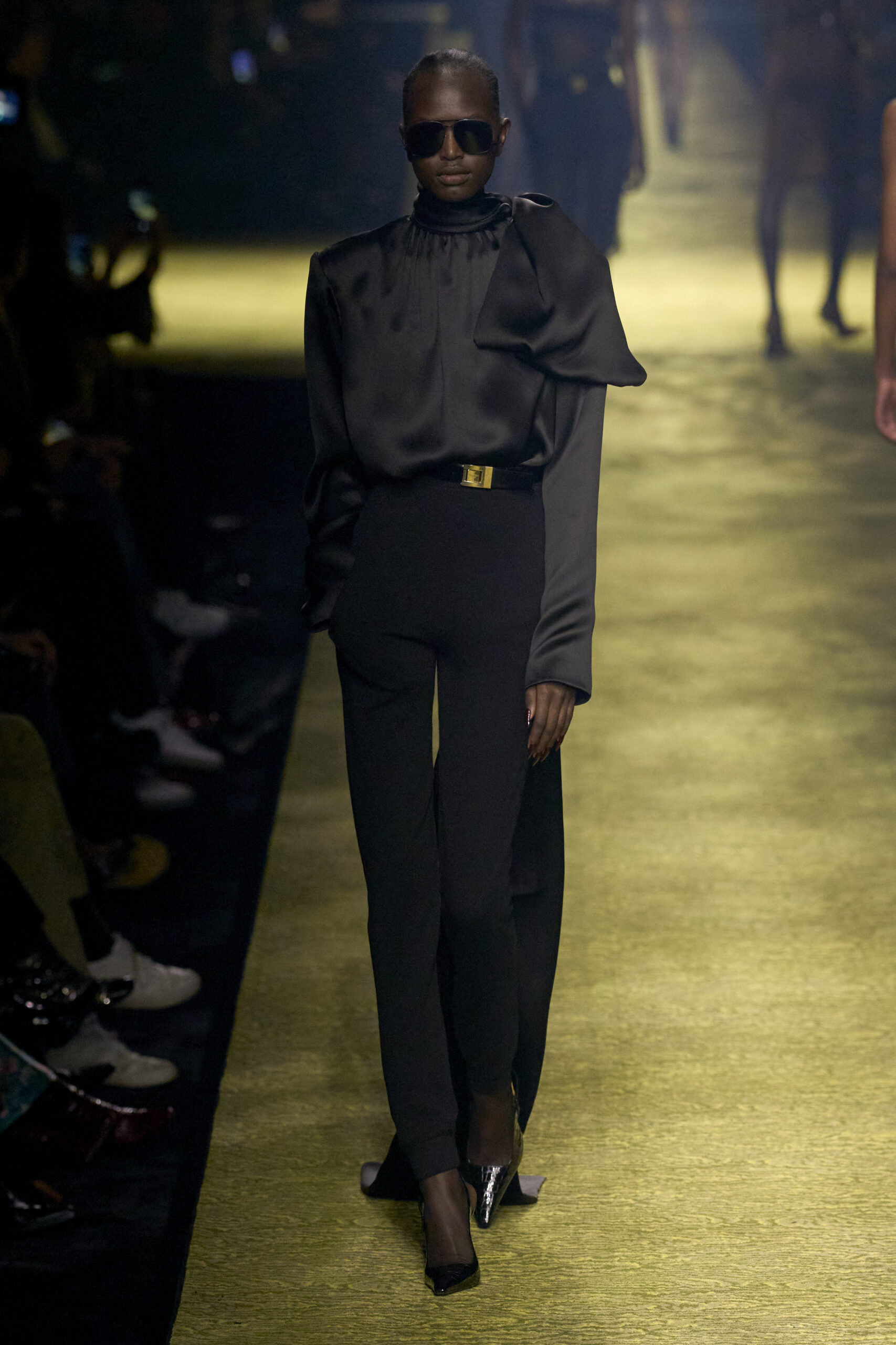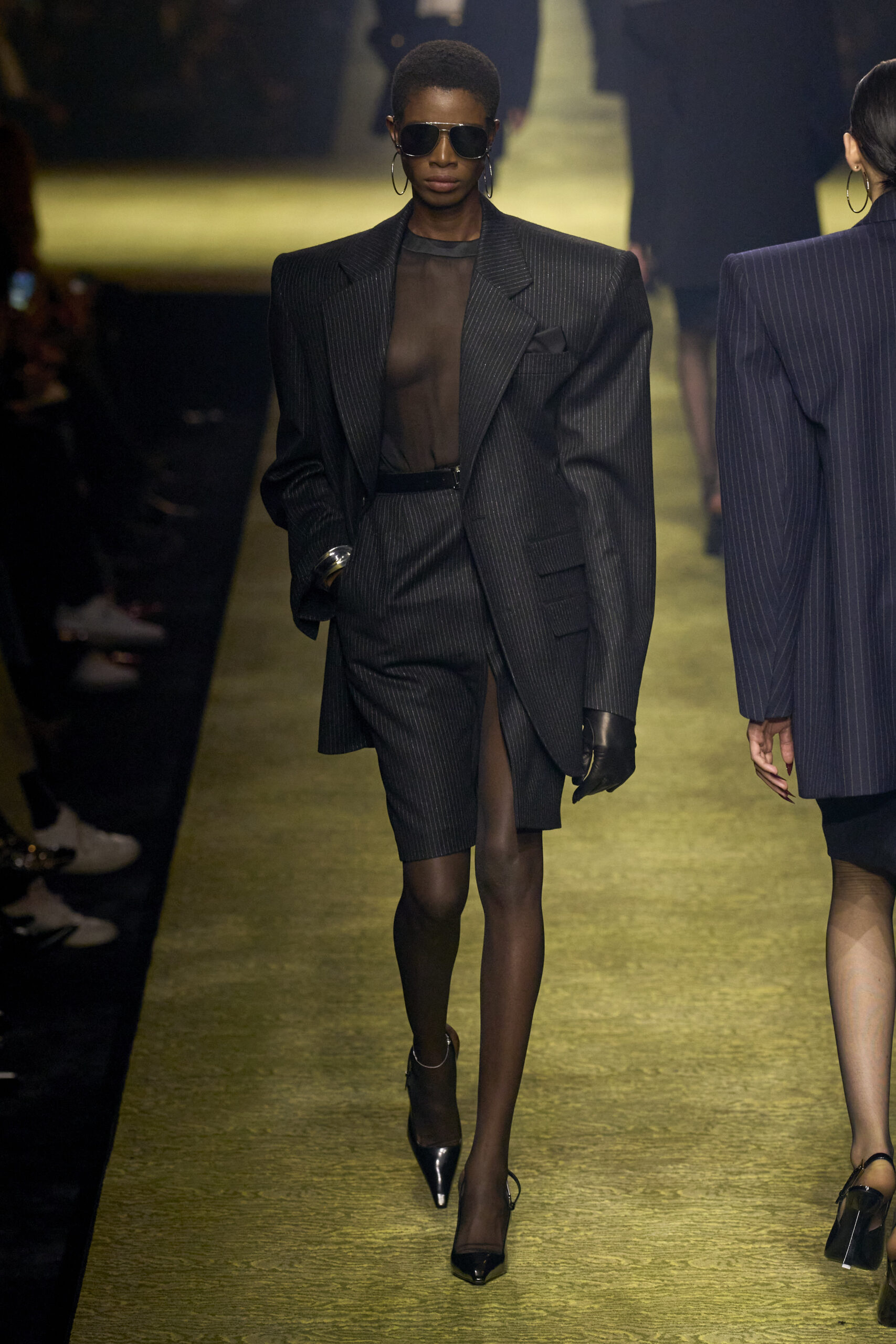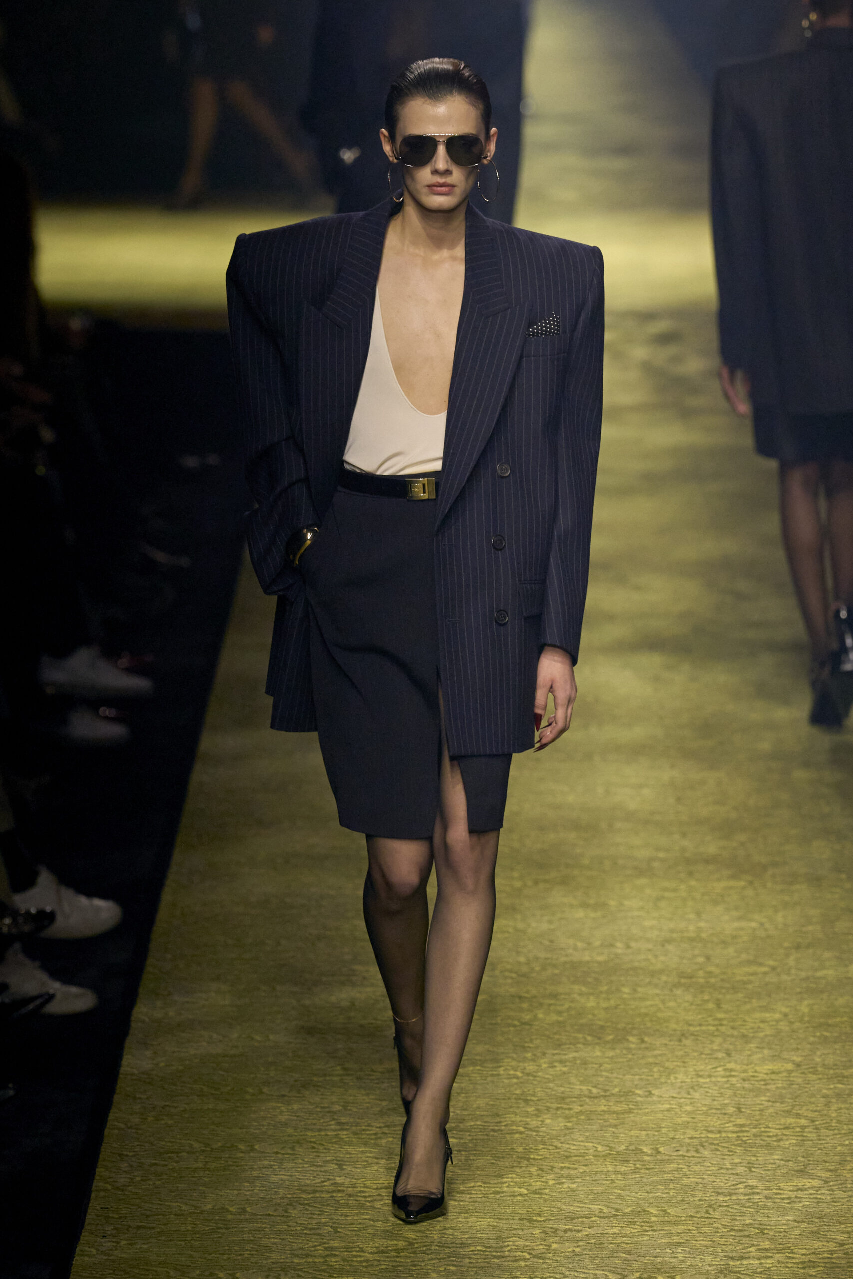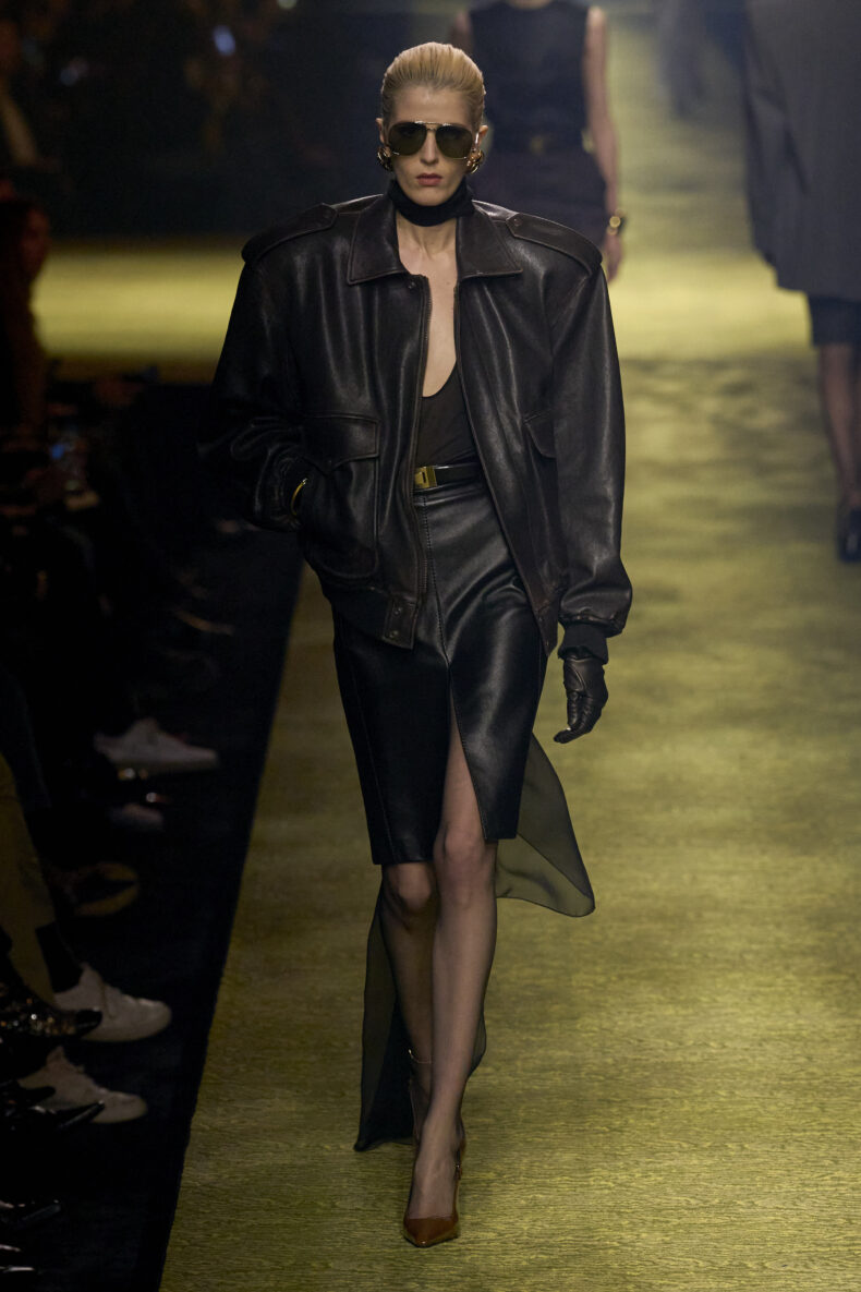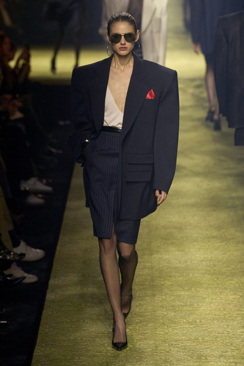 Tailleur, blazer oversize, drappeggi, poi sensualissimi abiti dalle incredibili trasparenze e fibbie dorate, sino ai guanti in pelle e alle décolleté dai vertiginosi tacchi a spillo.