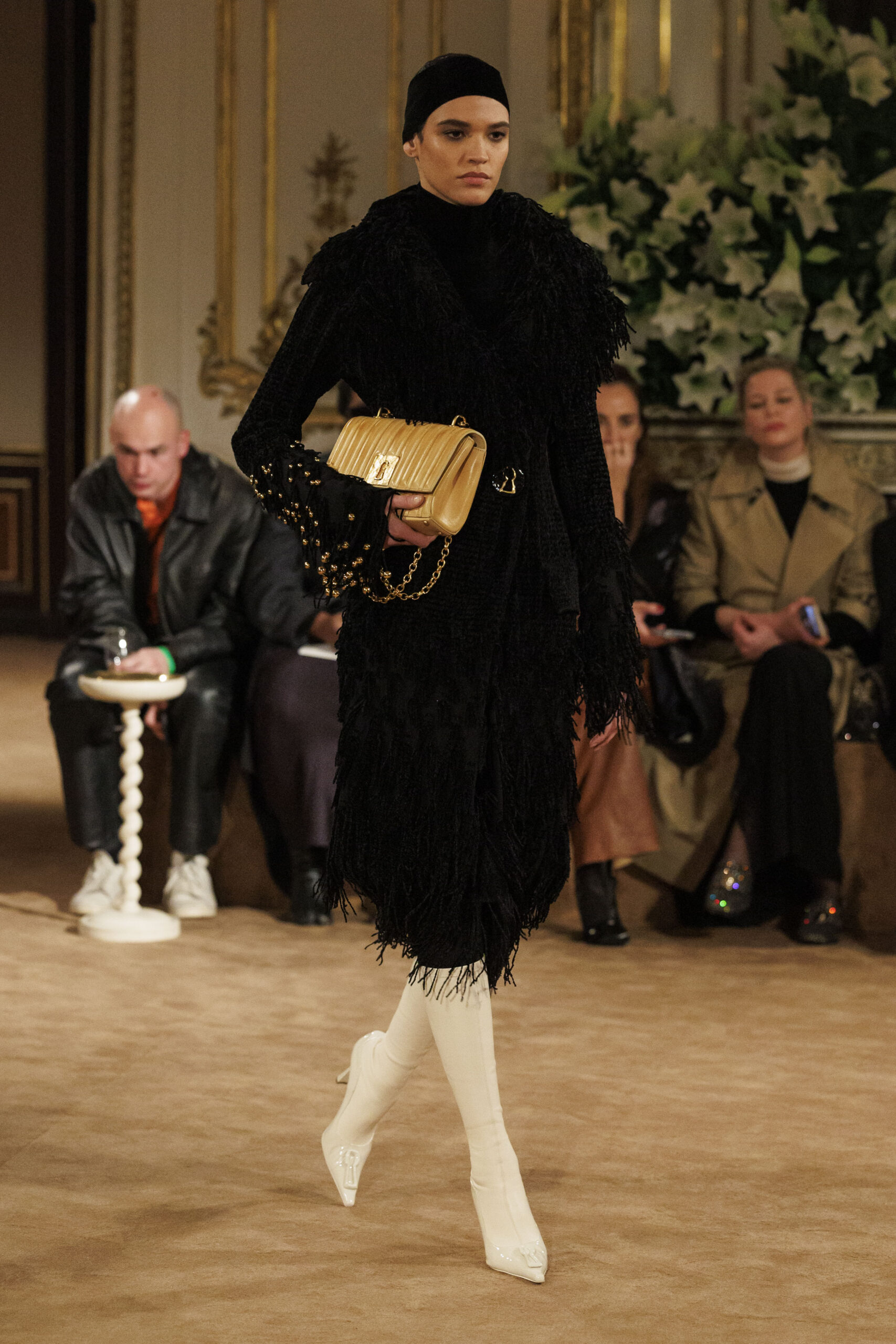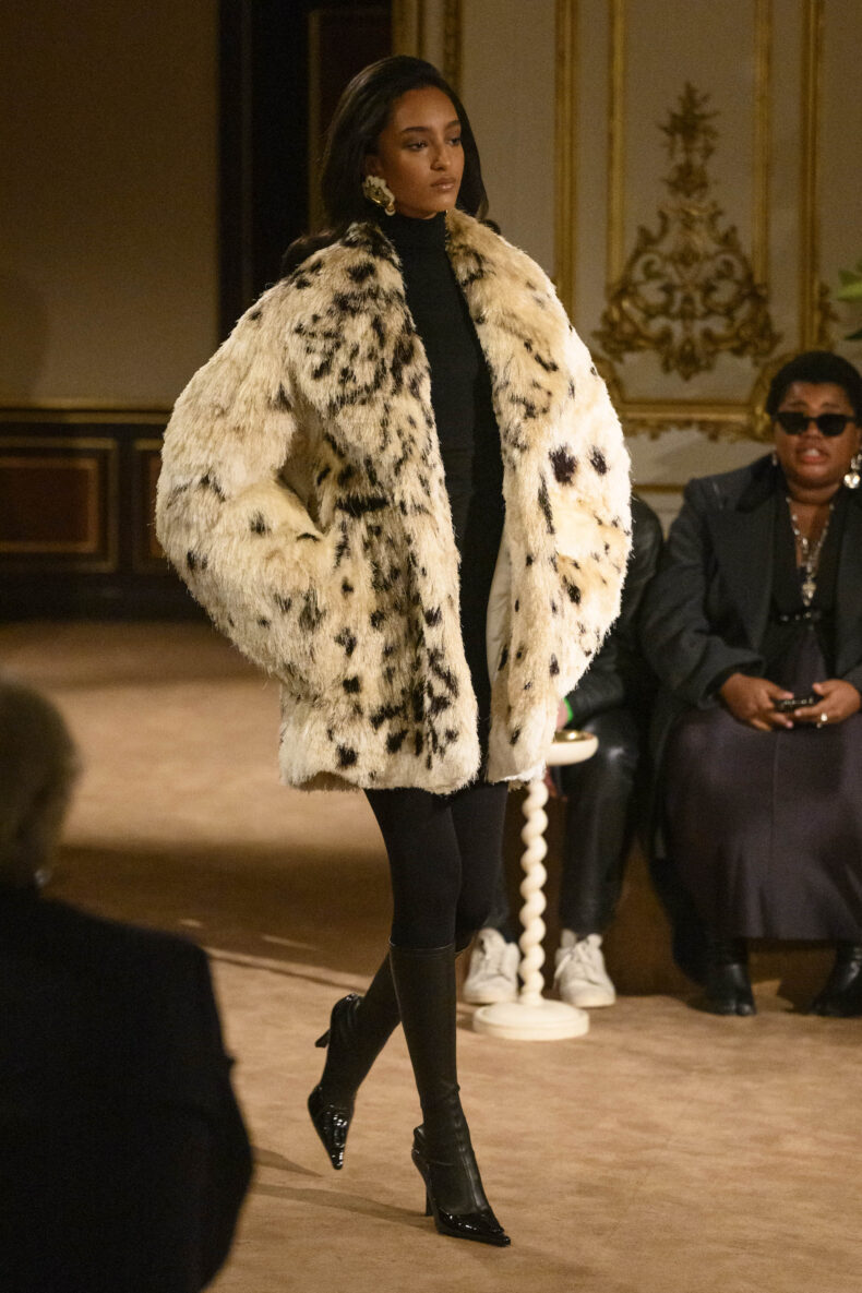 L’immaginario di Roseberry si presenta al pubblico con un guardaroba completo, che va dalle camicie in popeline ai corti abiti da cocktail in velluto, con una grande varietà di accessori e calzature emblematici. Il giovane couturier ha mantenuto fedelmente l’estetica creata in questi tre anni di lavoro, caratterizzata da bottoni dorati a forma di buco di serratura, riferimenti anatomici e dettagli del nastro da sarta, simboli di un immaginario ben definito. Invece, tra le borse, riconosciamo senza dubbio la Face Bag e una nuova borsa, chiamata Schiap Bag, ovvero una baguette trapuntata con dettagli unici in rilievo.