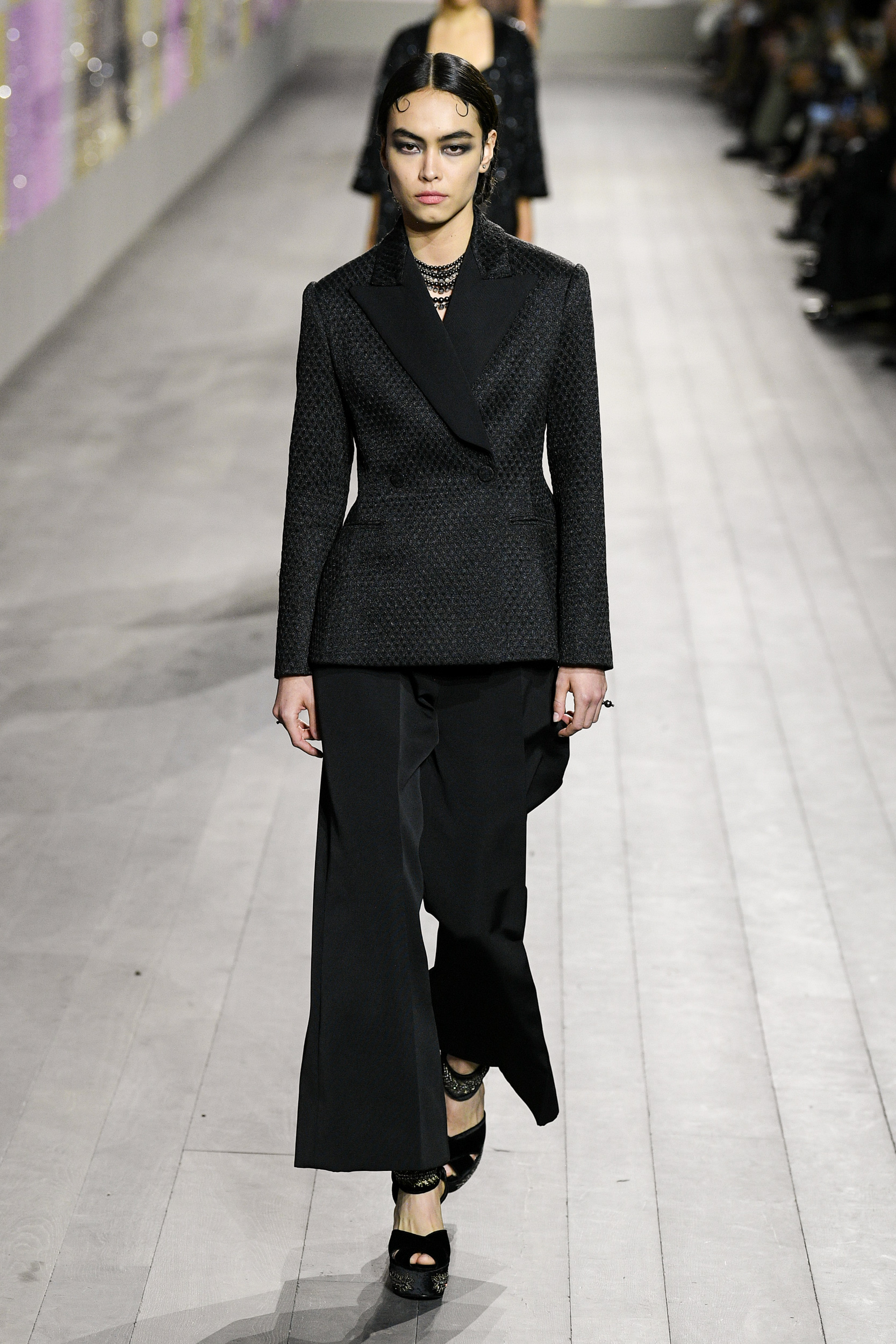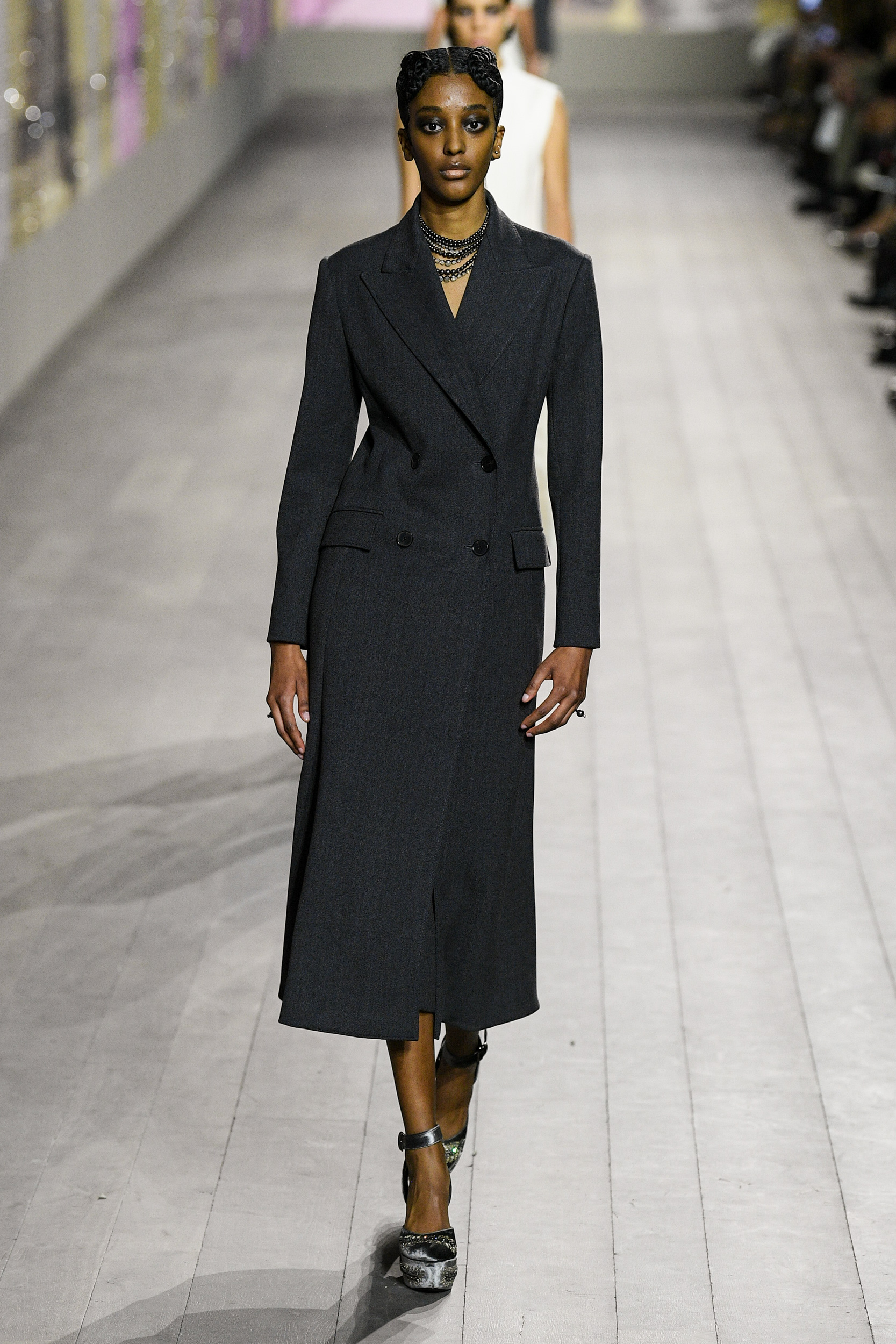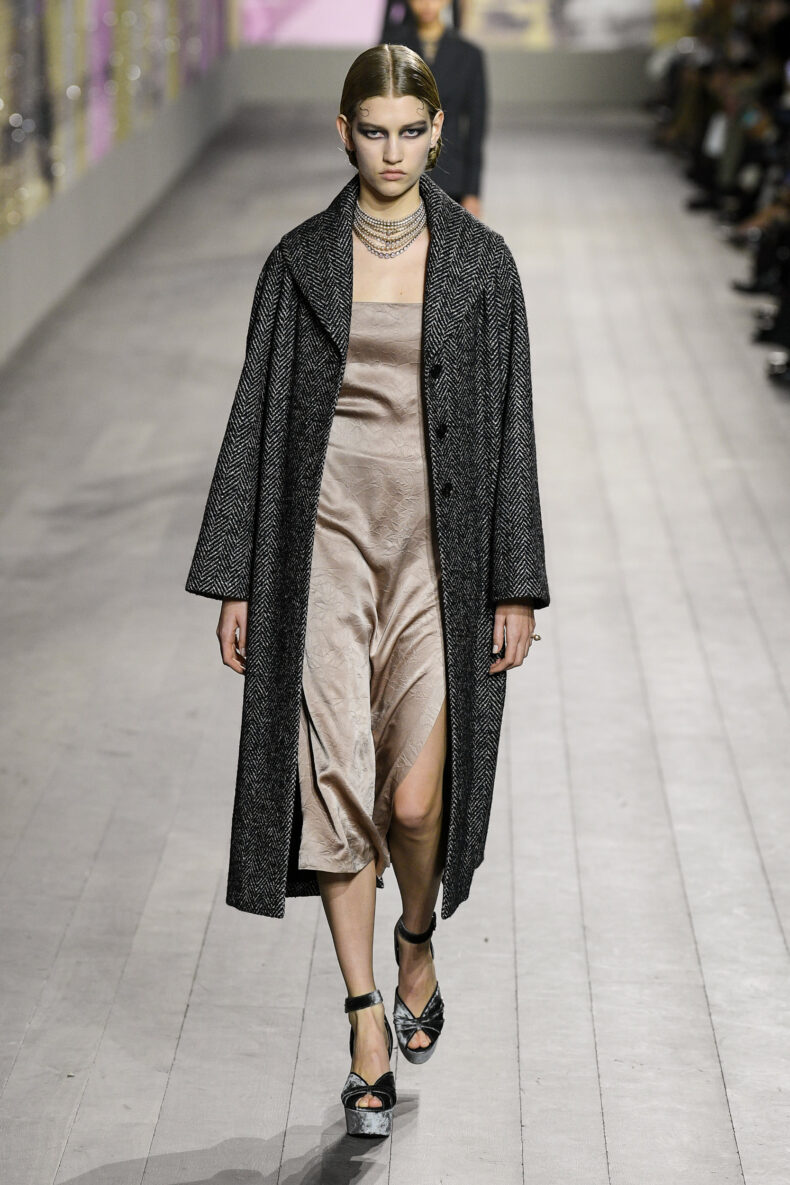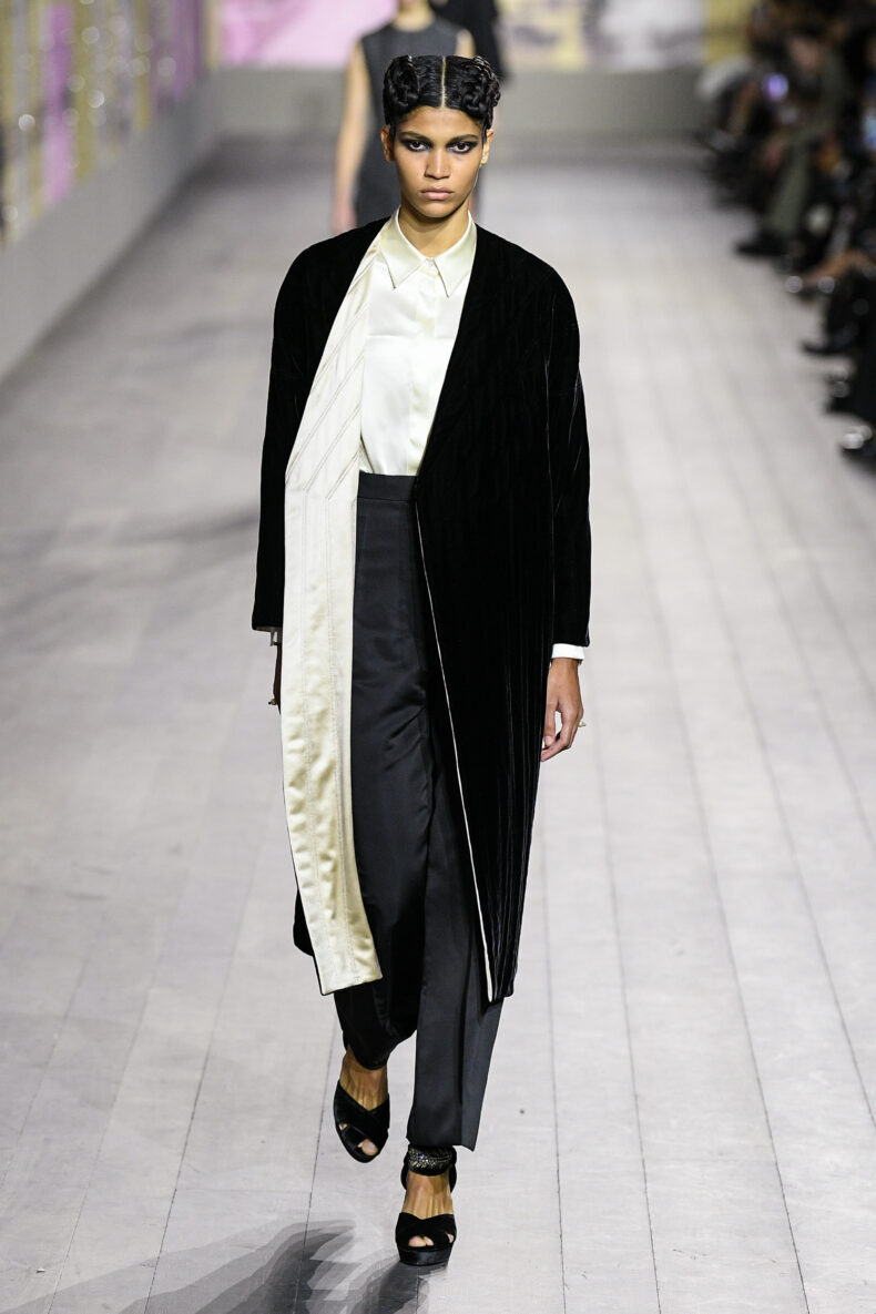 I vestiti sembrano letteralmente accarezzare la silhouette delle modelle in passerella, tra seta e velluto, ricami, dettagli preziosi e frange. I pantaloni invece, sono rigorosamente ampi e morbidi, proprio perché la mission generale resta la leggerezza assoluta. Ritroviamo l’unicità di Monsieur Dior nei cappotti e nei tailleur, creati rigorosamente con i tessuti del classico guardaroba maschile. Questa collezione Alta Moda è un viaggio nel tempo, un omaggio a Joséphine Baker – cantante, ballerina afroamericana arrivata a Parigi dall’America, a metà degli anni Venti. Questo personaggio è stato scelto proprio perché incarnava – in quegli anni – il perfetto ideale di modernità.