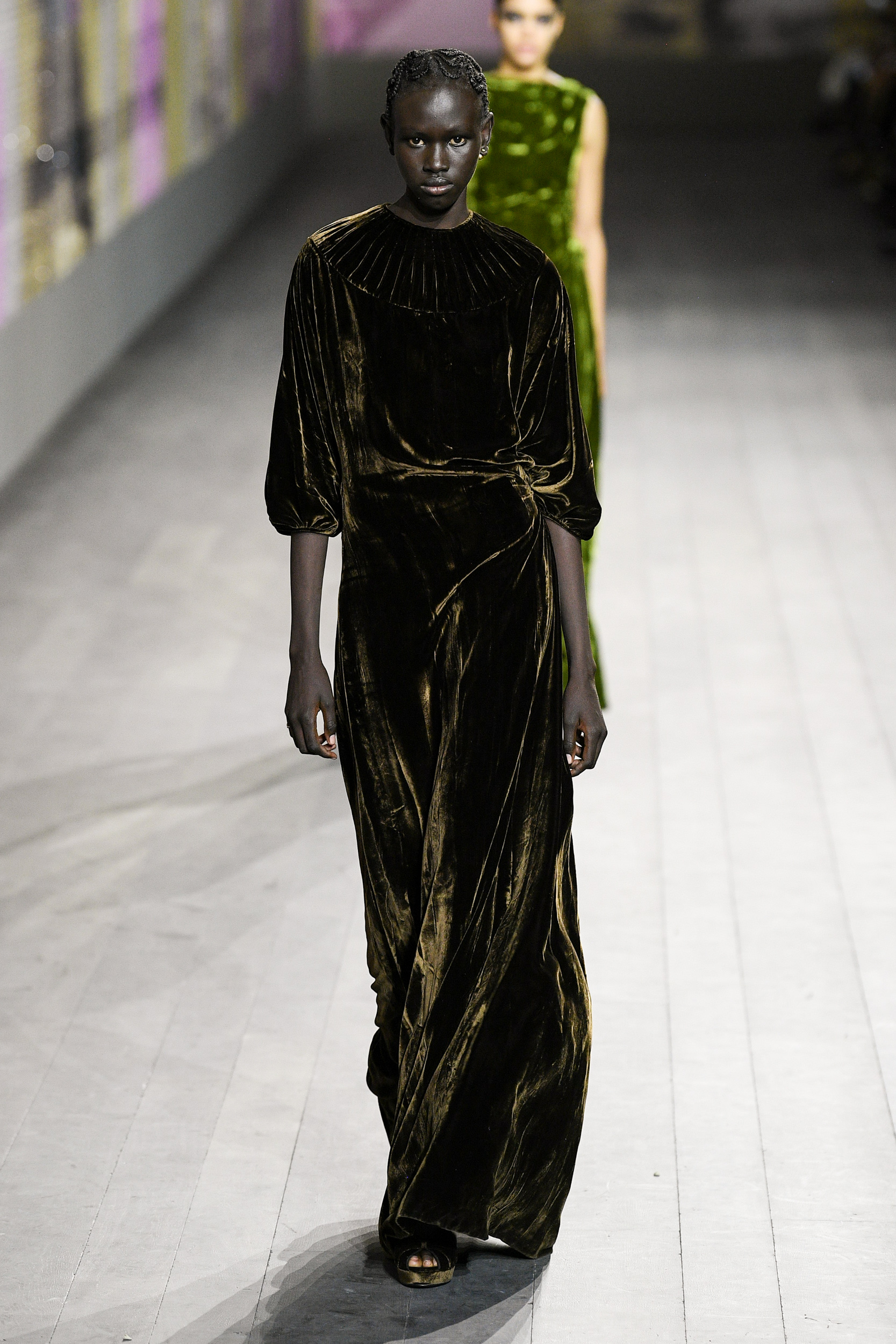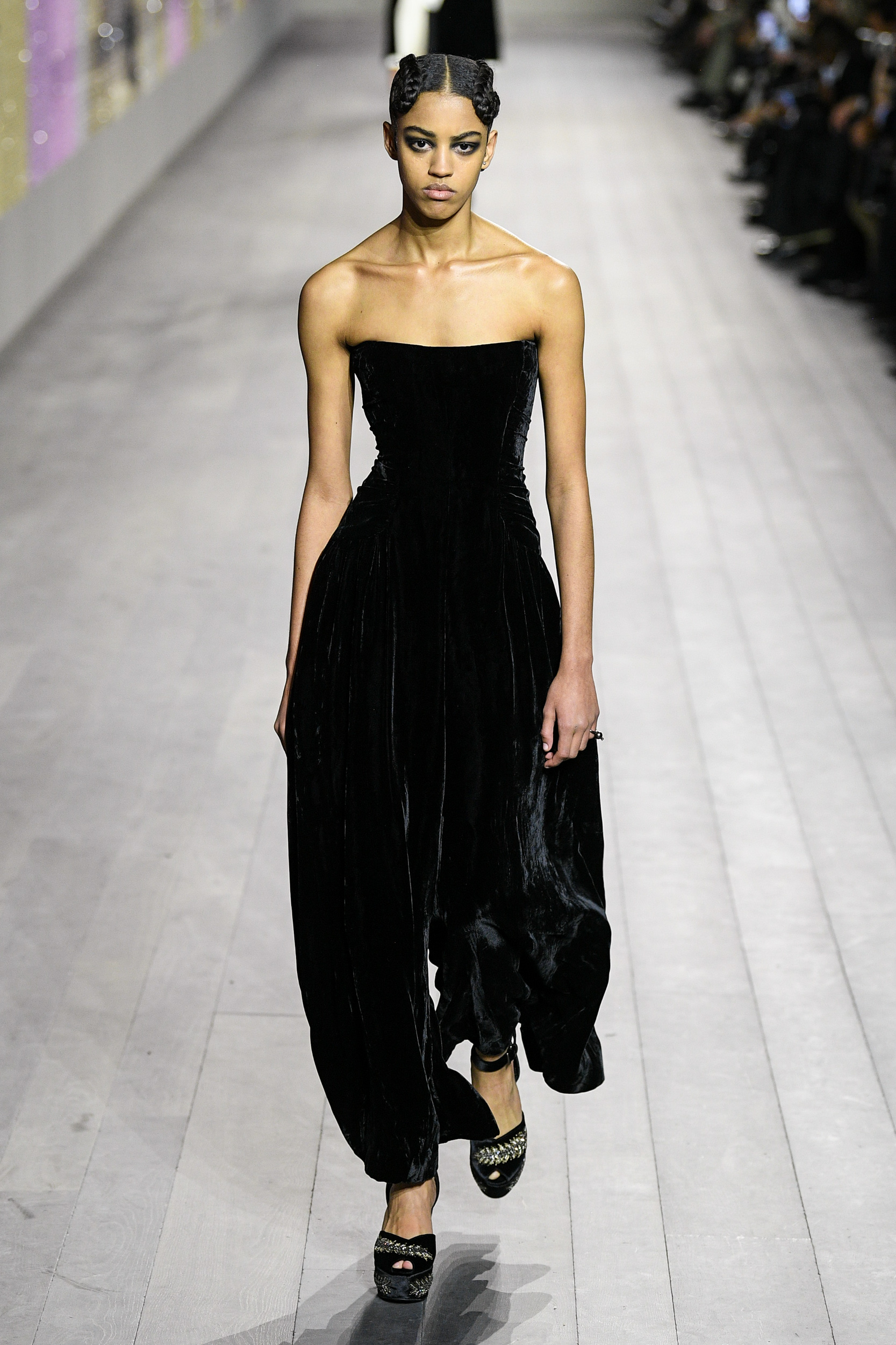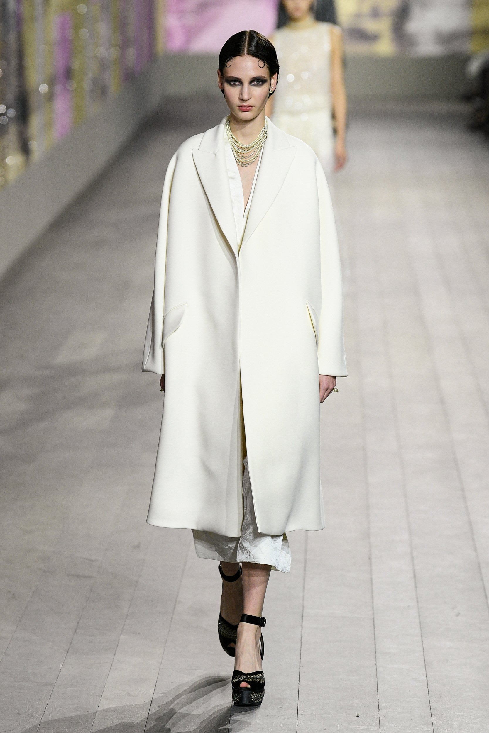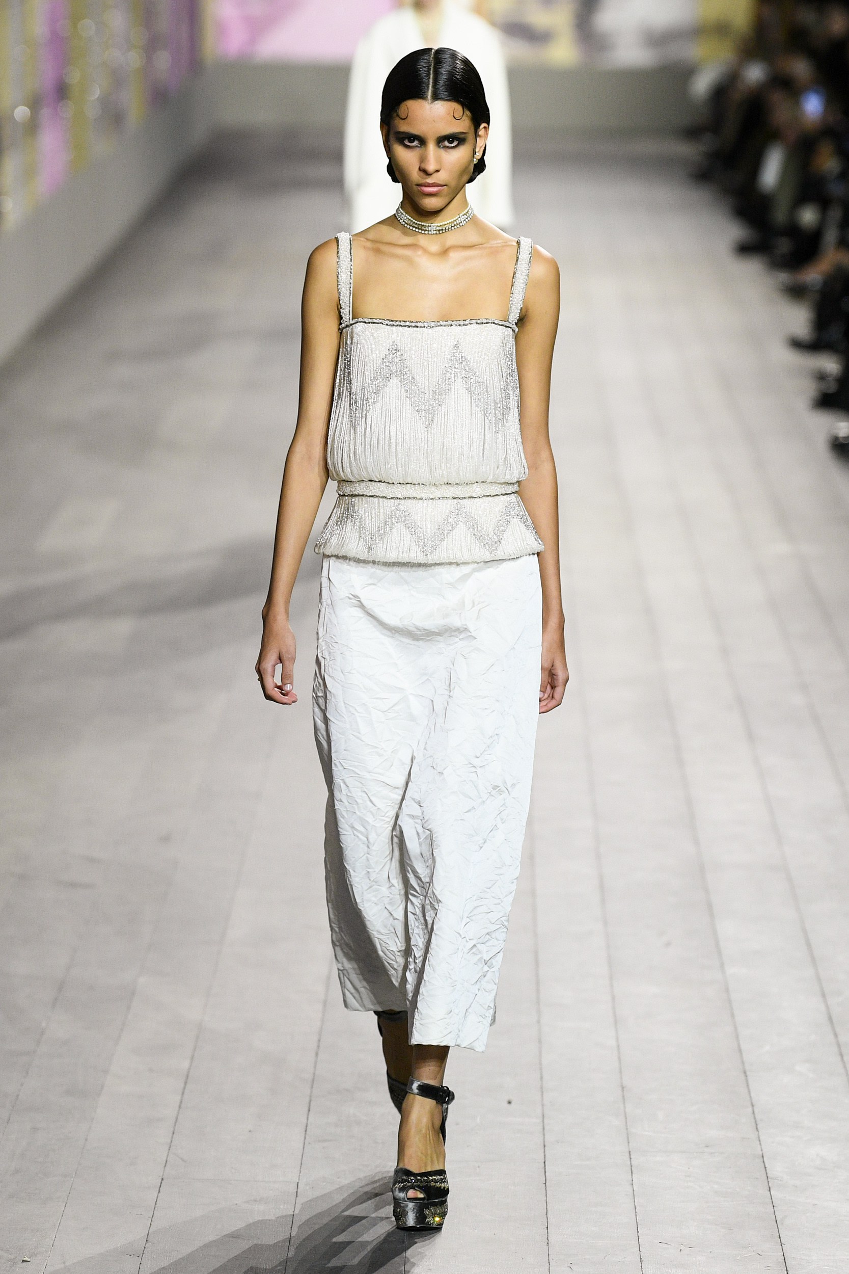 I vestiti sembrano letteralmente accarezzare la silhouette delle modelle in passerella, tra seta e velluto, ricami, dettagli preziosi e frange. I pantaloni invece, sono rigorosamente ampi e morbidi, proprio perché la mission generale resta la leggerezza assoluta. Ritroviamo l’unicità di Monsieur Dior nei cappotti e nei tailleur, creati rigorosamente con i tessuti del classico guardaroba maschile. Questa collezione Alta Moda è un viaggio nel tempo, un omaggio a Joséphine Baker – cantante, ballerina afroamericana arrivata a Parigi dall’America, a metà degli anni Venti. Questo personaggio è stato scelto proprio perché incarnava – in quegli anni – il perfetto ideale di modernità.