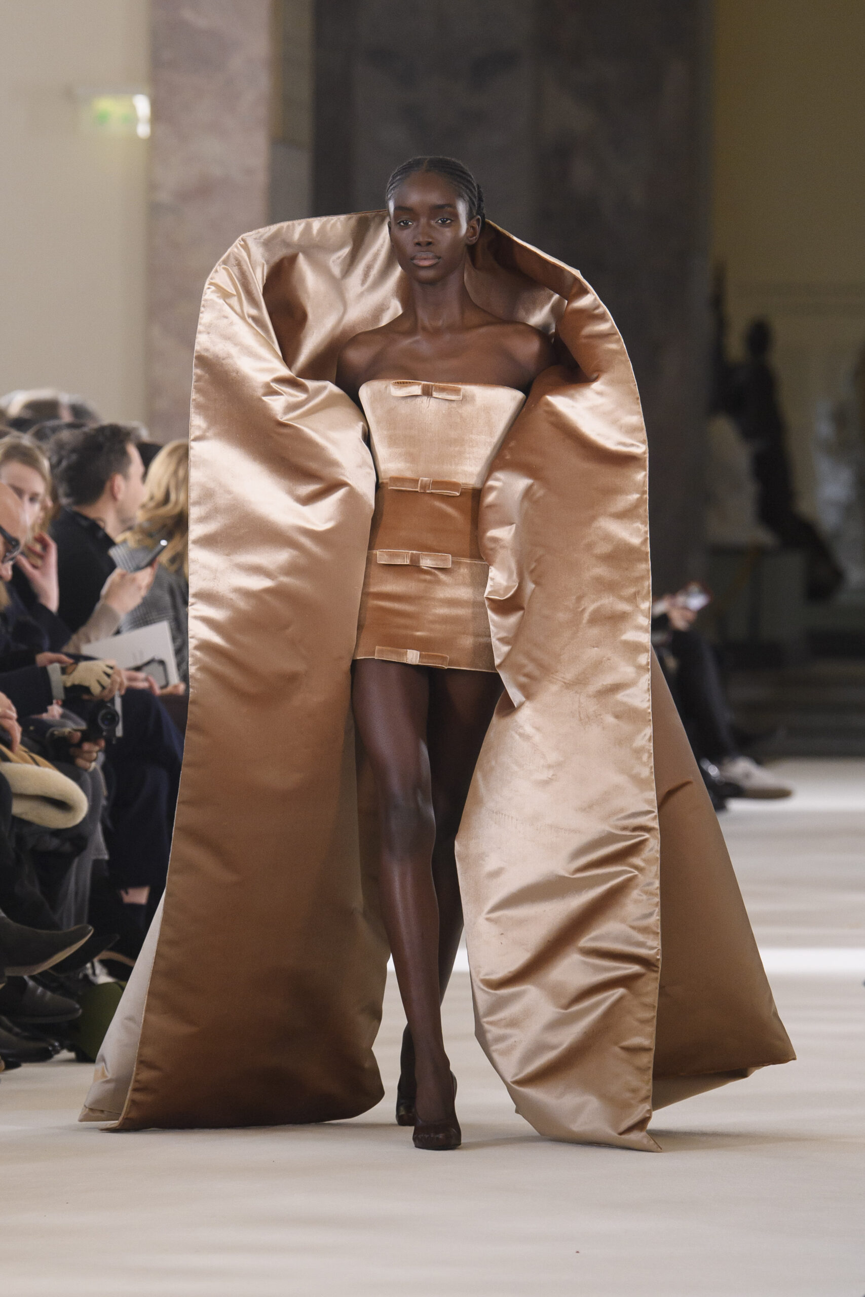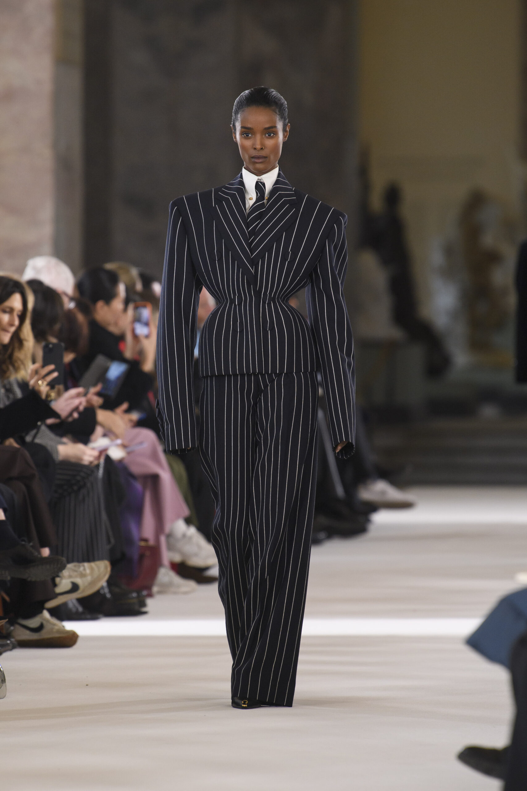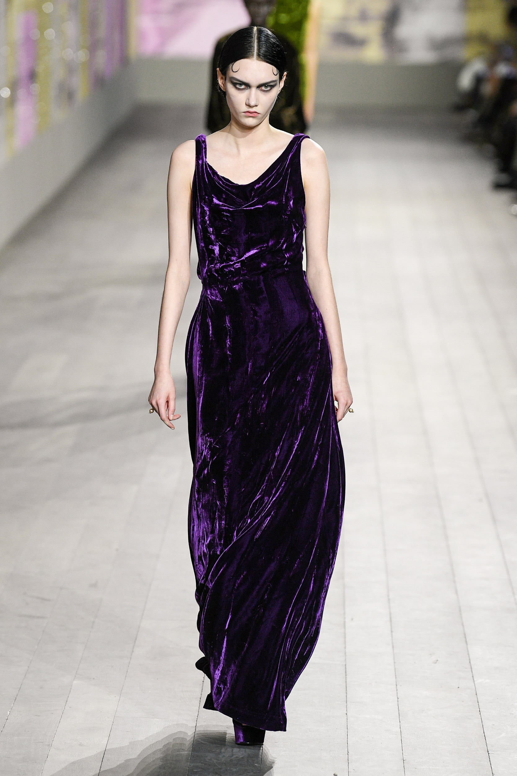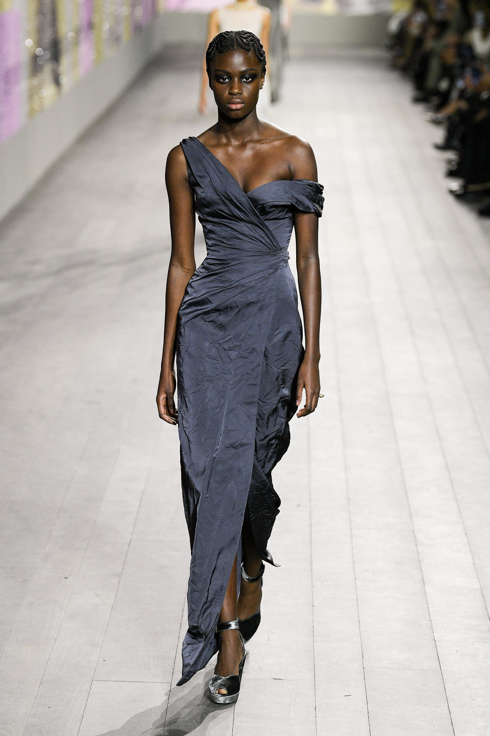 I vestiti sembrano letteralmente accarezzare la silhouette delle modelle in passerella, tra seta e velluto, ricami, dettagli preziosi e frange. I pantaloni invece, sono rigorosamente ampi e morbidi, proprio perché la mission generale resta la leggerezza assoluta. Ritroviamo l’unicità di Monsieur Dior nei cappotti e nei tailleur, creati rigorosamente con i tessuti del classico guardaroba maschile. Questa collezione Alta Moda è un viaggio nel tempo, un omaggio a Joséphine Baker – cantante, ballerina afroamericana arrivata a Parigi dall’America, a metà degli anni Venti. Questo personaggio è stato scelto proprio perché incarnava – in quegli anni – il perfetto ideale di modernità.
