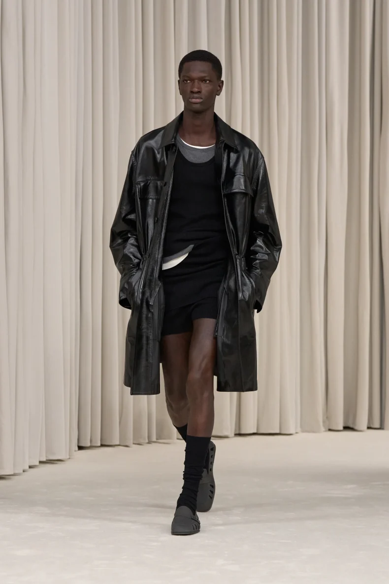 La pioggia impone praticità, ma questo non significa rinunciare all’estetica. I cappelli — bucket in tessuto tecnico, visiere trasparenti o berretti cerati — diventano accessori statement. Anche le borse si adattano al clima: PVC, nylon e materiali trattati dominano la scena, spesso abbinati a silhouette rigorose ed essenziali. Le tote bag si fanno leggere, resistenti, e spesso waterproof, per affrontare la giornata senza rinunciare all’eleganza.