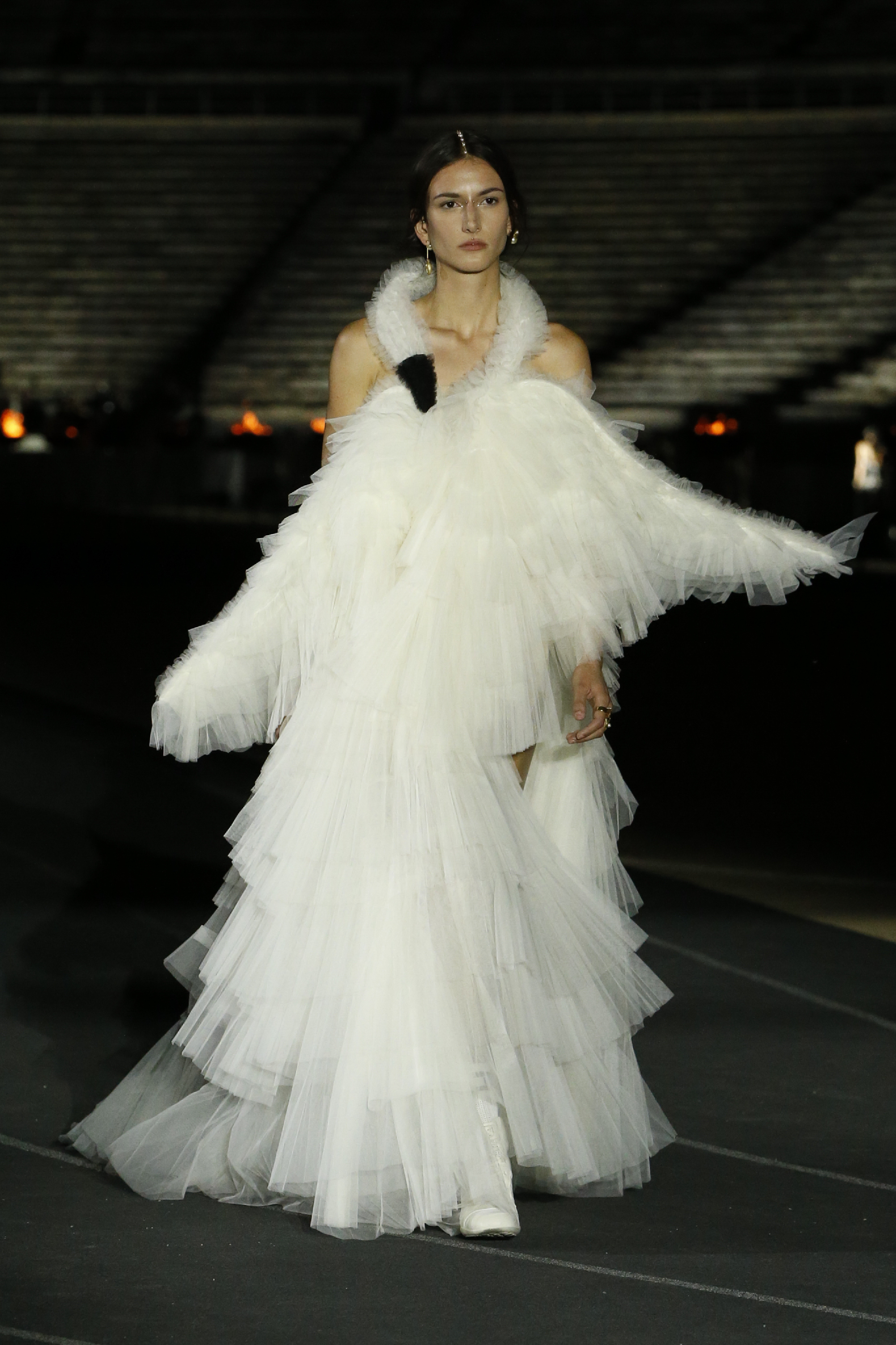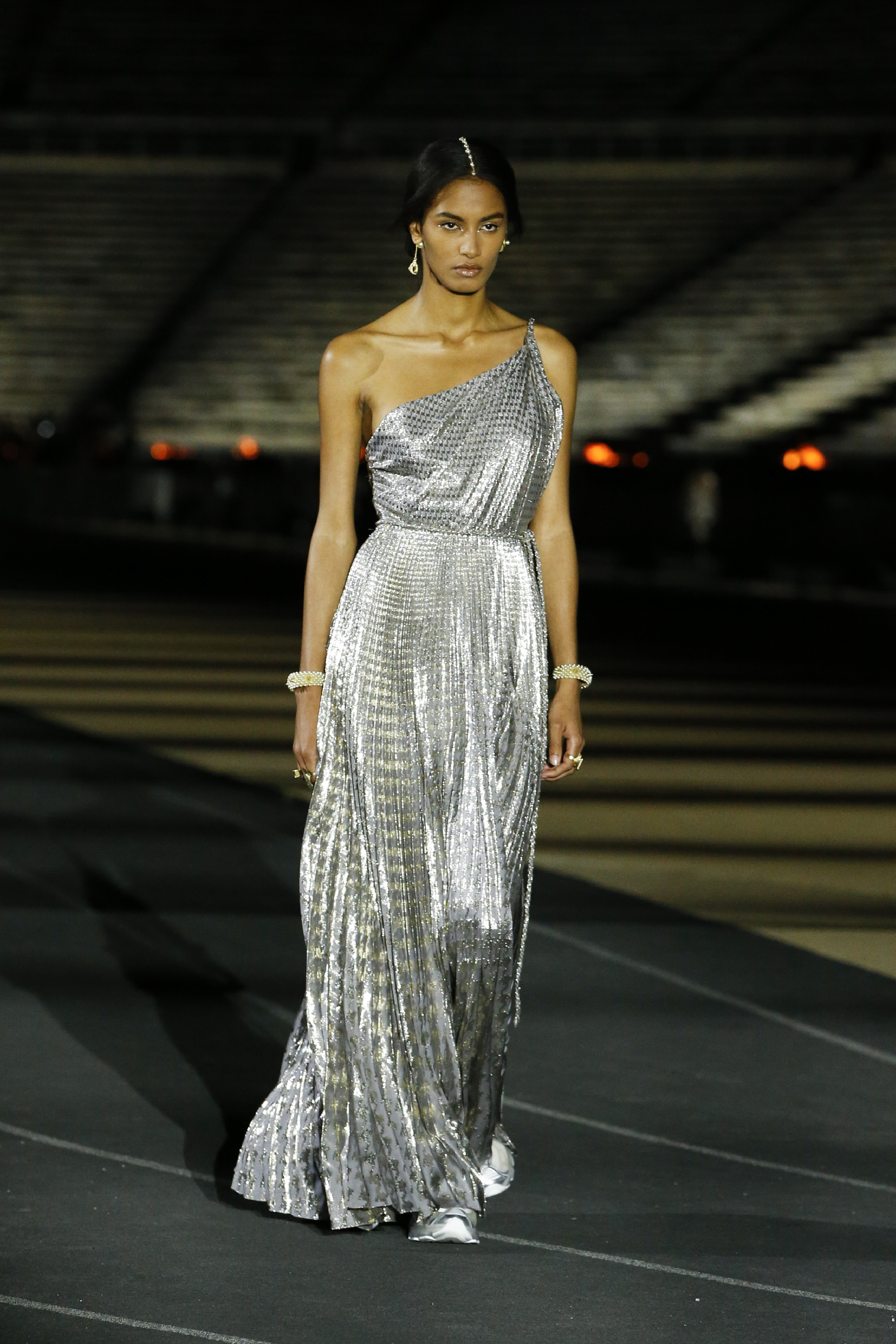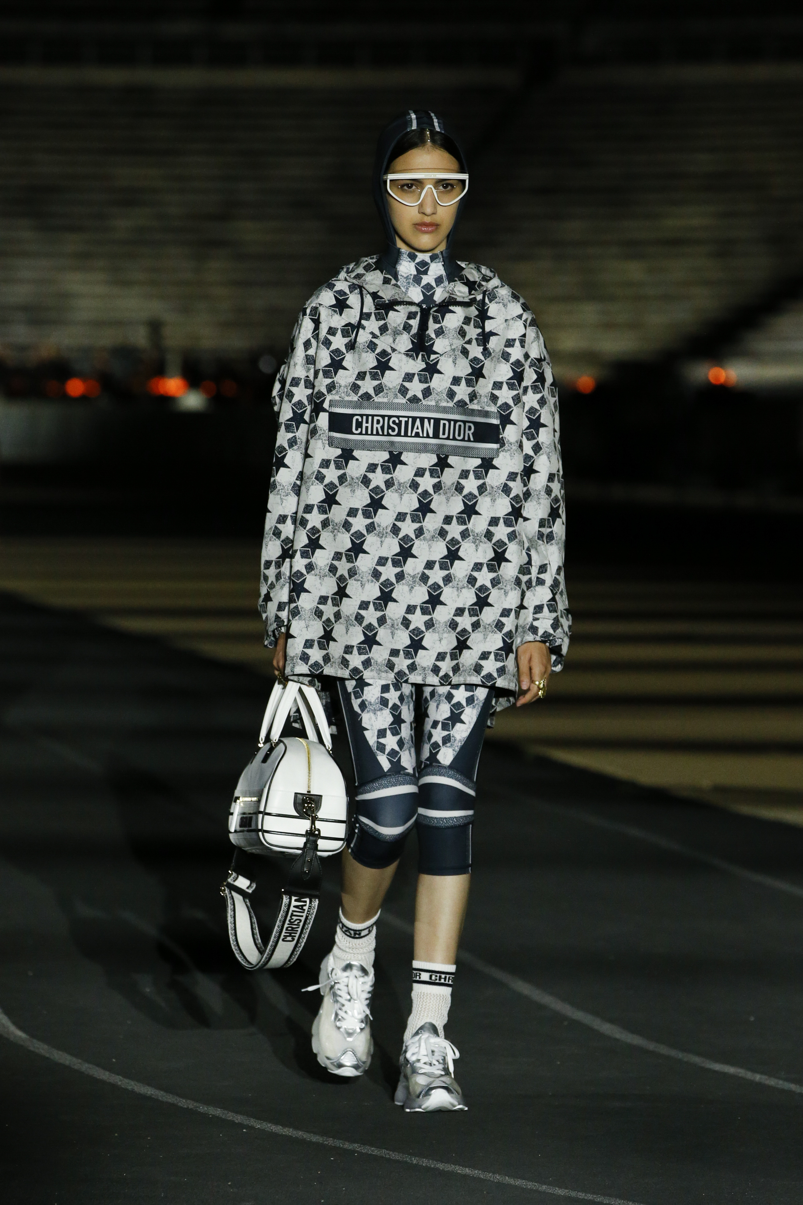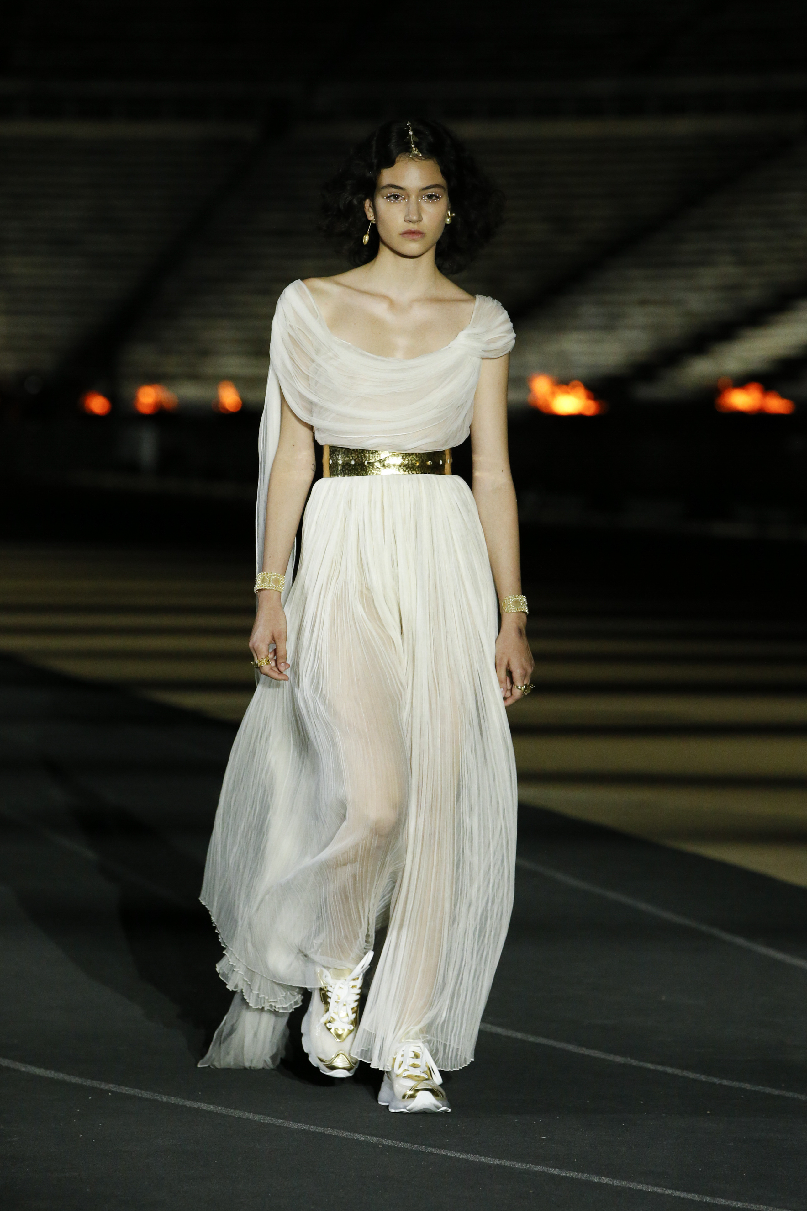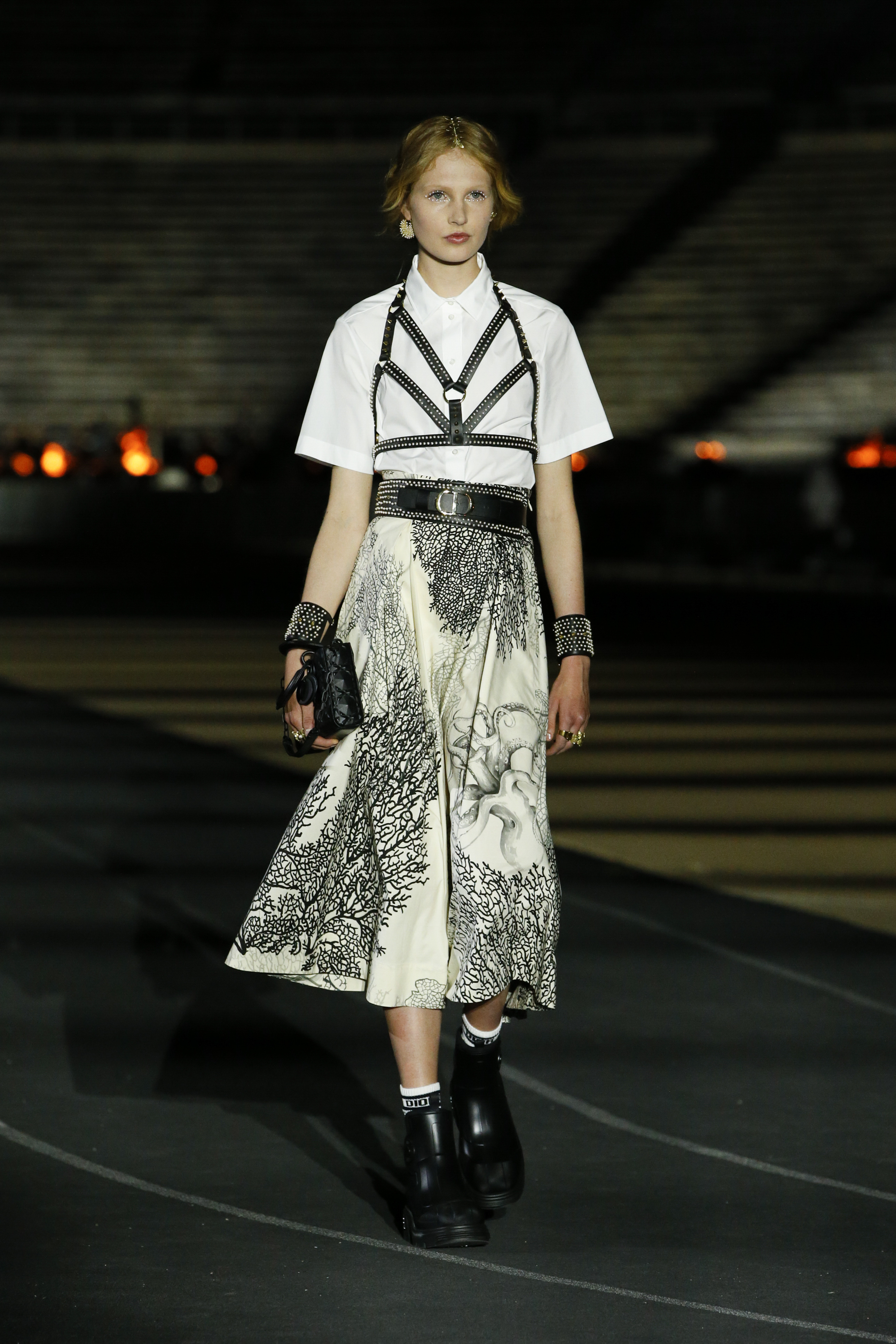 La capacità straordinaria di Maria Grazia Chiuri di aprire gli archivi Dior e ogni volta dargli una nuova interpretazione, è il fil rouge anche di questa Dior Cruise SS 22. Ancora una volta infatti, i codici stilistici del brand si sono legati indissolubilmente a costumi e tradizioni antiche, portando alto con orgoglio il baluardo dei brand che dei propri valori ne hanno fatto un tratto distintivo. Dior torna ad Atene, lì dove era stato Monsieur Christian 70 anni fa. La collezione SS 22 non ha nulla a che fare, però , con il classicismo ma anzi si reinventa in un ottica moderna con vestiti fluidi e oversize su sneakers o stivali in gomma. La stampa Dior Oblique adorna total look contemporanei fatti di bomber, biker shorts e felpe oversize. Lo sport è un tema ricorrente e richiama all’Antica Grecia nella sua accezione più reale, traducendosi in cuffie da nuotatore, accappatoi, top sportivi e borsoni. A contrastare la natura sportiva, arrivano in passerella inedite dee in abiti semi trasparenti bianchi o in paillettes argentate, riprendendo nelle forme i personaggi che hanno scritto la storia della cultura europea, come l’abito a cigno ispirato a Leda madre di Elena.