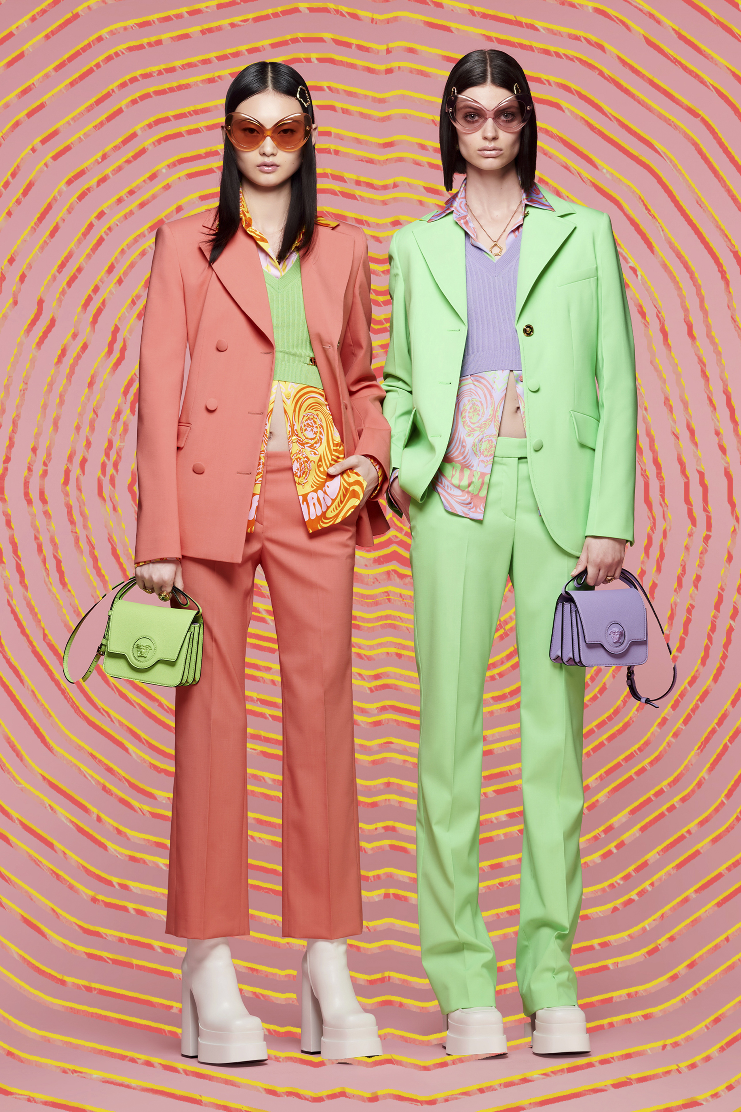 La collezione Resort SS22 di Versace è un racconto romantico e pop di quelli che sono i tratti che hanno reso il brand un’icona. Materiali, texture, forme e stampe iconiche si reinventano in chiave contemporanea. Mini dress in tweed total black o tartan vengono resi audaci da catene, tacchi platform e copricapo in stile bandana, abiti in vinile mostrano le forme di una femminilità contemporanea, fresca e giovane che punta su look monocolor e accessori. La catena ritorna come motivo di stampe su abiti dai toni pastello e ultra sexy, in pendant con tailleur maschili dal taglio dritto