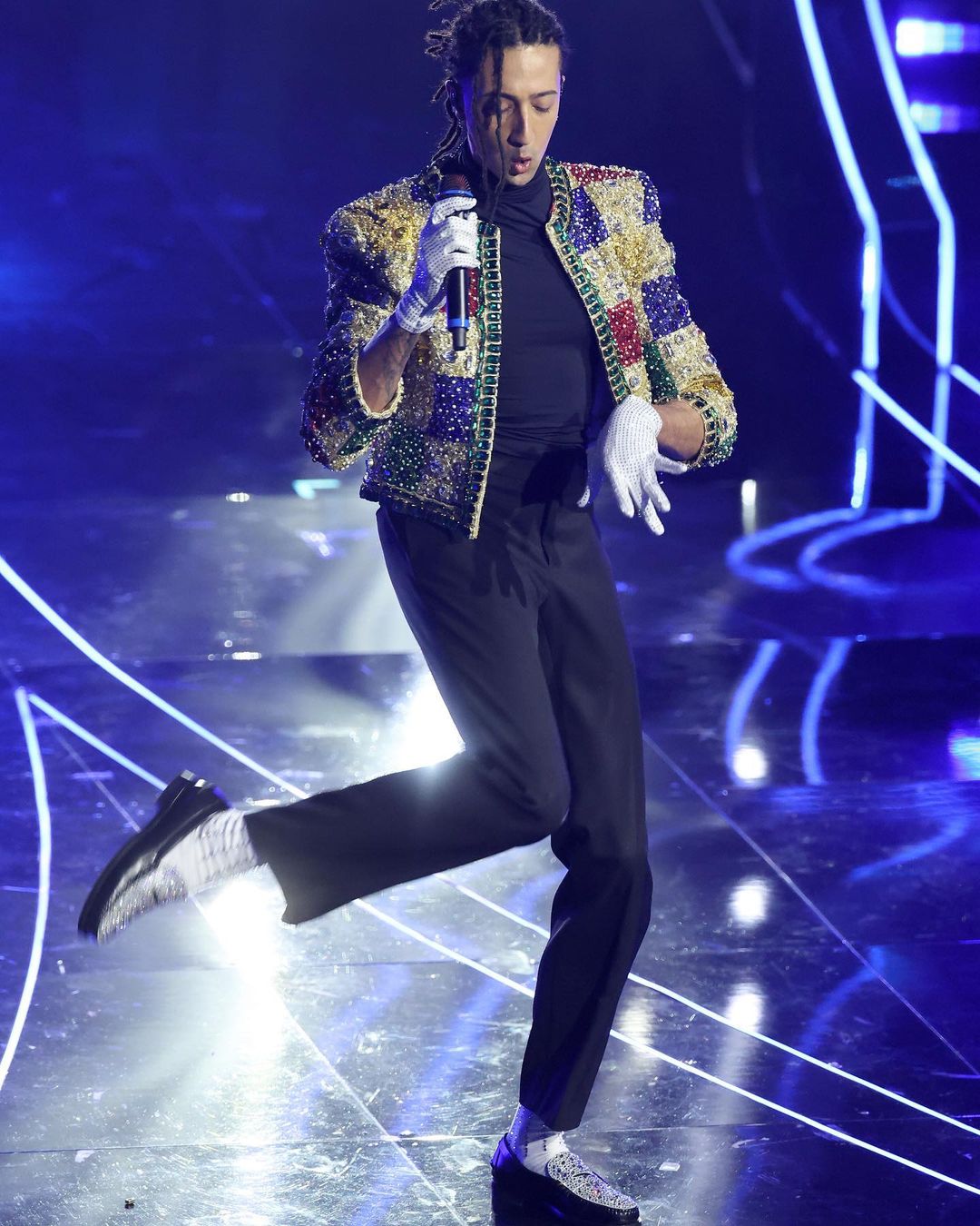Ma il momento che ha lasciato tutti senza fiato è stato il tributo di Ghali a Michael Jackson. Con un look di Casablanca ispirato al Re del Pop, il rapper ha portato sul palco tutto il fascino e la magia dell’indimenticabile artista, completandolo con delle scarpe custom-made di Sebago, cristallizzate con Swarovski.