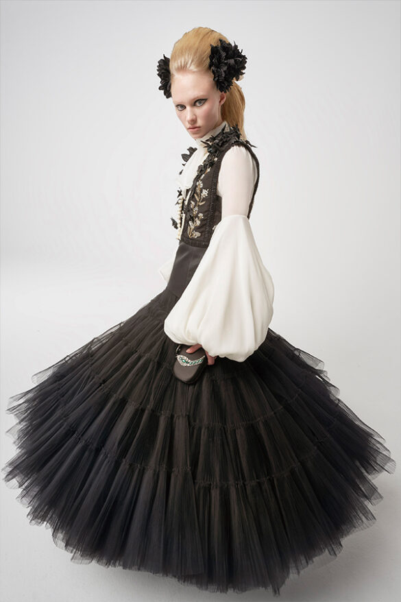 Un romanticismo che non finisce mai per diventare stucchevole, quello di Giambattista Valli che interpreta la collezione Haute Couture SS 21 come un’inno alla femminilità e ai colori pastello. Il tulle, protagonista iconico della collezione, si mescola a petali di fiori e colori tenui come il bianco, il rosa e il giallo, per dare vita ad abiti magnificamente idealisti. Un richiamo allo stile sfarzoso degli Dei dell’Olimpo, concretizzato in copri capo di fiori e abiti alla greca composti di ampie gonne, ruches, volant lavorati a mano e fiocchi e piume a impreziosire. Un sogno che ci rende sentimentali e atto ad infondere saggezza e eleganza rimandando fedele all’idea che la moda, specialmente quella Haute, debba farsi ambasciatore di un’etica imprescindibilmente buona ed elegante.
